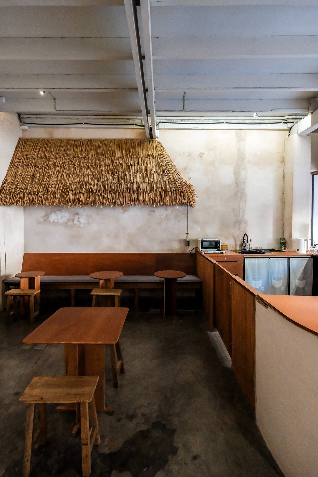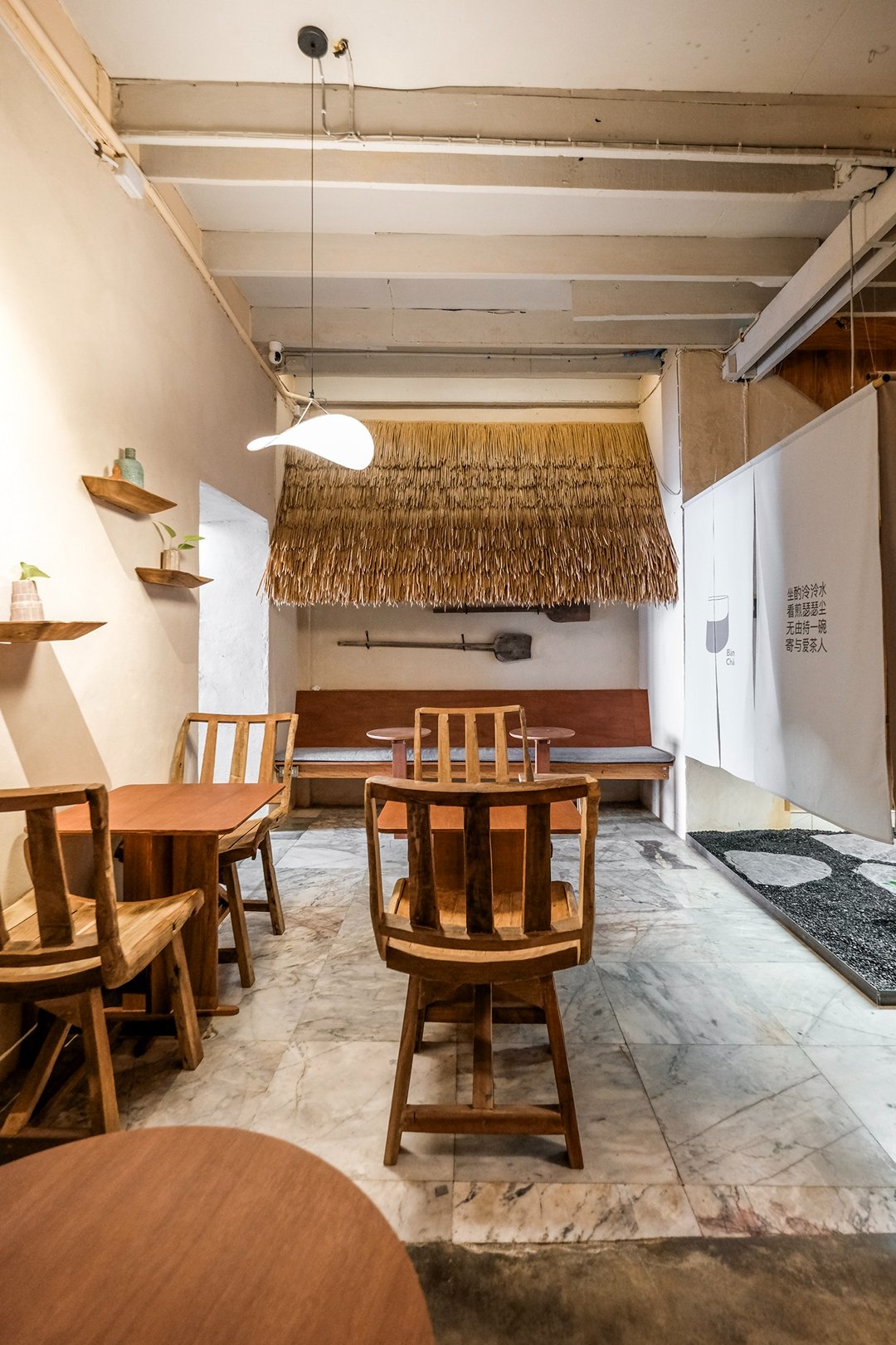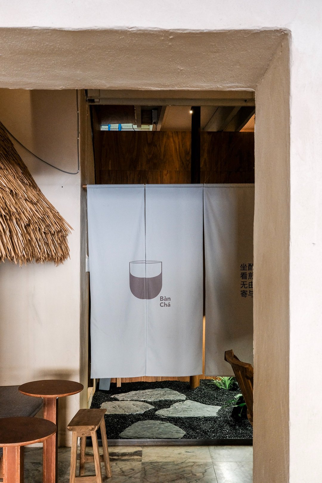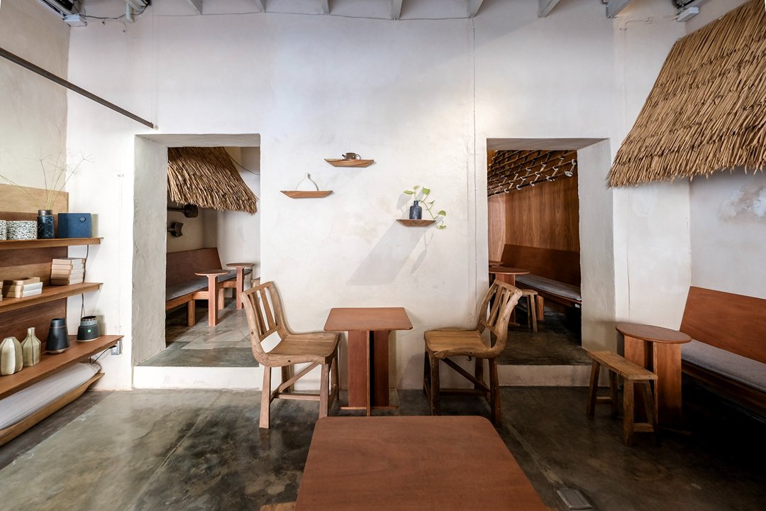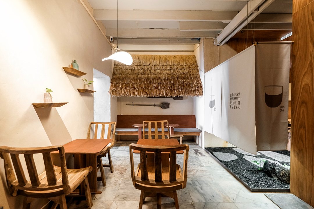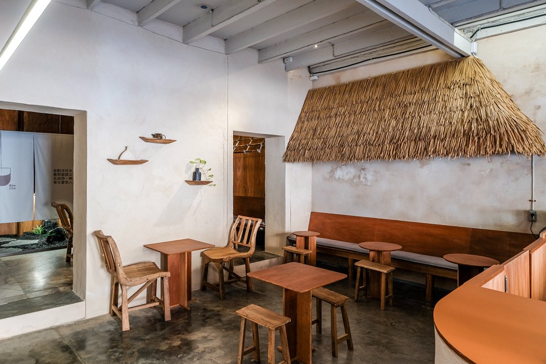 ตัวร้านซ่อนตัวอยู่ริมถนนเฟื่องนคร บรรยากาศค่อนข้างสงบ หยิบเอาองค์ประกอบพื้นถิ่นมาผสมกับความโมเดิร์น ทั้งโทนสี earth tone, เฟอร์นิเจอร์ไม้ และโครงสร้างหลังคามุงจากที่ทำให้มู้ดมีความ japandi เบาๆ