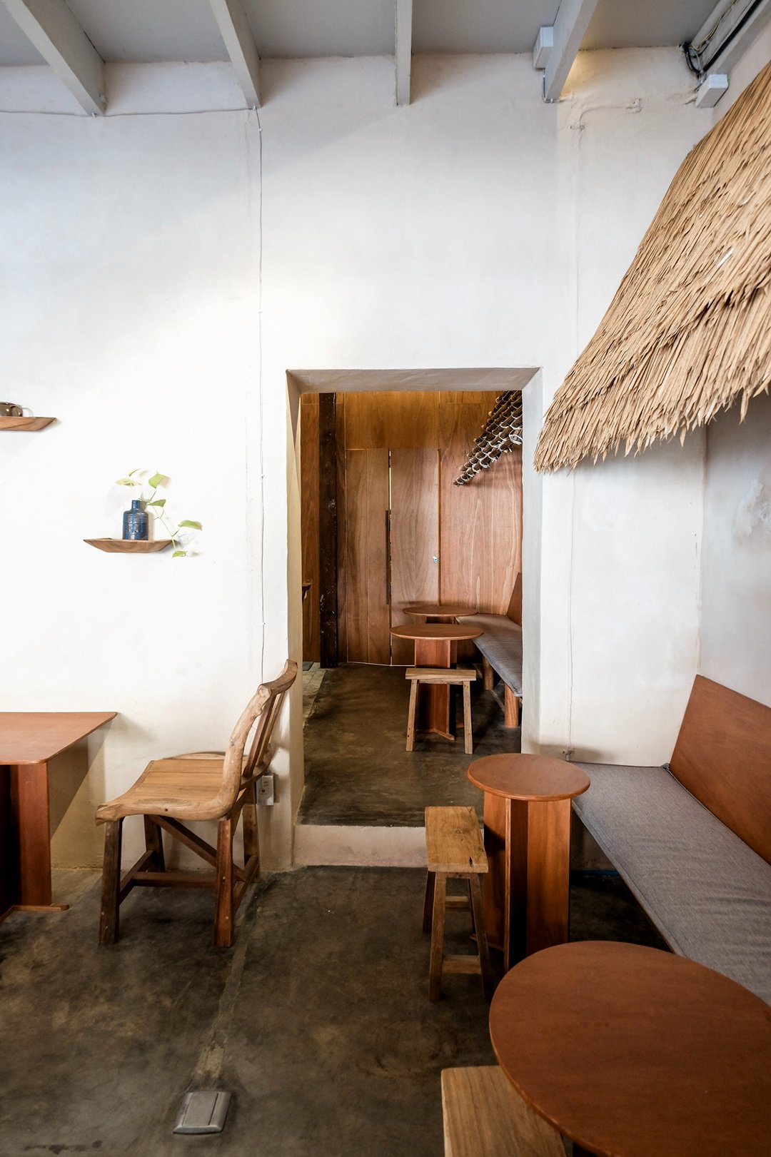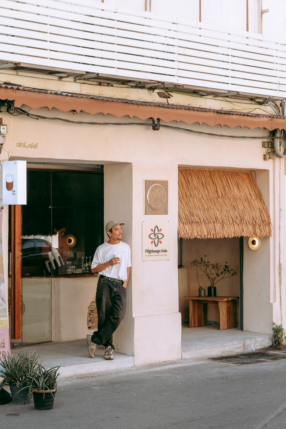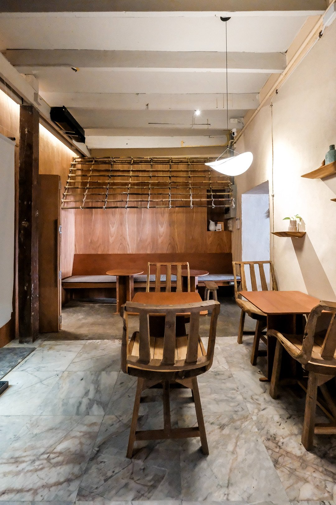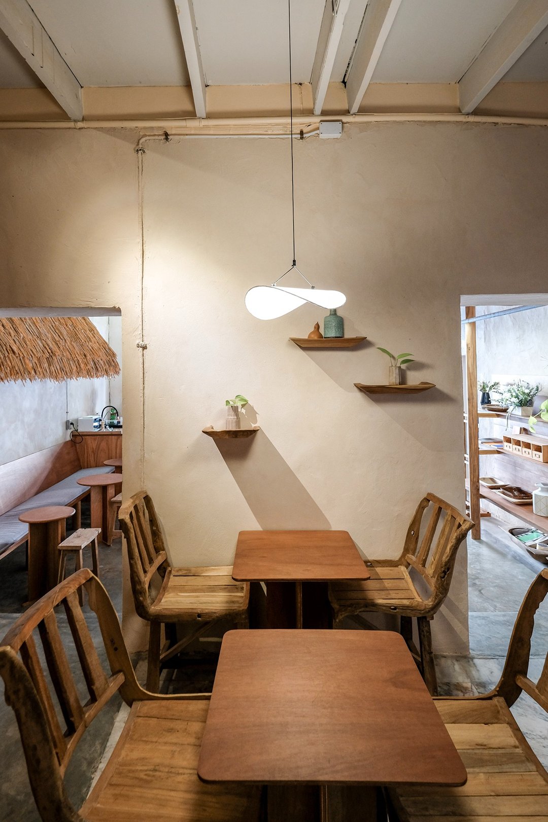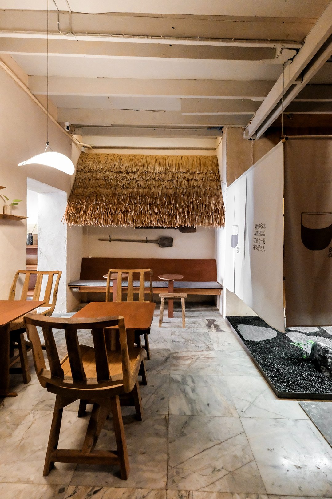 ตัวร้านซ่อนตัวอยู่ริมถนนเฟื่องนคร บรรยากาศค่อนข้างสงบ หยิบเอาองค์ประกอบพื้นถิ่นมาผสมกับความโมเดิร์น ทั้งโทนสี earth tone, เฟอร์นิเจอร์ไม้ และโครงสร้างหลังคามุงจากที่ทำให้มู้ดมีความ japandi เบาๆ