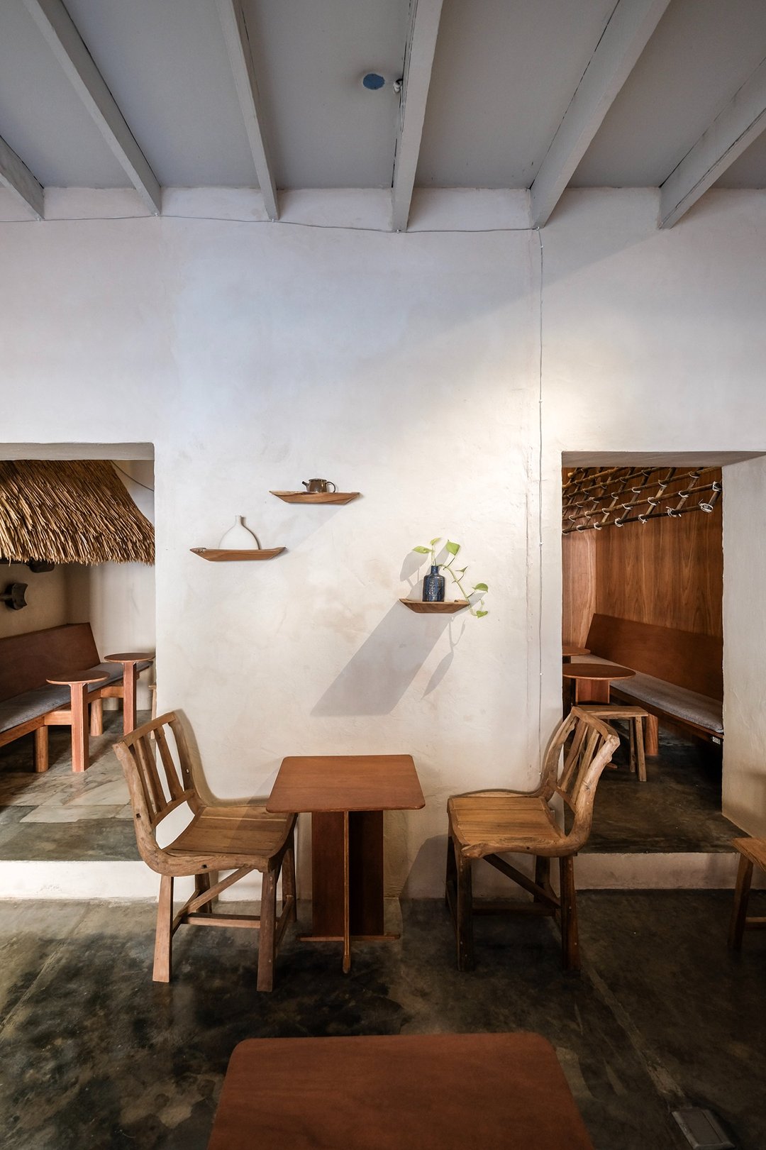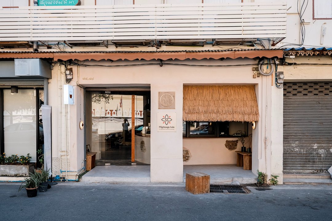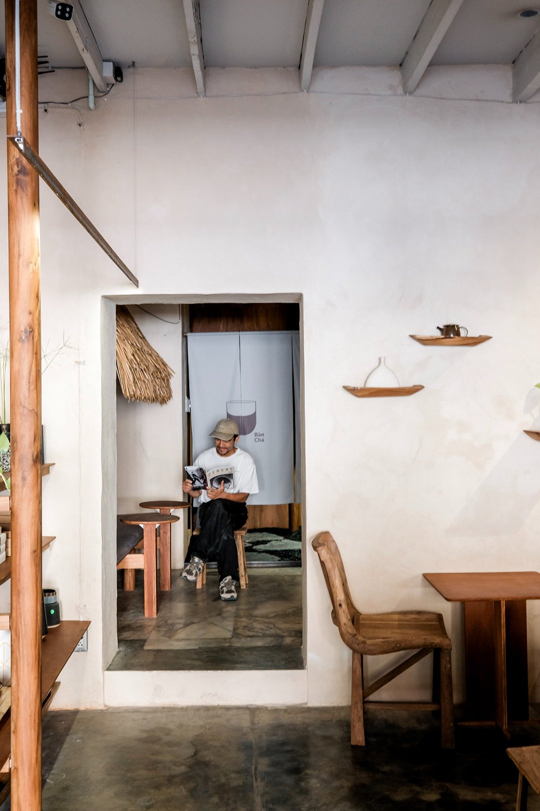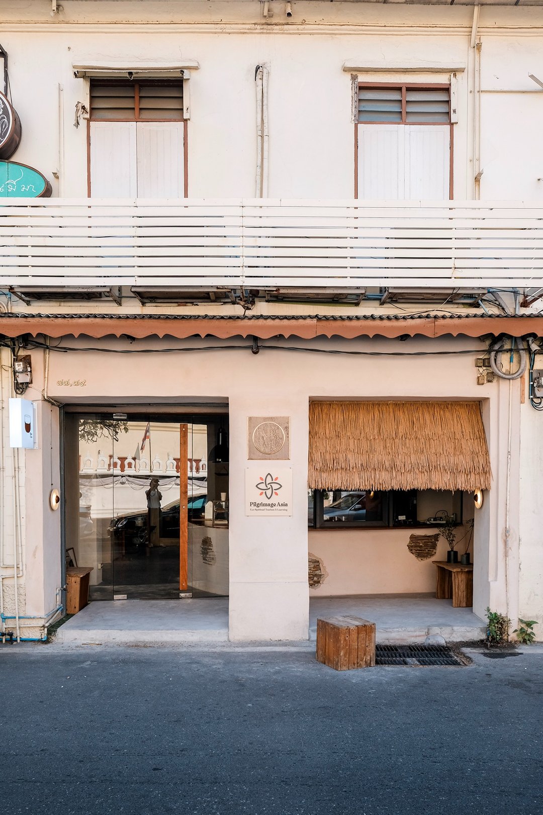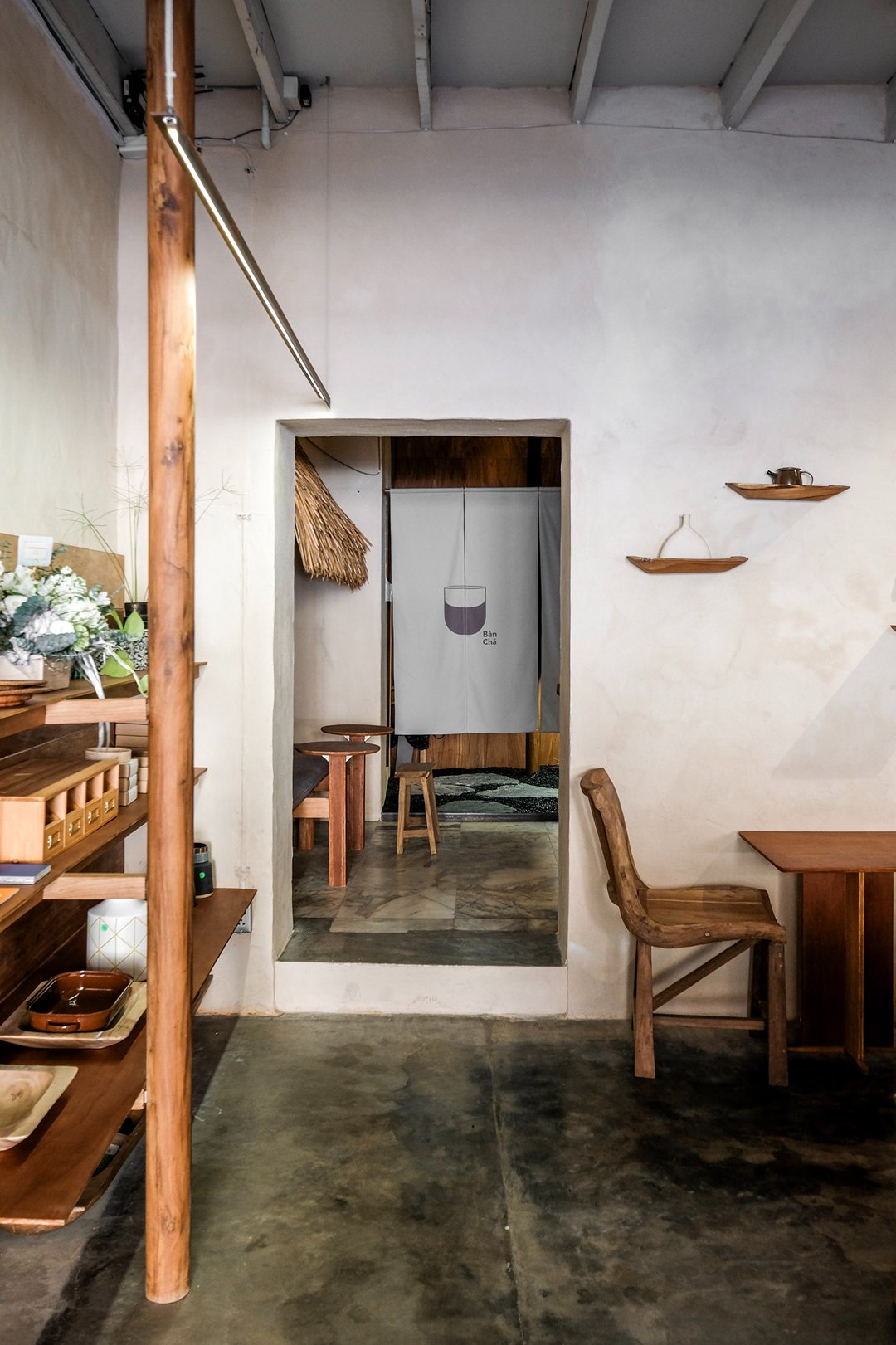 ตัวร้านซ่อนตัวอยู่ริมถนนเฟื่องนคร บรรยากาศค่อนข้างสงบ หยิบเอาองค์ประกอบพื้นถิ่นมาผสมกับความโมเดิร์น ทั้งโทนสี earth tone, เฟอร์นิเจอร์ไม้ และโครงสร้างหลังคามุงจากที่ทำให้มู้ดมีความ japandi เบาๆ