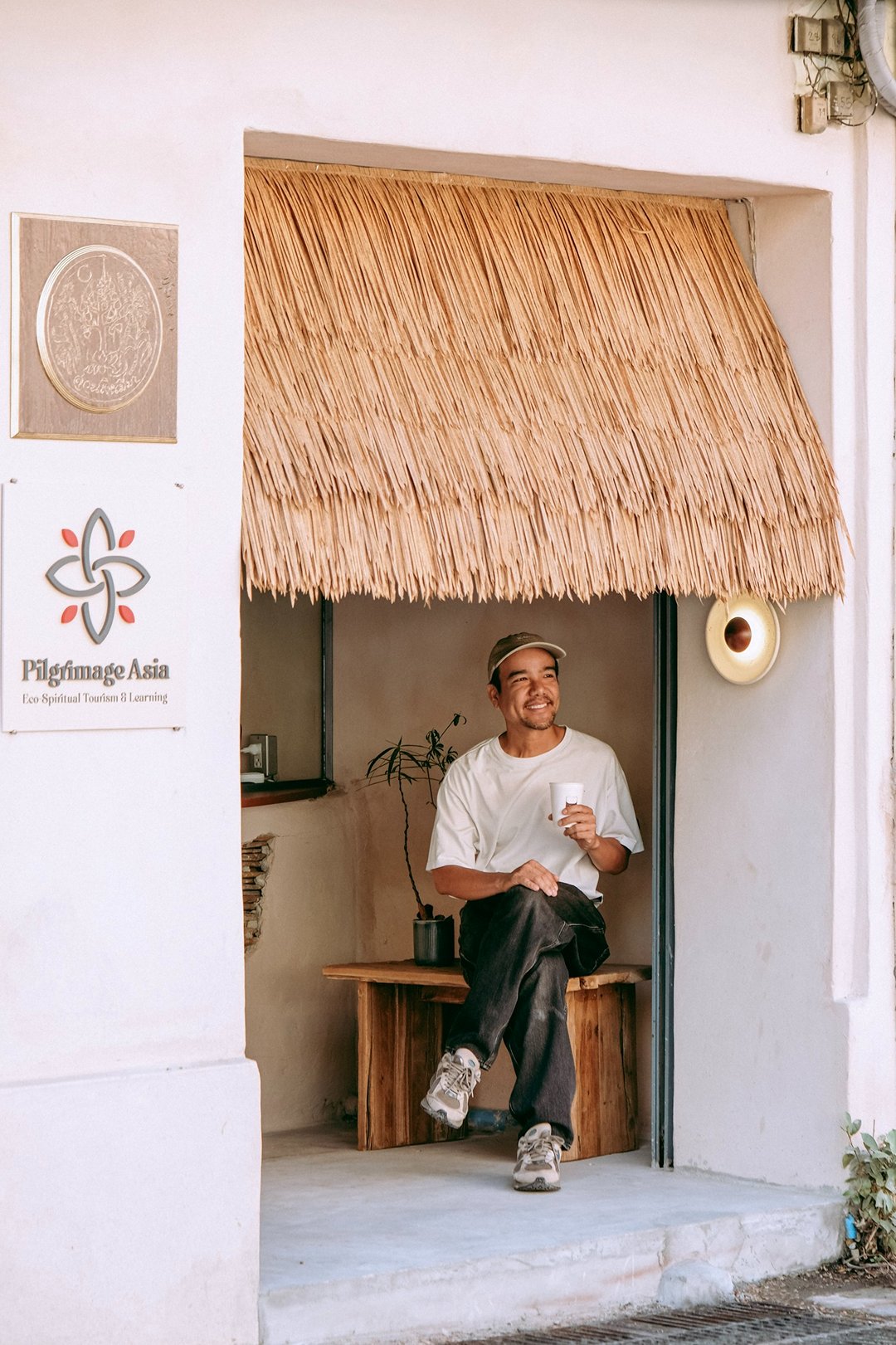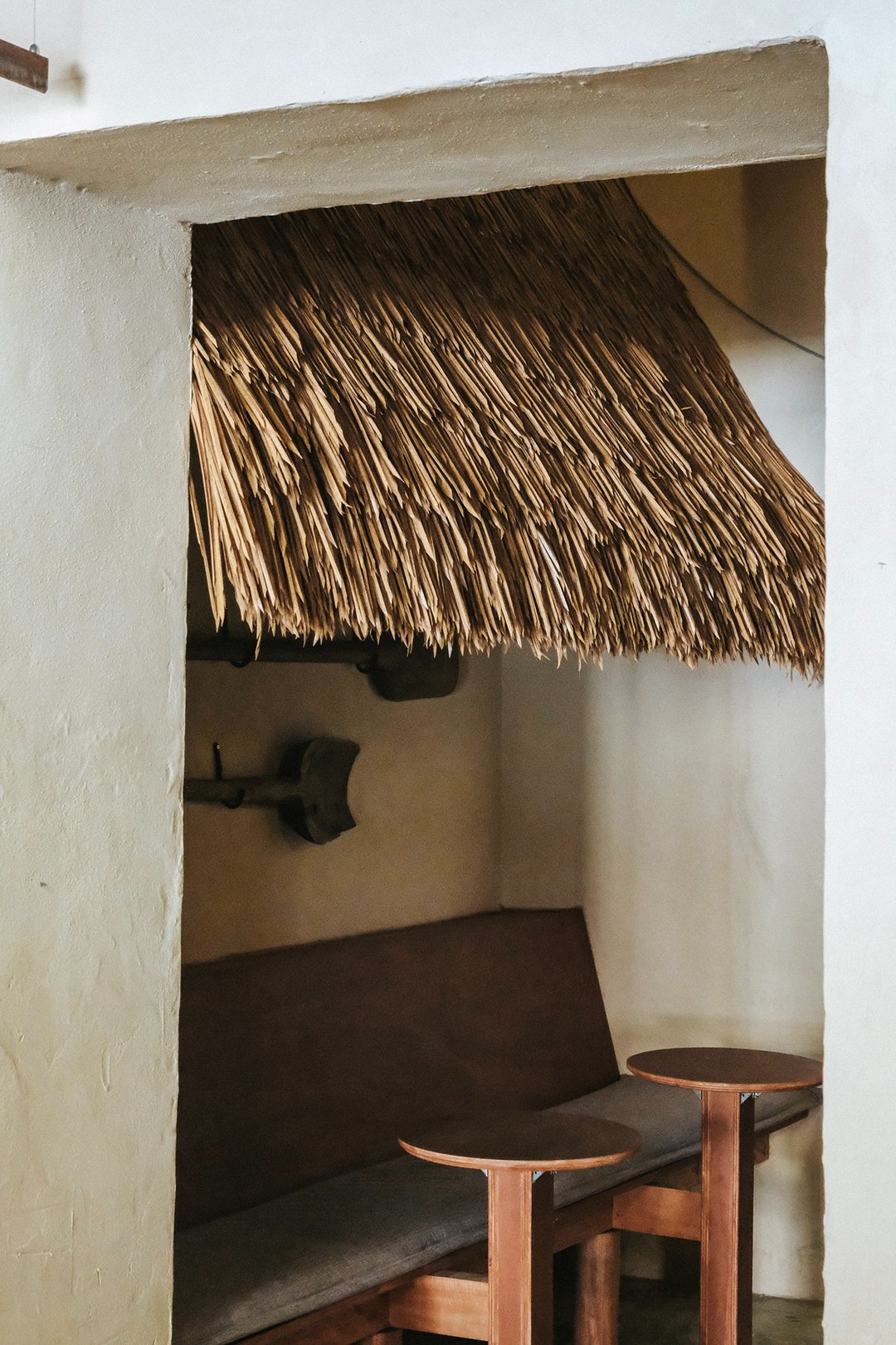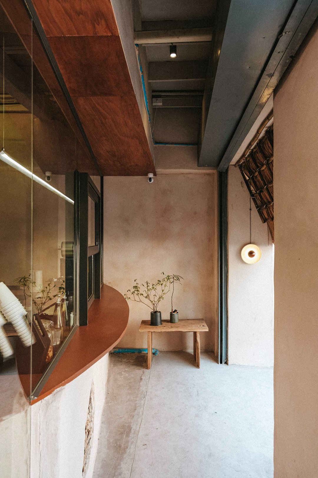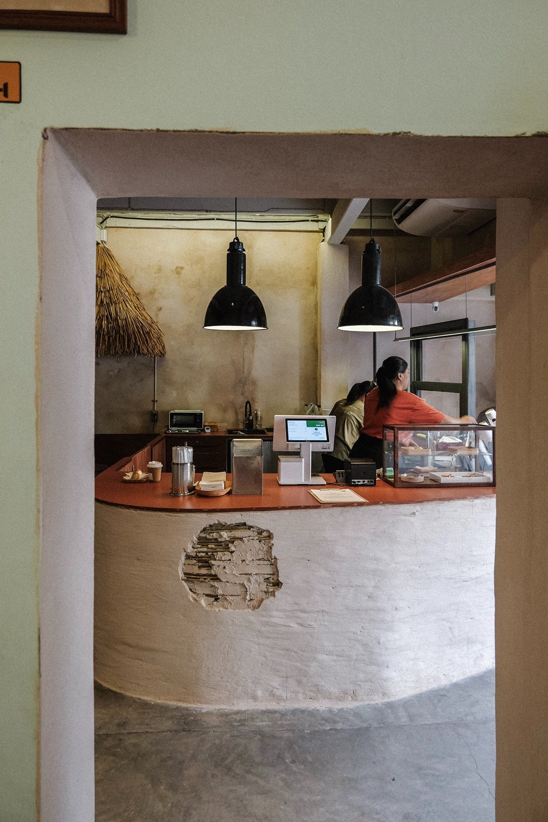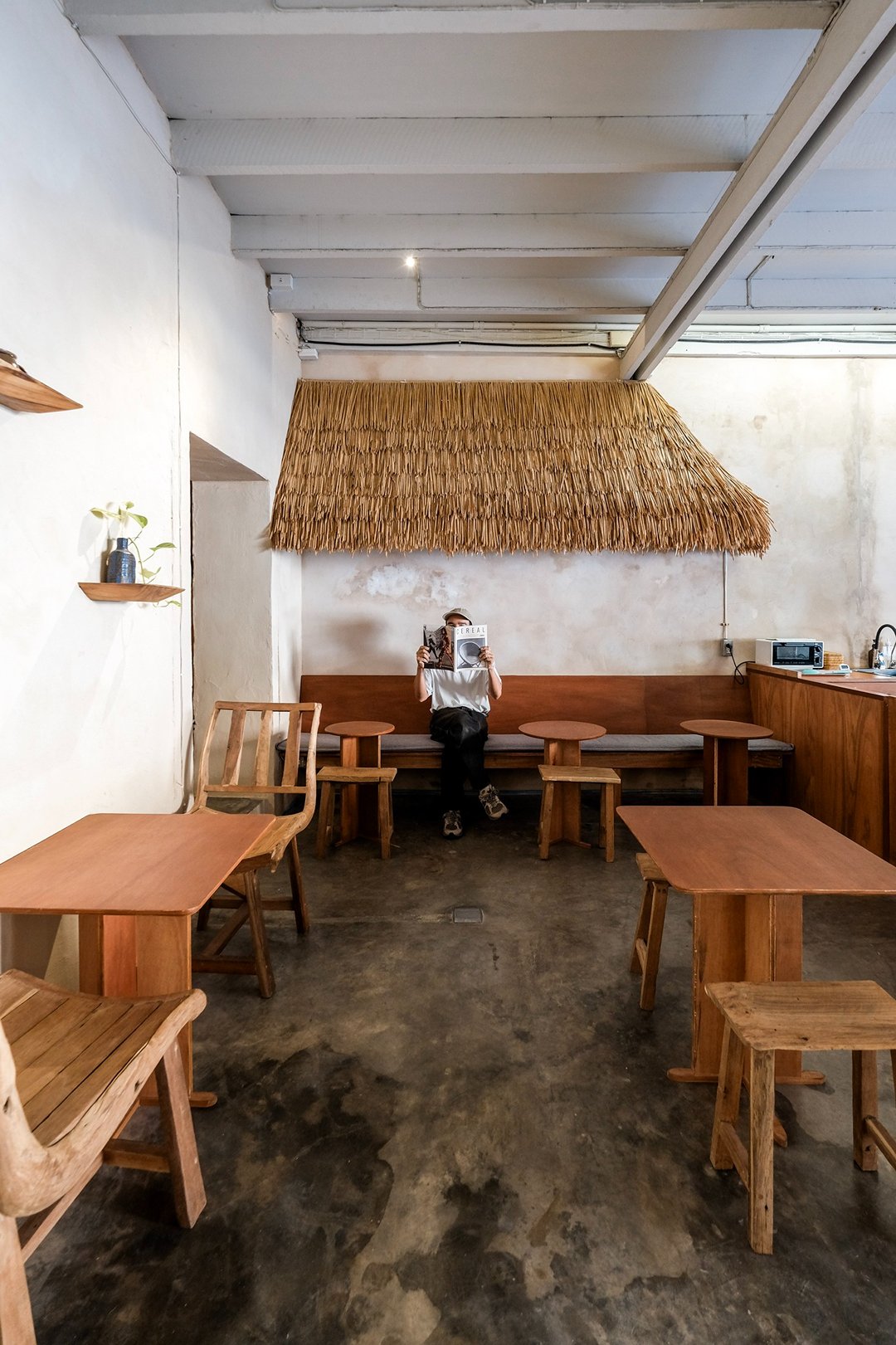 ตัวร้านซ่อนตัวอยู่ริมถนนเฟื่องนคร บรรยากาศค่อนข้างสงบ หยิบเอาองค์ประกอบพื้นถิ่นมาผสมกับความโมเดิร์น ทั้งโทนสี earth tone, เฟอร์นิเจอร์ไม้ และโครงสร้างหลังคามุงจากที่ทำให้มู้ดมีความ japandi เบาๆ