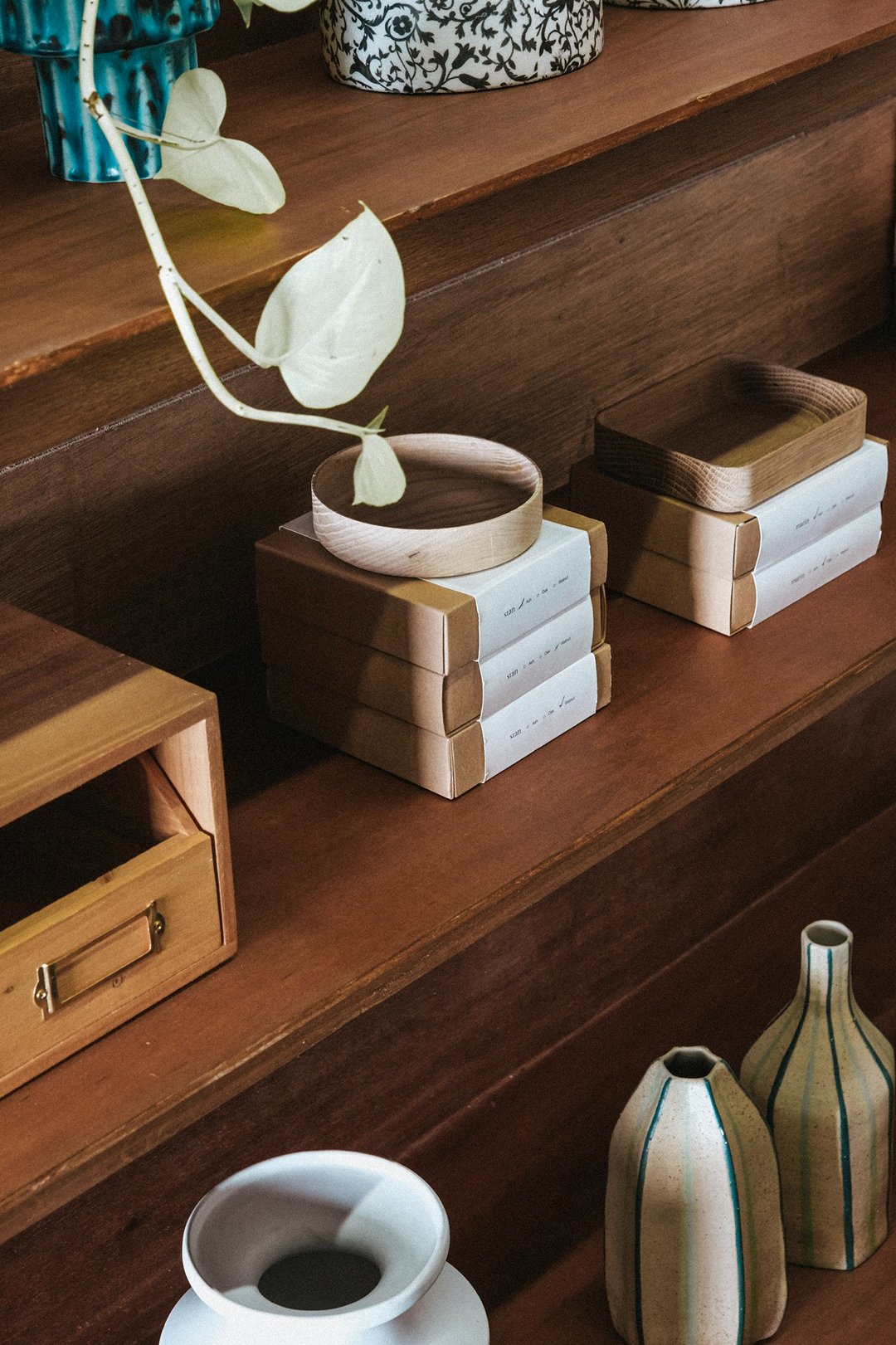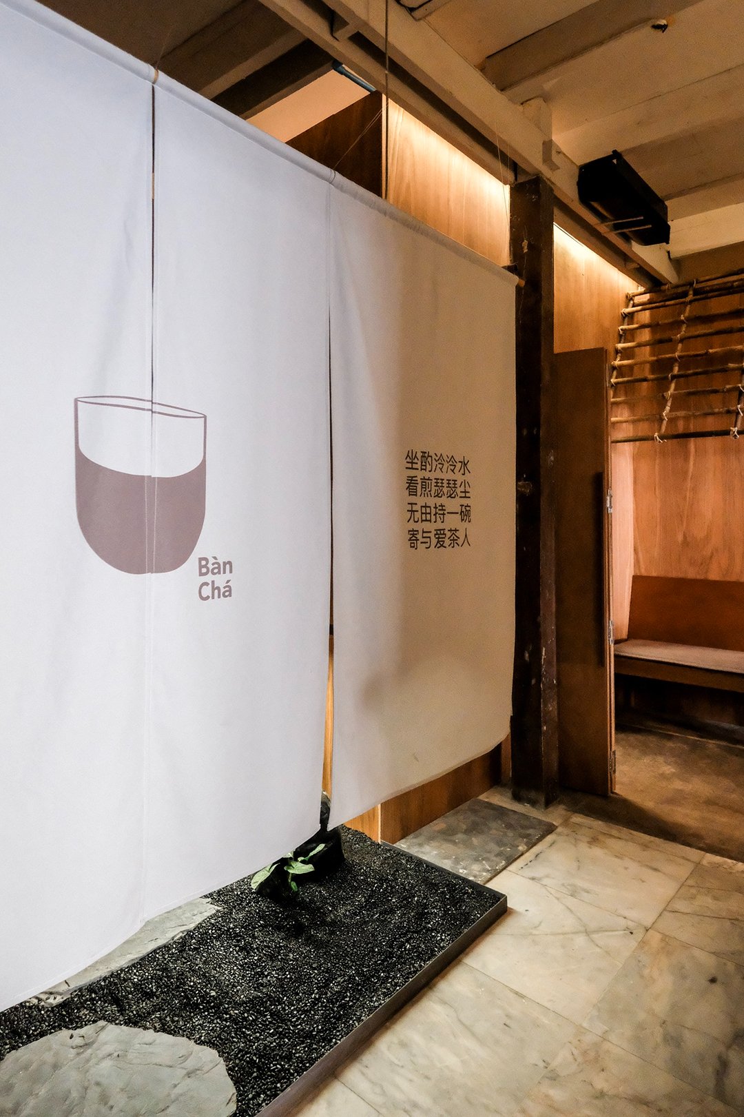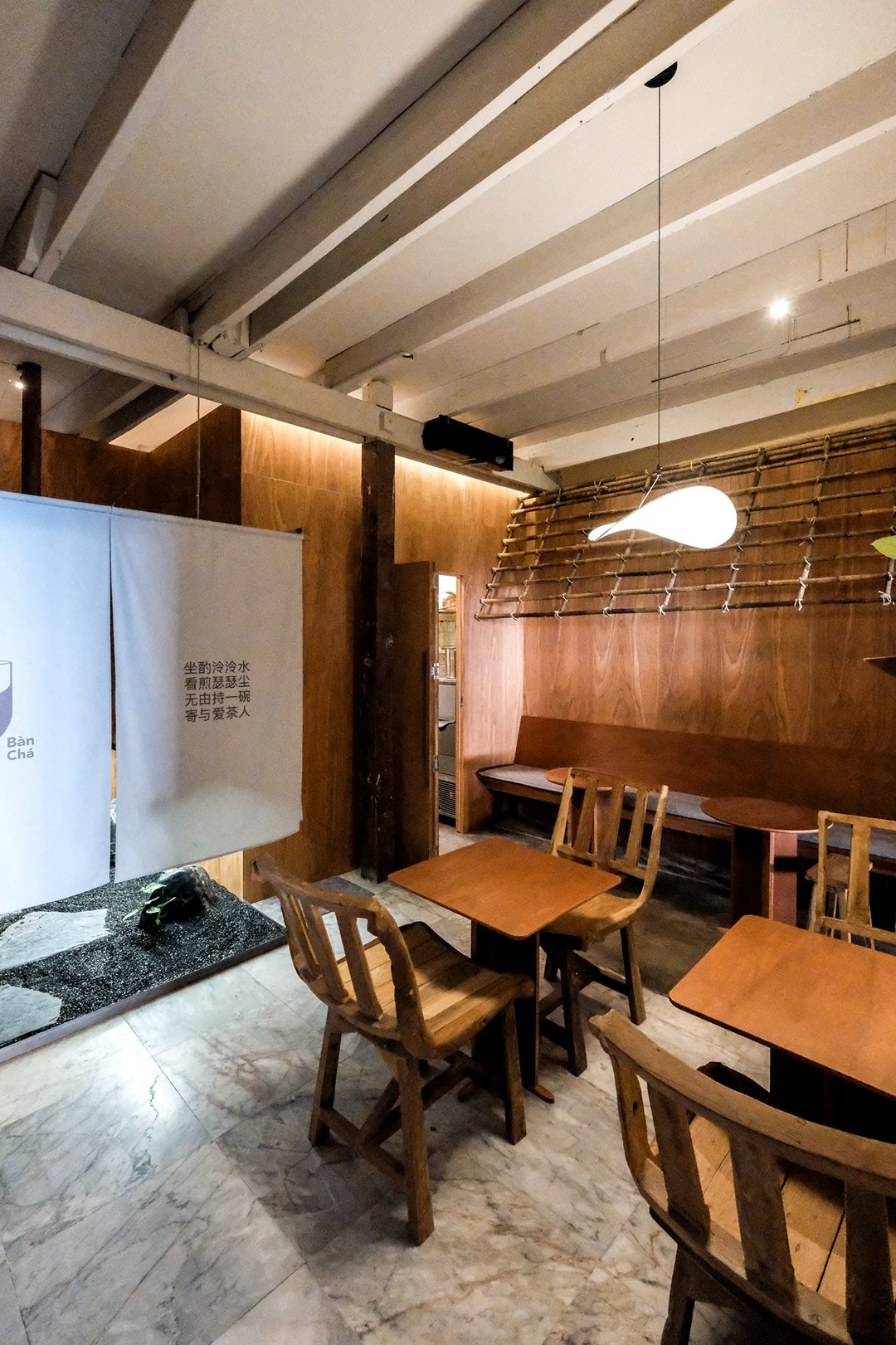 ภายในร้านค่อนข้างแสงน้อย ตัดกับแสงแดดสว่างด้านนอก ทำให้บรรยากาศดูนิ่ง สงบและผ่อนคลาย เหมาะกับการมานั่งจิบชามาก ๆ เหมือนตั้งใจให้ที่นี่เป็น calm space เล็ก ๆ กลางเมือง