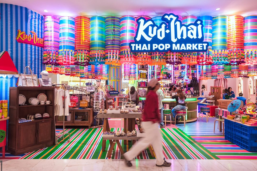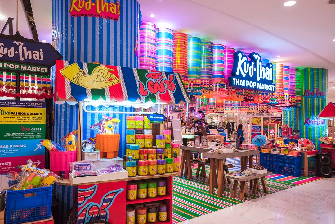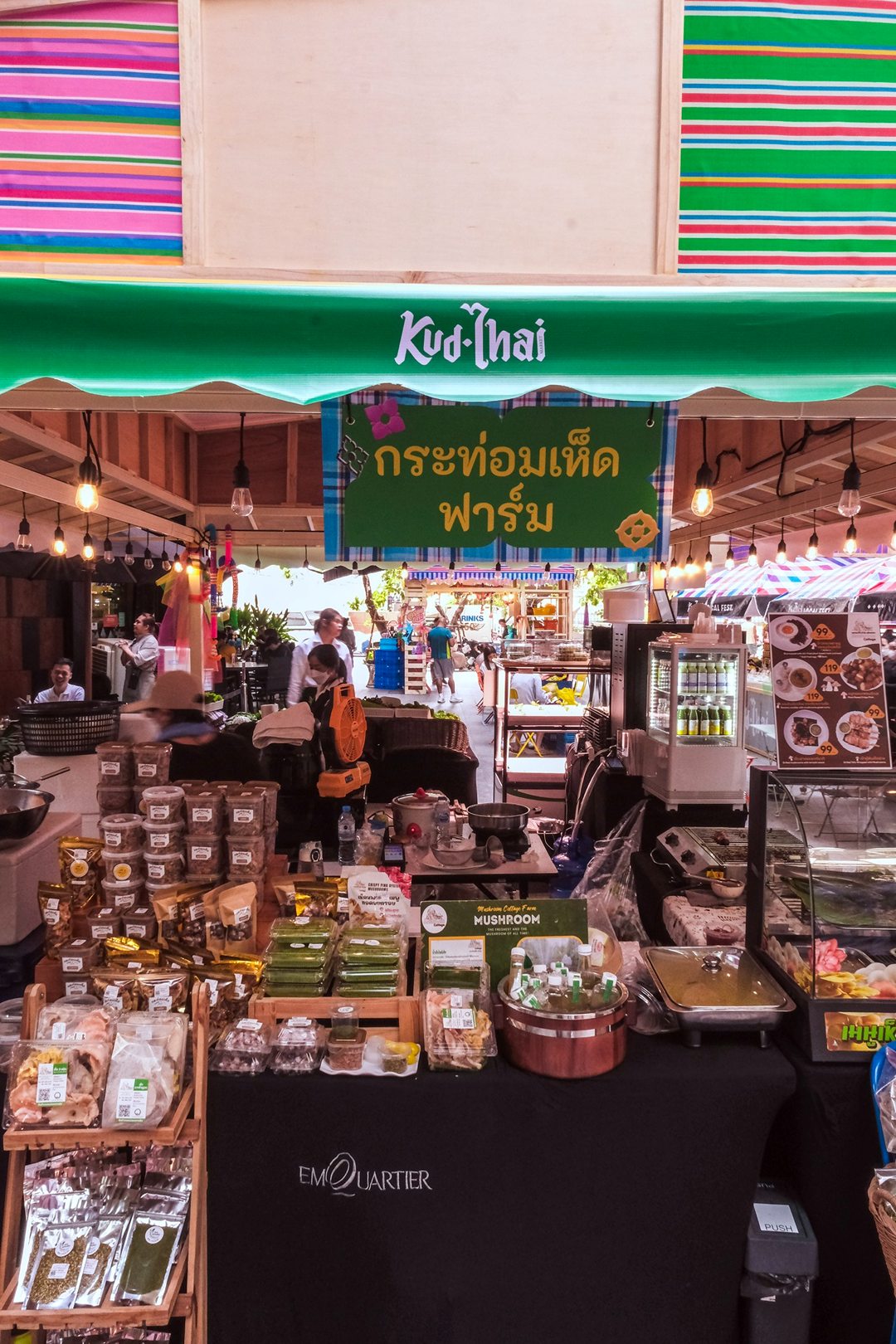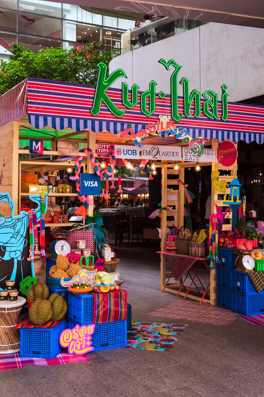 คึกคักมาก วันนี้ Tongpaii พาทุกคนมาเดินชิลล์ KUD THAI : ONLY THAILAND’S BEST & BEYOND เพลิดเพลินไปกับการช๊อปปิ้งชิมเมนูอาหารร้านเด็ด ร้านดังกว่า 40 ร้านกันฉ่ำๆ ถึง 3 ศูนย์การค้า ที่ EM District ไทย Festival Destination ทั้ง EMQUARTIER, EMPORIUM และ EMSPHERE ที่จัดเต็มไปด้วยสีสันและกลิ่นอายของวัฒนธรรมไทยความเป็นไทย และยังมีความสนุกสนานกับ กิจกรรมอื่นๆ อีกมากมายในคอนเซ็ปท์ โอนลี่ อิน ไทย แลนด์ ที่คัดมาให้แล้วว่าเด็ดจากทั่วฟ้าเมืองไทยแน่นอนครับ ภายในงานเราจะได้เห็นความสวยงามสุดจึ้งจาก Decoration สุดคูลในแบบไทยๆผ่านสีสันของฝ้าใบและลวดลายของถุงผ้ากระสอบ สีรุ้ง ที่คุ้นเคย ถูกนำมาครีเอทเป็นลายแพตเวิร์กแบบใหม่แบบสับ ห้อยเป็นระย้านับ 1000 ชิ้น พร้อมประดับประดาด้วยไฟนีออนสีสันจี๊ดจ๊าด เปลี่ยนมู้ดบรรยากาศให้กลายเป็นแลนด์มาร์คสุดเก๋ขนาดใหญ่ที่ เอ็ม มาร์เก็ต ฮอลล์ ที่รับรองว่าใครเห็นก็ต้องร้องว้าว! กับความเป็นไทยจากภูมิปัญญาชุมชนสู่ใจกลางเมืองในหลากหลายมิติได้อย่างสง่างามนี้แน่นอน ทั้งการเลือกใช้วัสดุอย่างชาญฉลาด การสนับสนุนงานช่างฝีมือของชุมชน และงานหัตถกรรมที่ประณีต โดดเด่นสะดุดตา และโคตรจะจึ้งที่สุดในย่านสุขุมวิท
