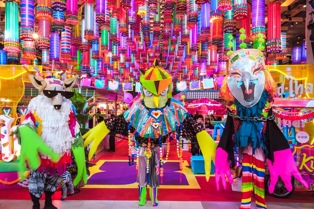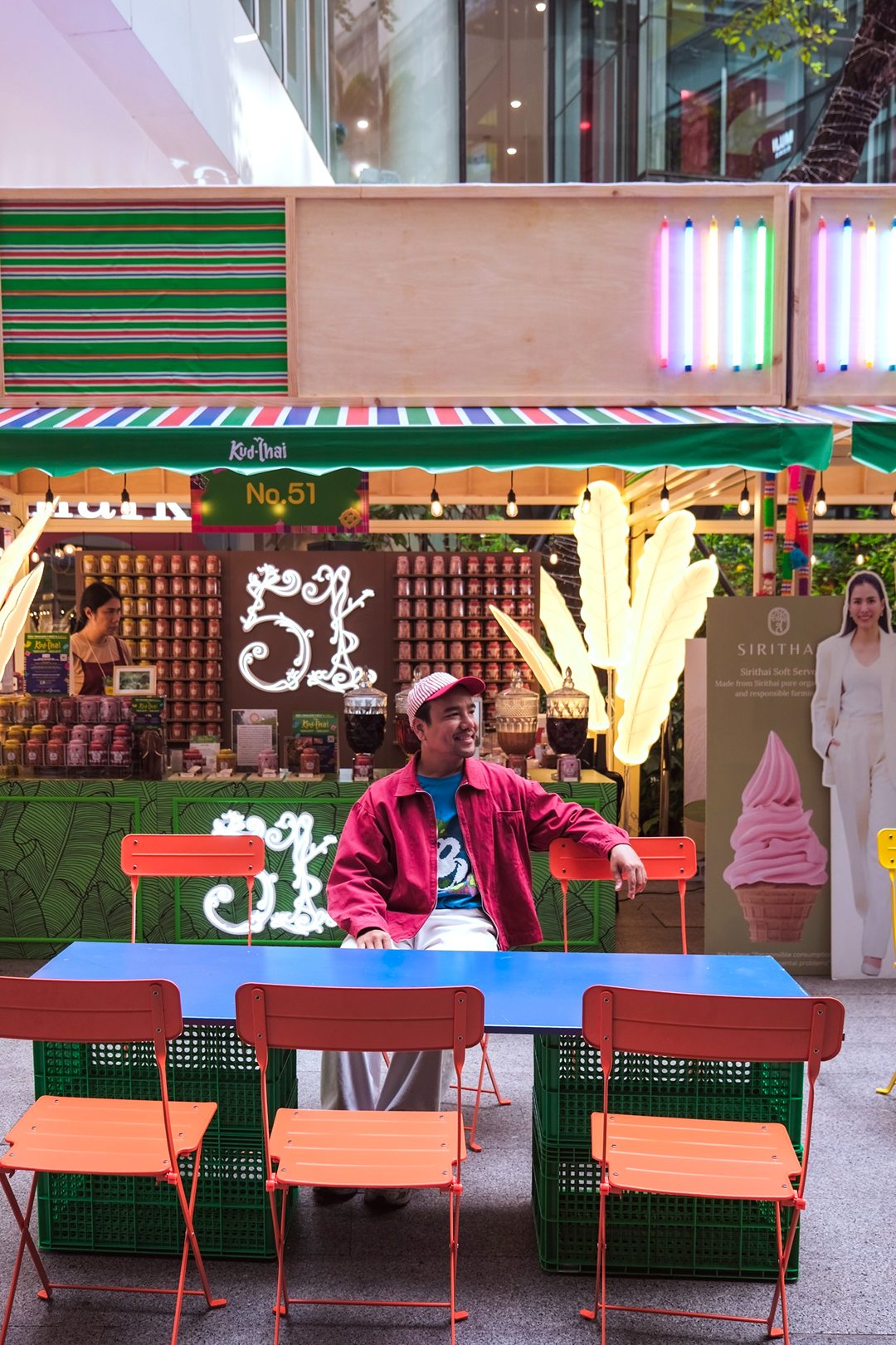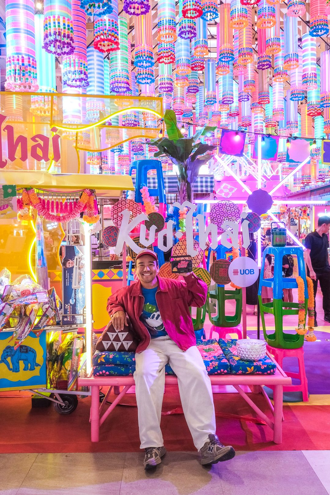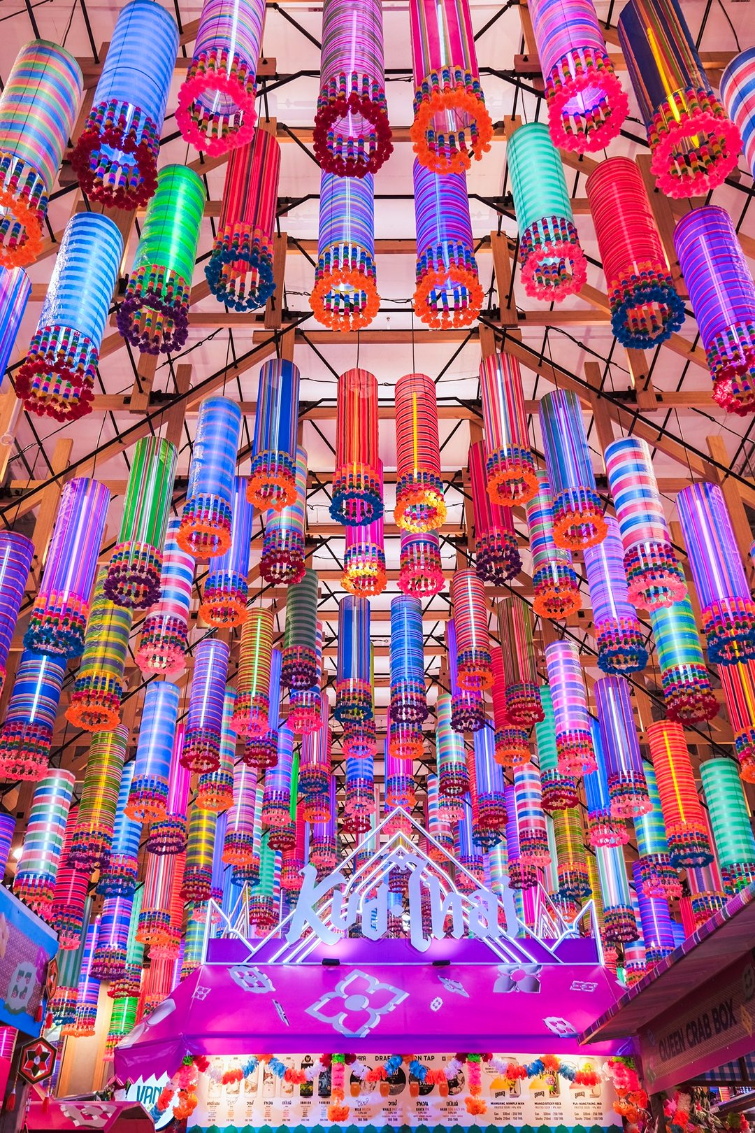 คึกคักมาก วันนี้ Tongpaii พาทุกคนมาเดินชิลล์ KUD THAI : ONLY THAILAND’S BEST & BEYOND เพลิดเพลินไปกับการช๊อปปิ้งชิมเมนูอาหารร้านเด็ด ร้านดังกว่า 40 ร้านกันฉ่ำๆ ถึง 3 ศูนย์การค้า ที่ EM District ไทย Festival Destination ทั้ง EMQUARTIER, EMPORIUM และ EMSPHERE ที่จัดเต็มไปด้วยสีสันและกลิ่นอายของวัฒนธรรมไทยความเป็นไทย และยังมีความสนุกสนานกับ กิจกรรมอื่นๆ อีกมากมายในคอนเซ็ปท์ โอนลี่ อิน ไทย แลนด์ ที่คัดมาให้แล้วว่าเด็ดจากทั่วฟ้าเมืองไทยแน่นอนครับ ภายในงานเราจะได้เห็นความสวยงามสุดจึ้งจาก Decoration สุดคูลในแบบไทยๆผ่านสีสันของฝ้าใบและลวดลายของถุงผ้ากระสอบ สีรุ้ง ที่คุ้นเคย ถูกนำมาครีเอทเป็นลายแพตเวิร์กแบบใหม่แบบสับ ห้อยเป็นระย้านับ 1000 ชิ้น พร้อมประดับประดาด้วยไฟนีออนสีสันจี๊ดจ๊าด เปลี่ยนมู้ดบรรยากาศให้กลายเป็นแลนด์มาร์คสุดเก๋ขนาดใหญ่ที่ เอ็ม มาร์เก็ต ฮอลล์ ที่รับรองว่าใครเห็นก็ต้องร้องว้าว! กับความเป็นไทยจากภูมิปัญญาชุมชนสู่ใจกลางเมืองในหลากหลายมิติได้อย่างสง่างามนี้แน่นอน ทั้งการเลือกใช้วัสดุอย่างชาญฉลาด การสนับสนุนงานช่างฝีมือของชุมชน และงานหัตถกรรมที่ประณีต โดดเด่นสะดุดตา และโคตรจะจึ้งที่สุดในย่านสุขุมวิท