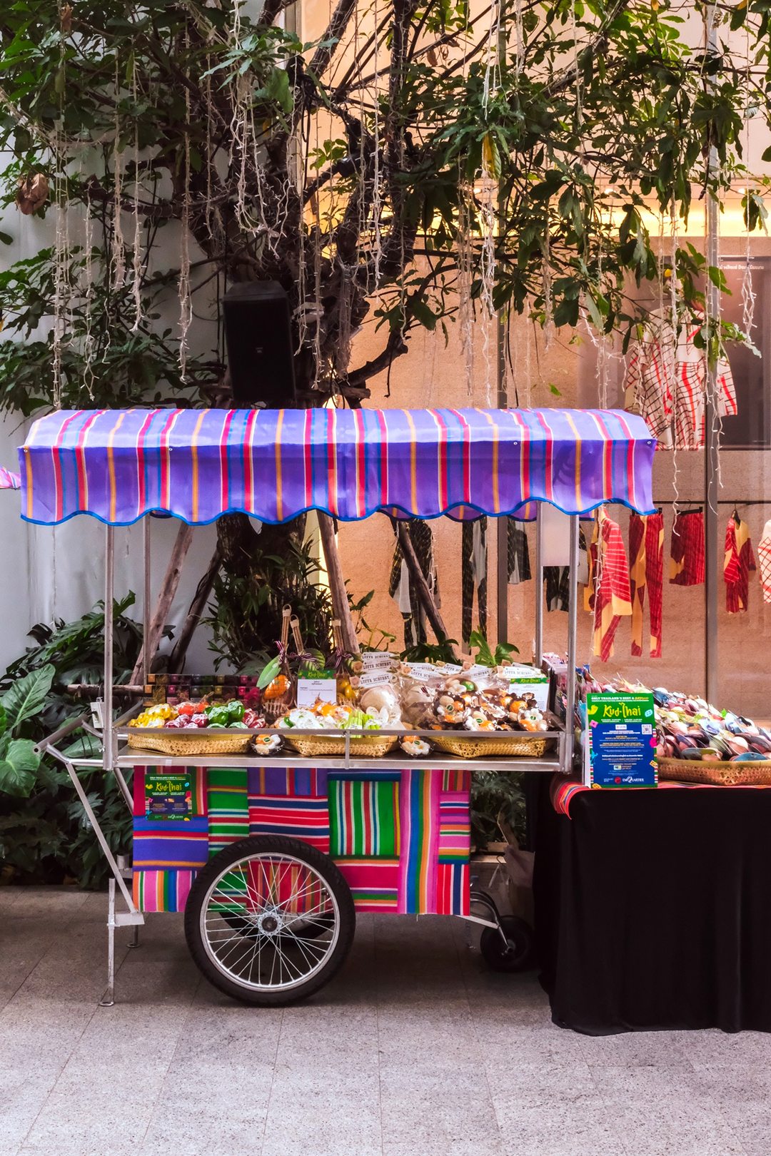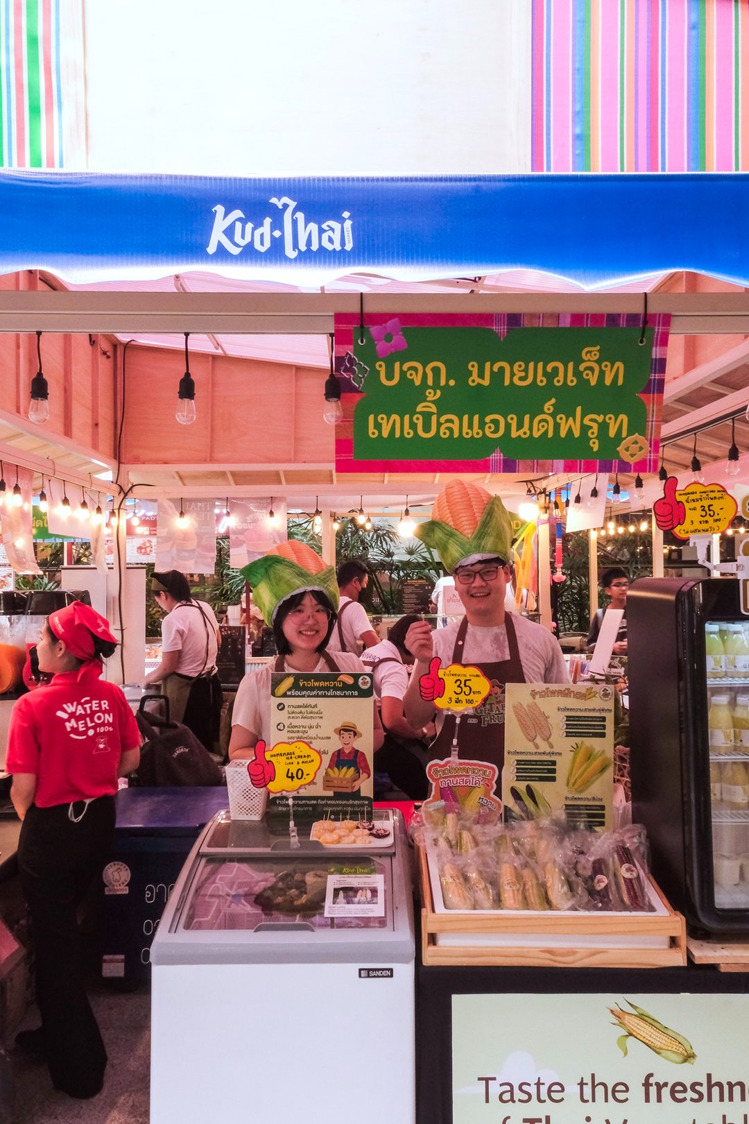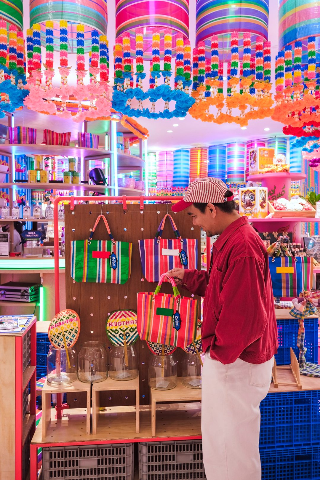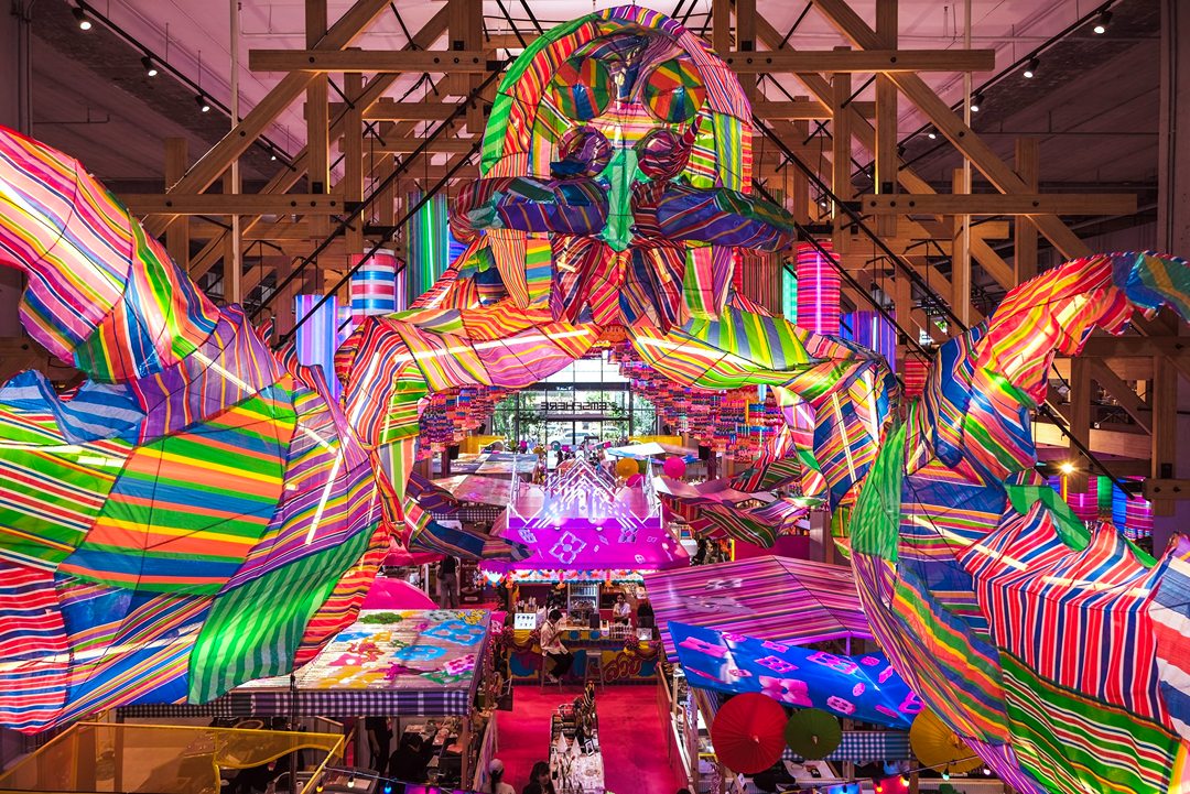 คึกคักมาก วันนี้ Tongpaii พาทุกคนมาเดินชิลล์ KUD THAI : ONLY THAILAND’S BEST & BEYOND เพลิดเพลินไปกับการช๊อปปิ้งชิมเมนูอาหารร้านเด็ด ร้านดังกว่า 40 ร้านกันฉ่ำๆ ถึง 3 ศูนย์การค้า ที่ EM District ไทย Festival Destination ทั้ง EMQUARTIER, EMPORIUM และ EMSPHERE ที่จัดเต็มไปด้วยสีสันและกลิ่นอายของวัฒนธรรมไทยความเป็นไทย และยังมีความสนุกสนานกับ กิจกรรมอื่นๆ อีกมากมายในคอนเซ็ปท์ โอนลี่ อิน ไทย แลนด์ ที่คัดมาให้แล้วว่าเด็ดจากทั่วฟ้าเมืองไทยแน่นอนครับ ภายในงานเราจะได้เห็นความสวยงามสุดจึ้งจาก Decoration สุดคูลในแบบไทยๆผ่านสีสันของฝ้าใบและลวดลายของถุงผ้ากระสอบ สีรุ้ง ที่คุ้นเคย ถูกนำมาครีเอทเป็นลายแพตเวิร์กแบบใหม่แบบสับ ห้อยเป็นระย้านับ 1000 ชิ้น พร้อมประดับประดาด้วยไฟนีออนสีสันจี๊ดจ๊าด เปลี่ยนมู้ดบรรยากาศให้กลายเป็นแลนด์มาร์คสุดเก๋ขนาดใหญ่ที่ เอ็ม มาร์เก็ต ฮอลล์ ที่รับรองว่าใครเห็นก็ต้องร้องว้าว! กับความเป็นไทยจากภูมิปัญญาชุมชนสู่ใจกลางเมืองในหลากหลายมิติได้อย่างสง่างามนี้แน่นอน ทั้งการเลือกใช้วัสดุอย่างชาญฉลาด การสนับสนุนงานช่างฝีมือของชุมชน และงานหัตถกรรมที่ประณีต โดดเด่นสะดุดตา และโคตรจะจึ้งที่สุดในย่านสุขุมวิท