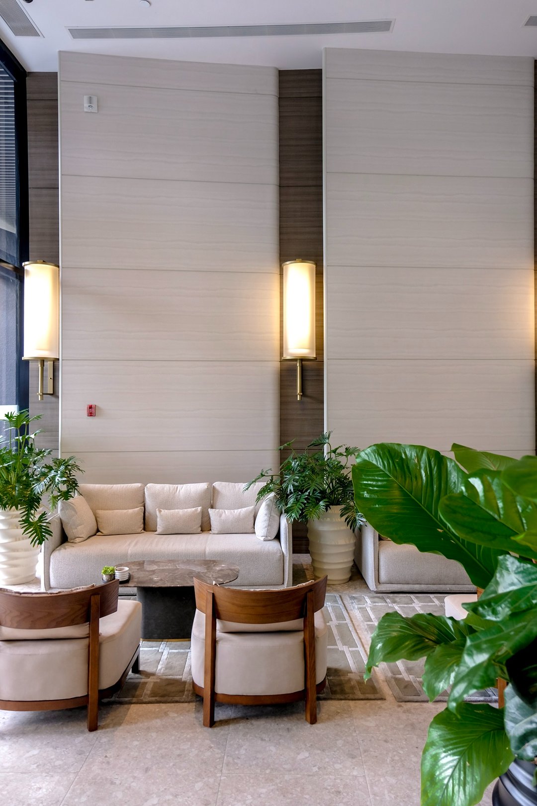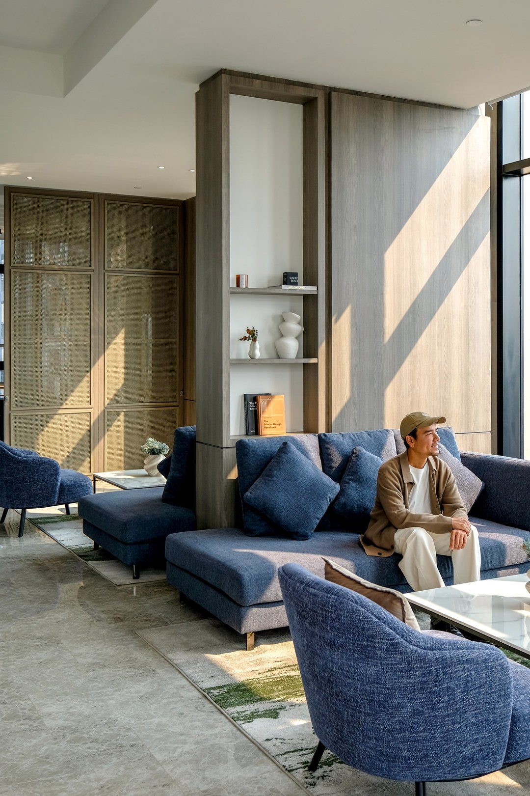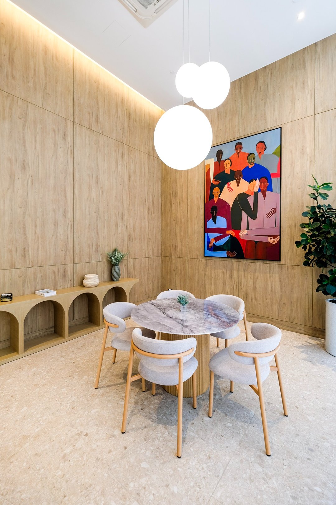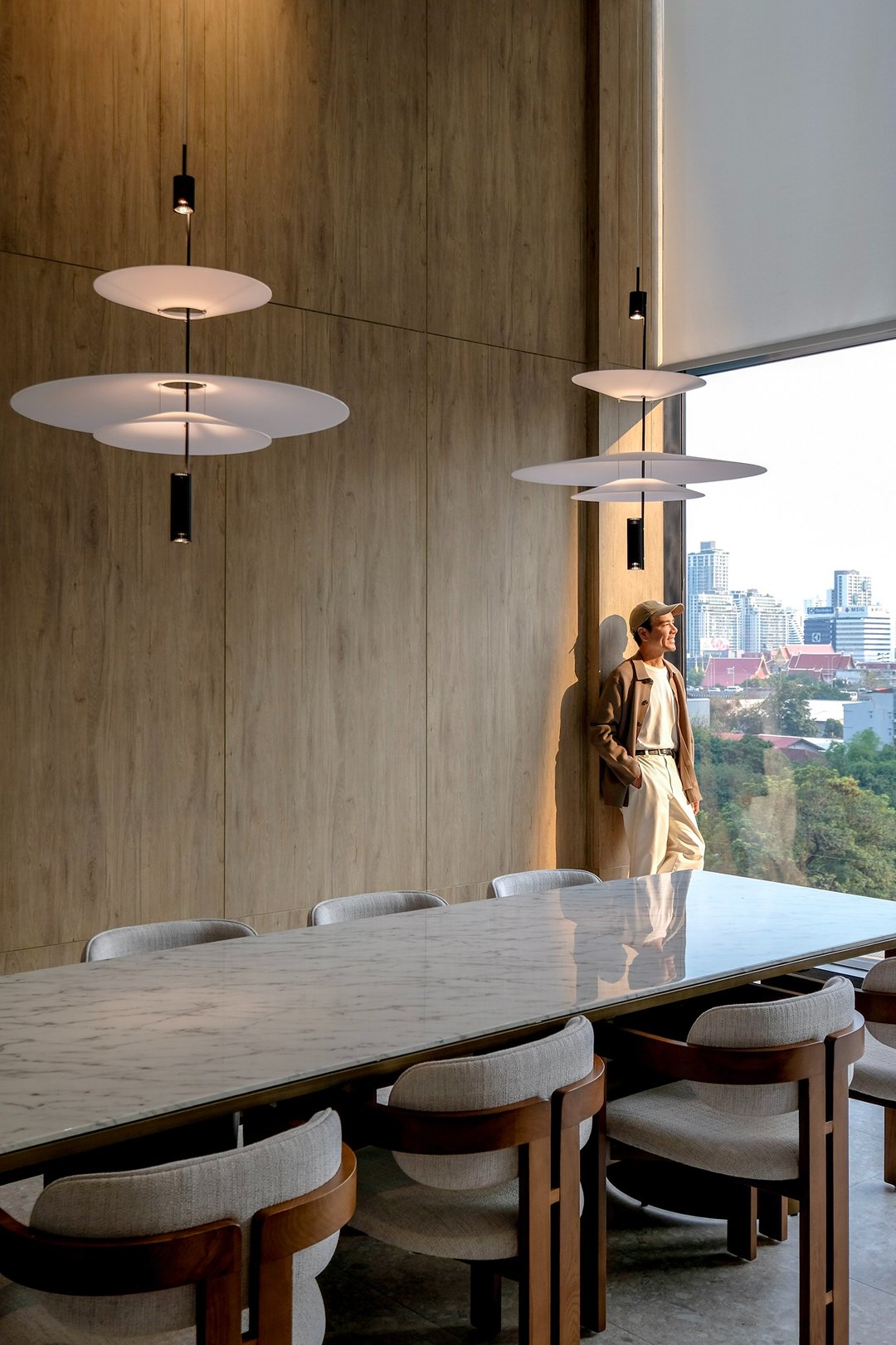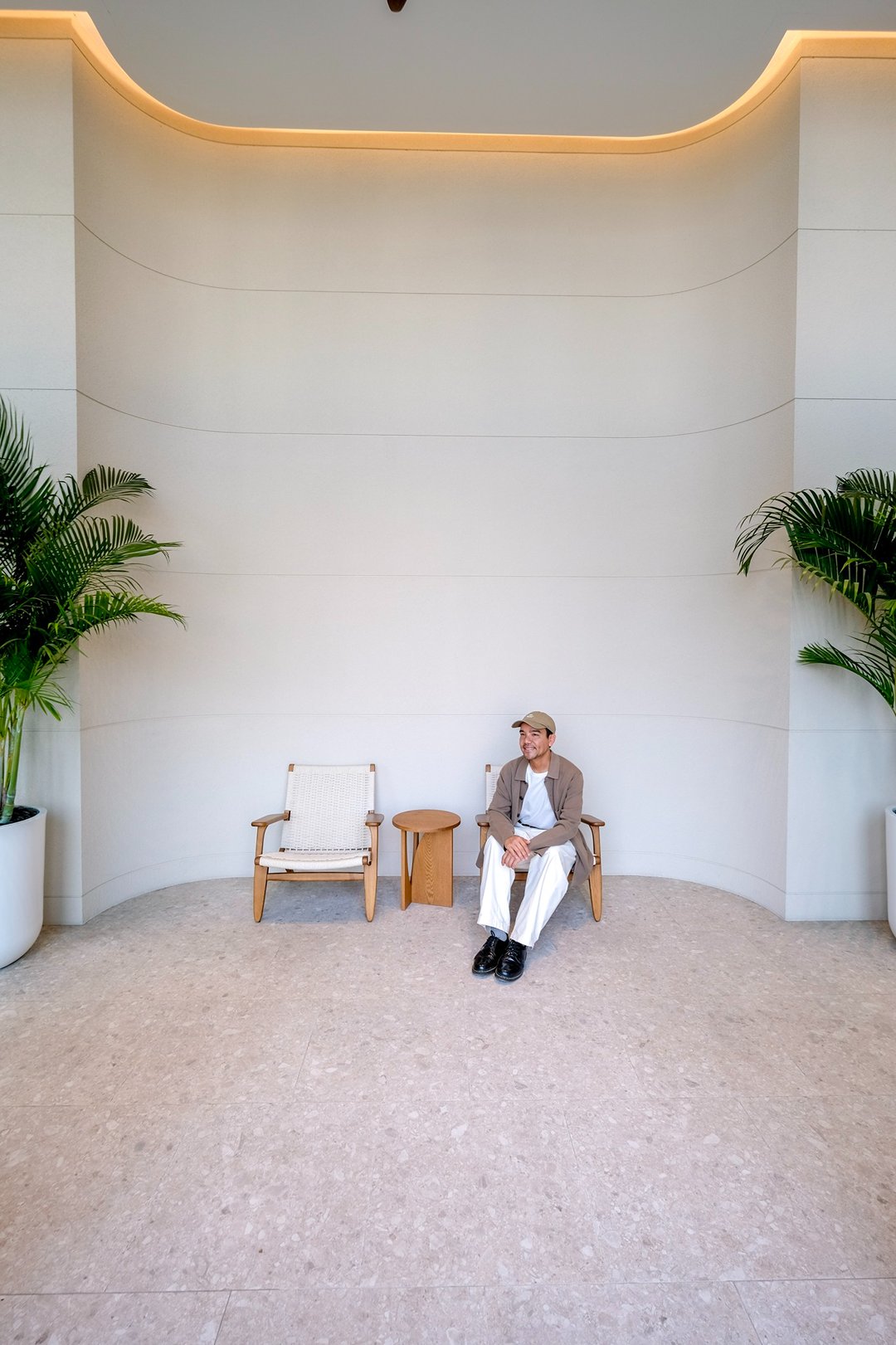 เส้นไฟ warm tone โค้งรับกับผนังสีขาวสะอาดตา พื้นที่ที่ไม่ต้องมีอะไรเยอะ แต่ทำให้เรานั่งพัก หายใจ และคิดอะไรชัดขึ้นกว่าเดิม
