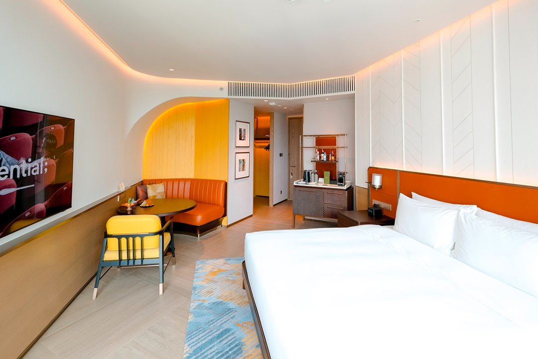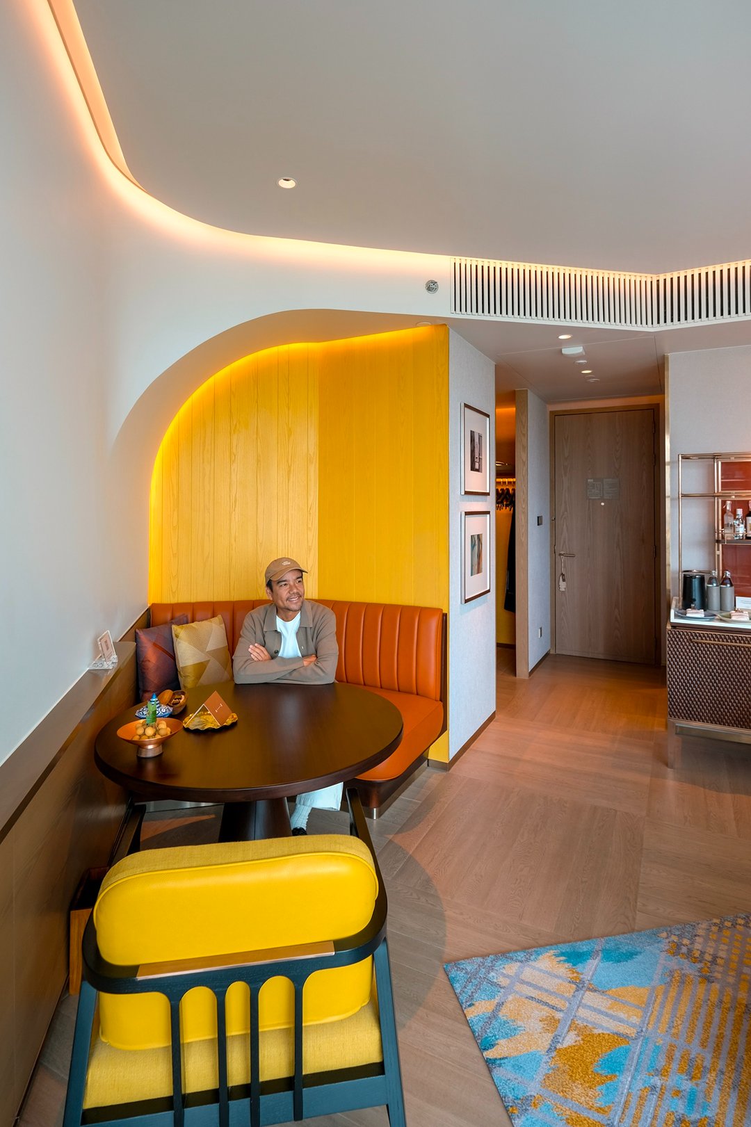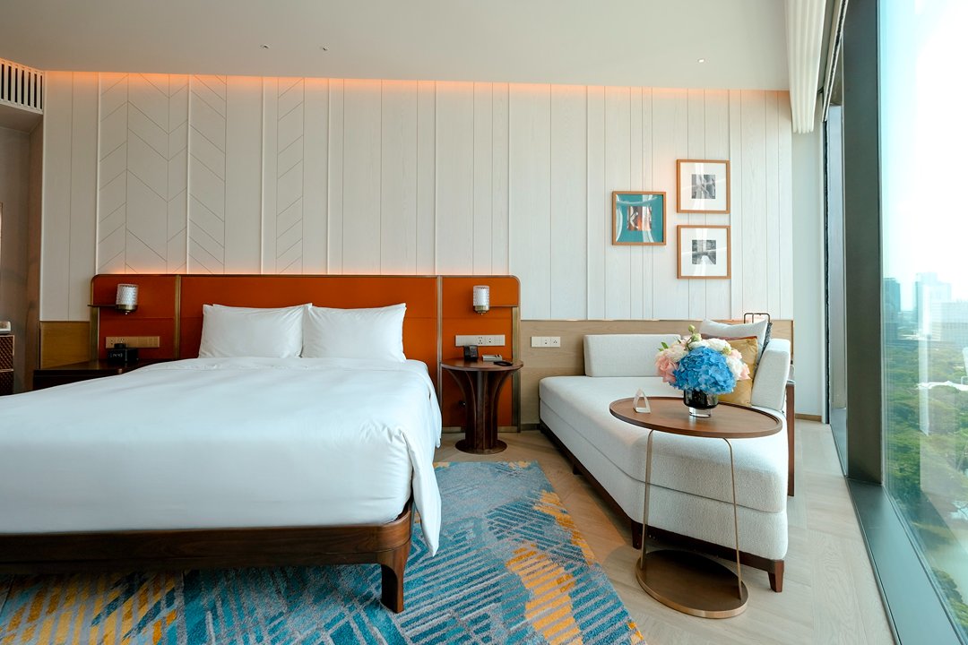 พอขึ้นมาที่ห้องพัก บรรยากาศเปลี่ยนเป็นความสงบที่สบายมากโทนสีเรียบ เส้นสาย มีความโค้ง แบบ playful เล็ก ๆ ทุกอย่างดู พอดีและลงตัวไปซะหมด เป็นห้องที่ไม่ได้พยายาม wow แต่กลับทำให้เราอยากอยู่นิ่ง นั่งมองวิว ได้นานกว่าที่คิด ภายในห้องมี mini bar ที่รวมในค่าห้อง มีกาแฟ Nespresso ไดร์ Dyson และ amenities จาก Byredo รายละเอียดเล็ก ๆ ที่ทำให้การพักผ่อน รู้สึก complete ขึ้นแบบปล่อยใจสุด ๆ