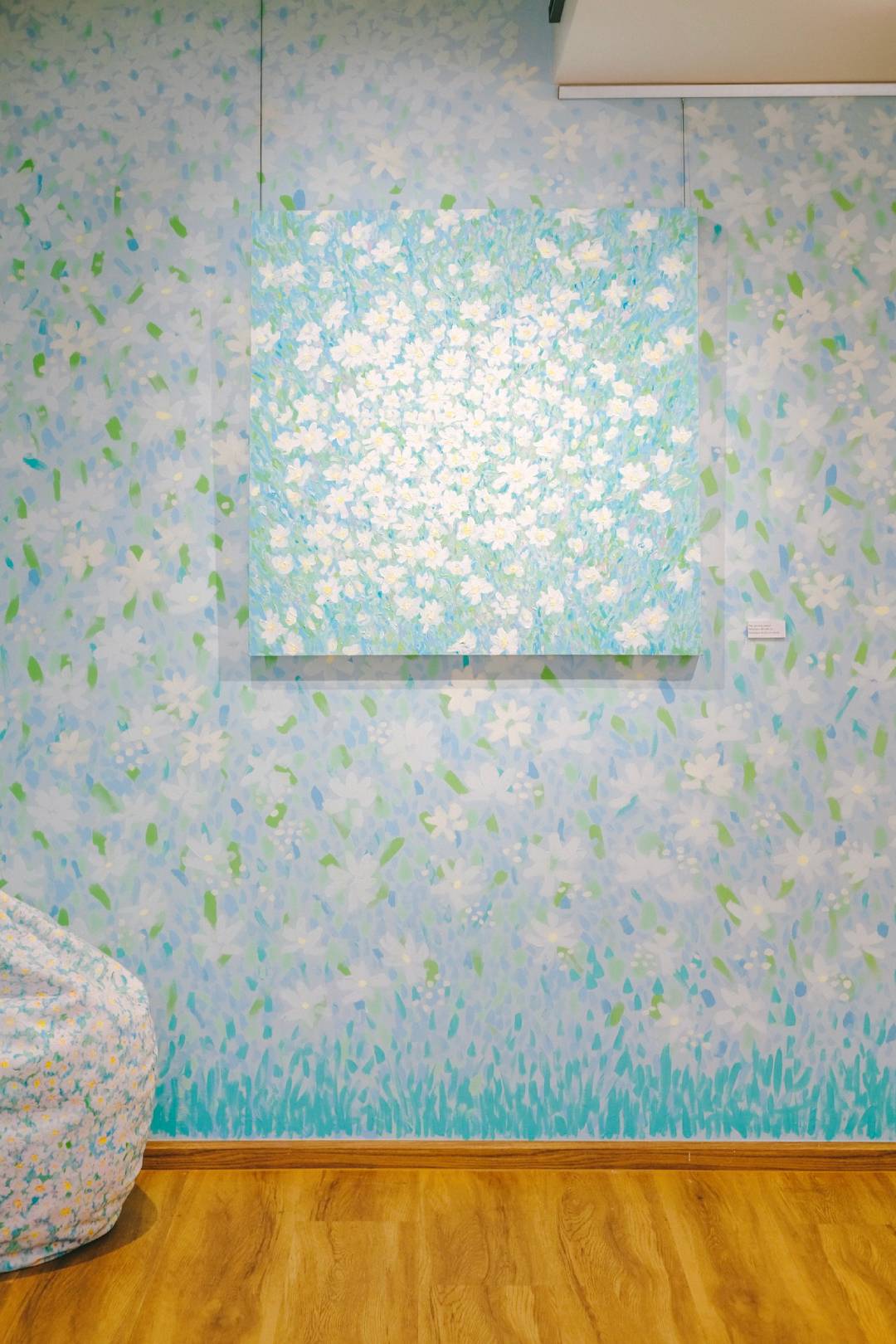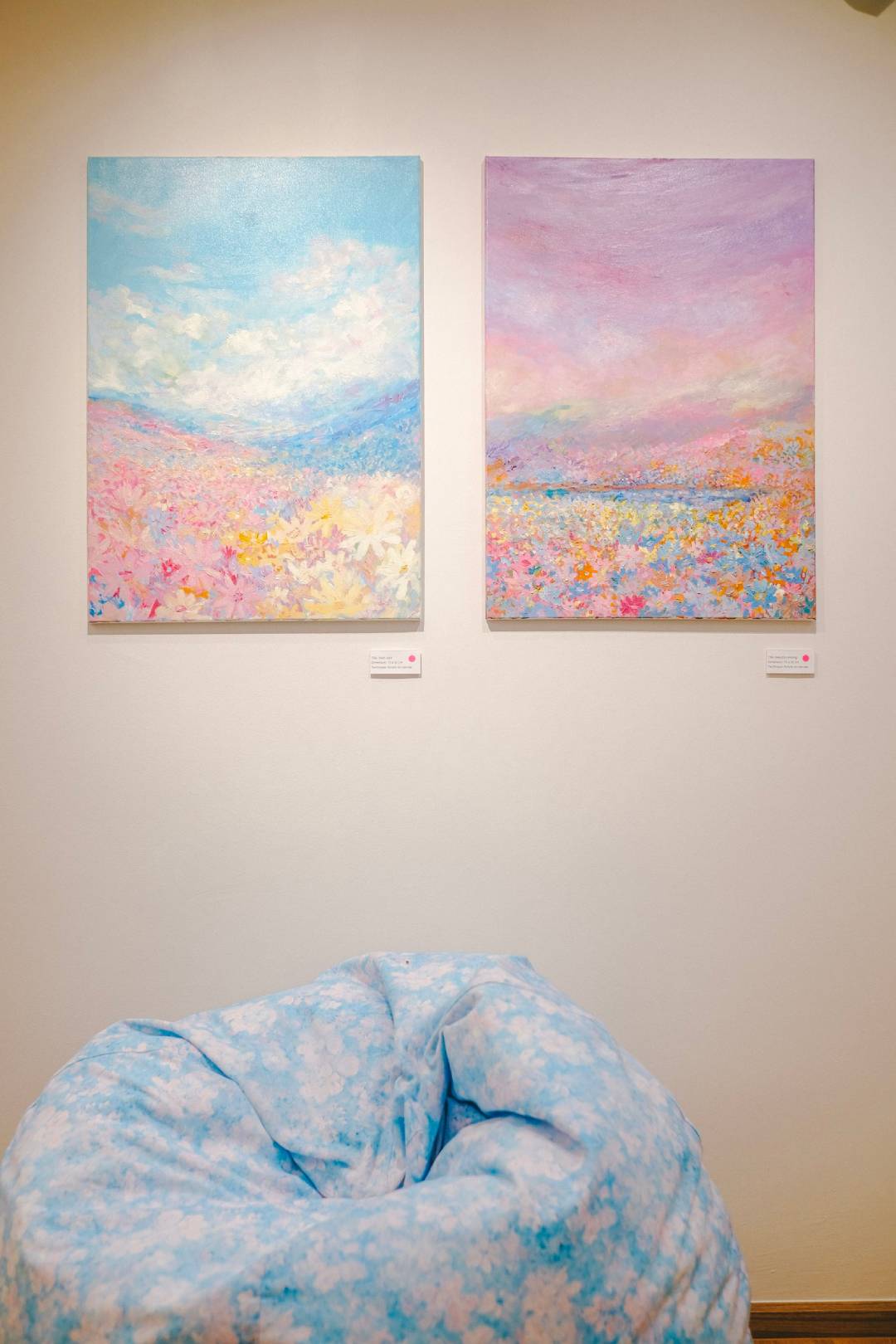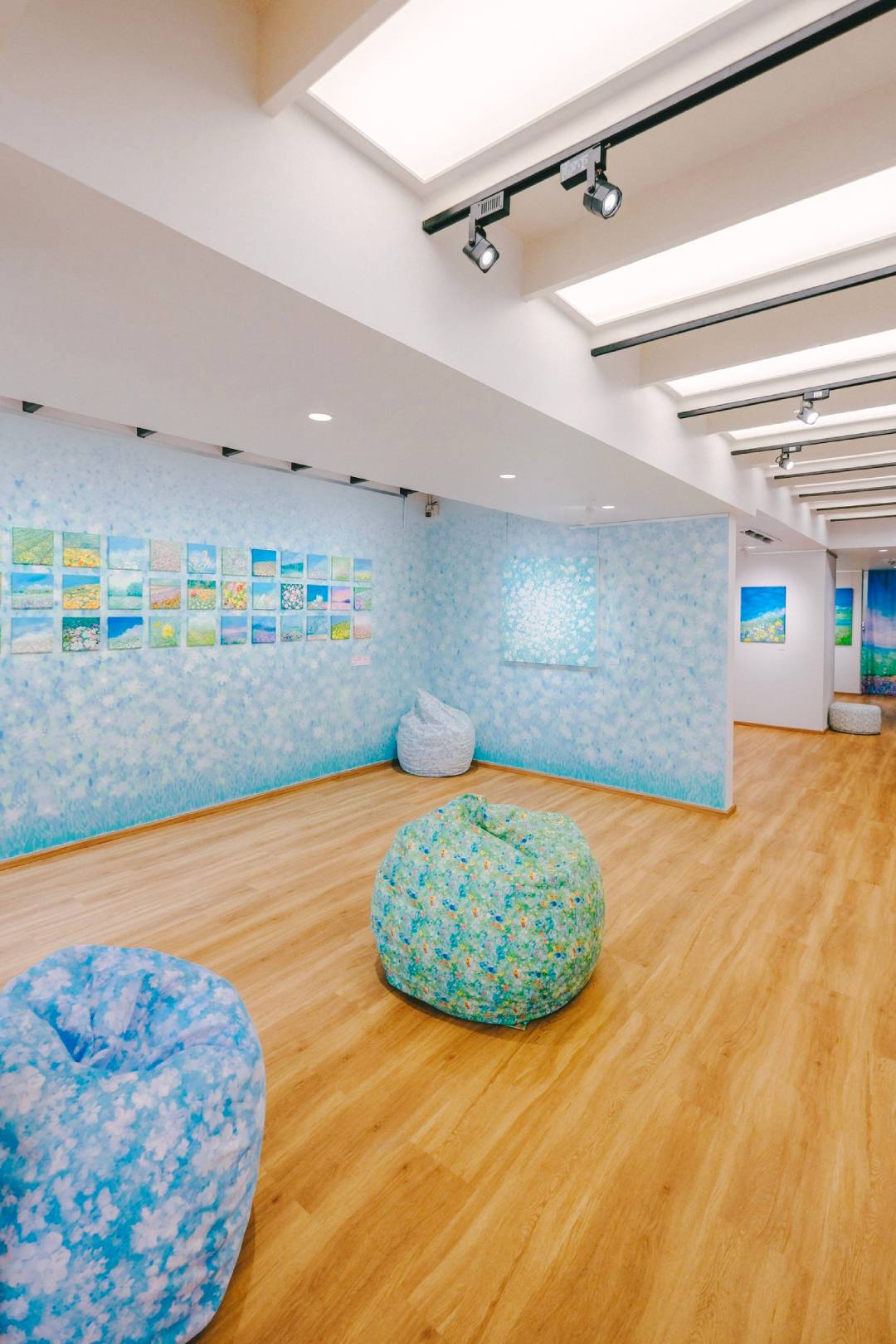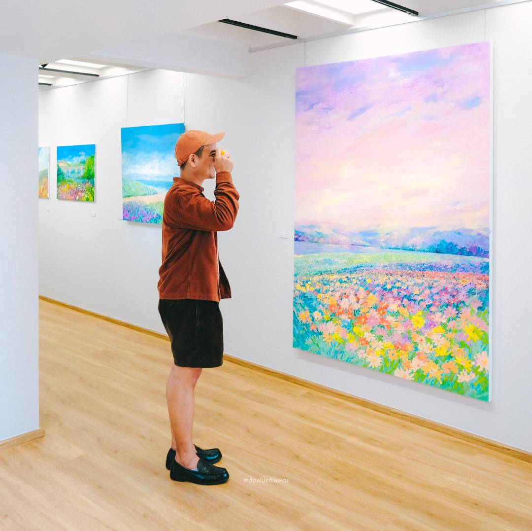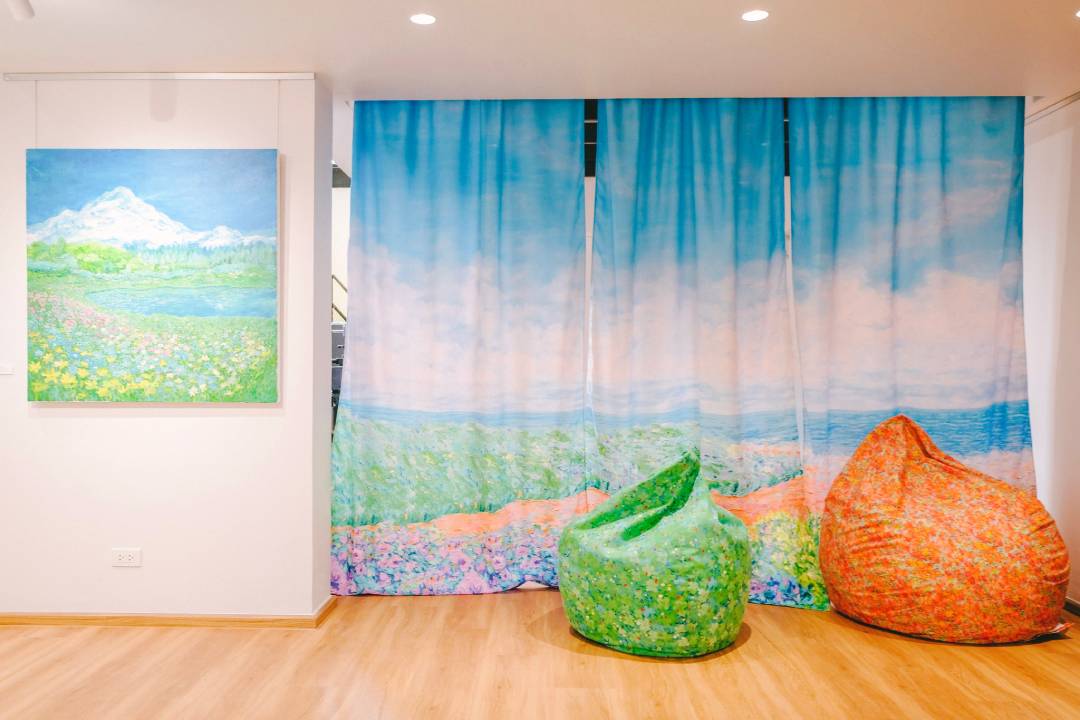 โดยงานนี้จัดอยู่ในแกลลอรี่สีขาว สไตล์มินิมอล KICHgallery ซึ่งบรรยากาศภายในมีงานอาร์ตที่ถูกรังสรรค์โดยศิลปิน ถูกจัดวางไว้ภายในห้องสีขาว สบายตา สบายใจ โดยนอกจากผลงาน installation แล้วภายในแกลลอรี่ยังให้ทุกคนสามารถนั่งถ่ายรูปกับ Beanbag นุ่มฟูที่คุมธีมสีสันเป็นลวดลายดอกไม้ เป็น interactive art ที่ถ่ายทอดพลังบวก ช่วยฮีลใจสำหรับคนที่มาเยี่ยมชมเหมือนได้รับพลังงานดีๆธรรมชาติมาโอบกอดเลยล่ะครับ