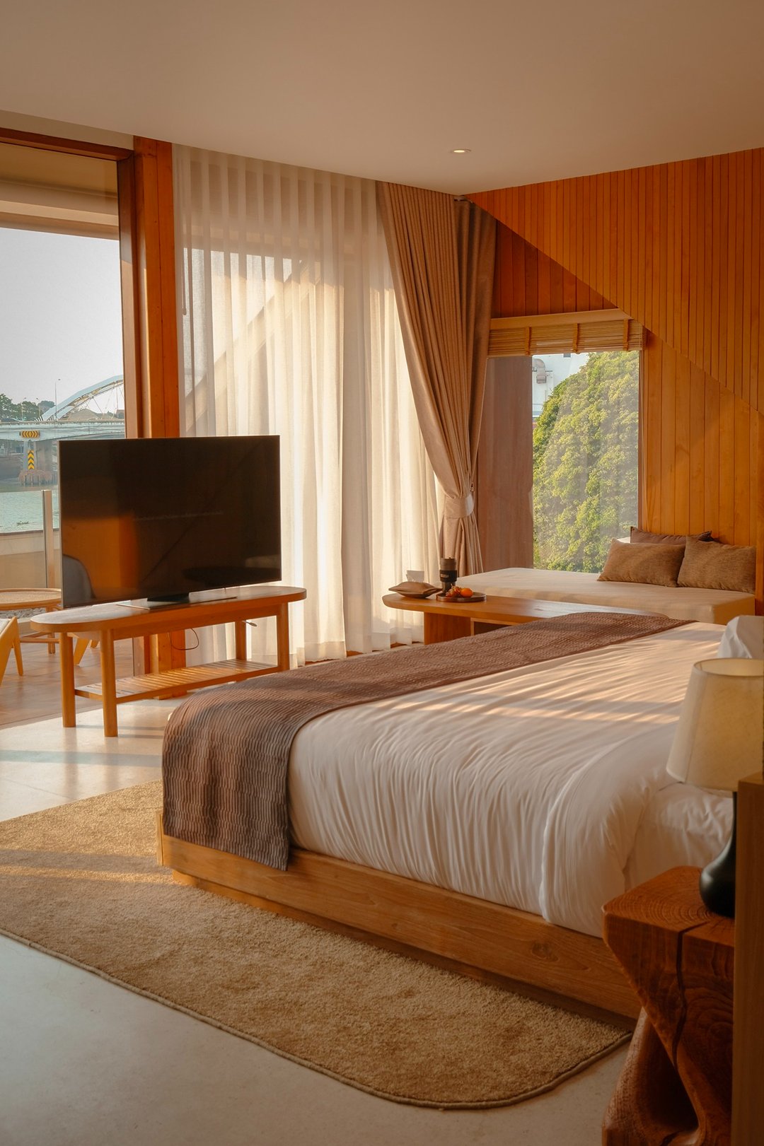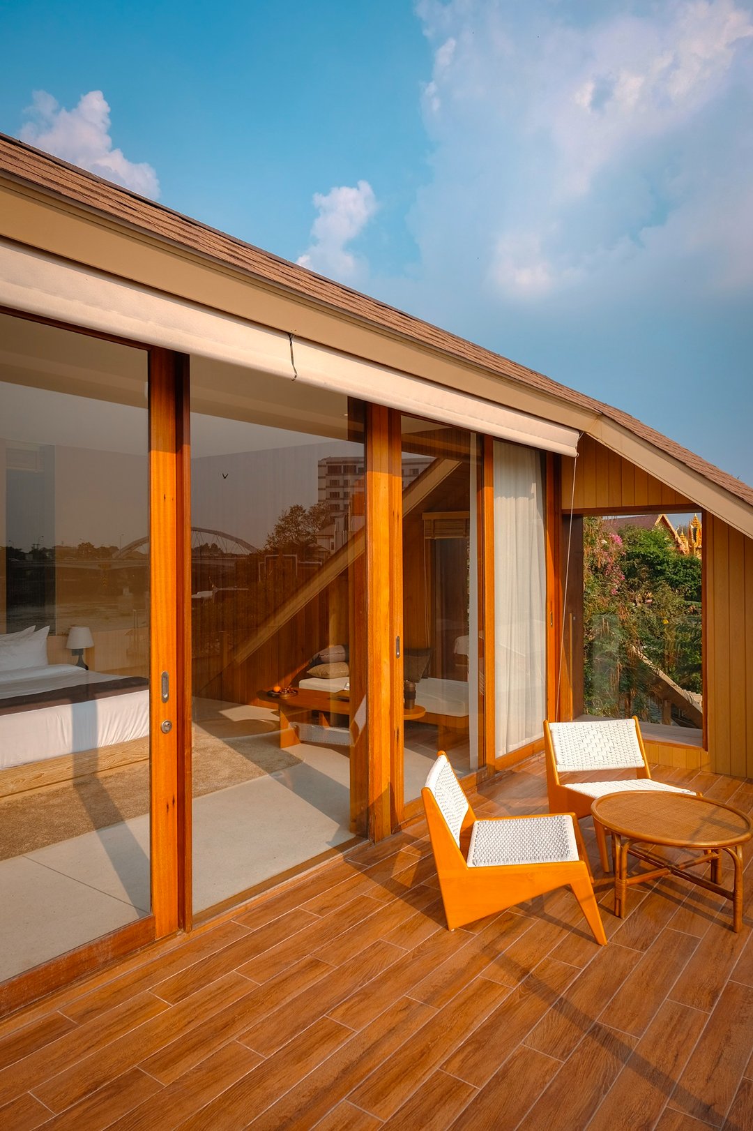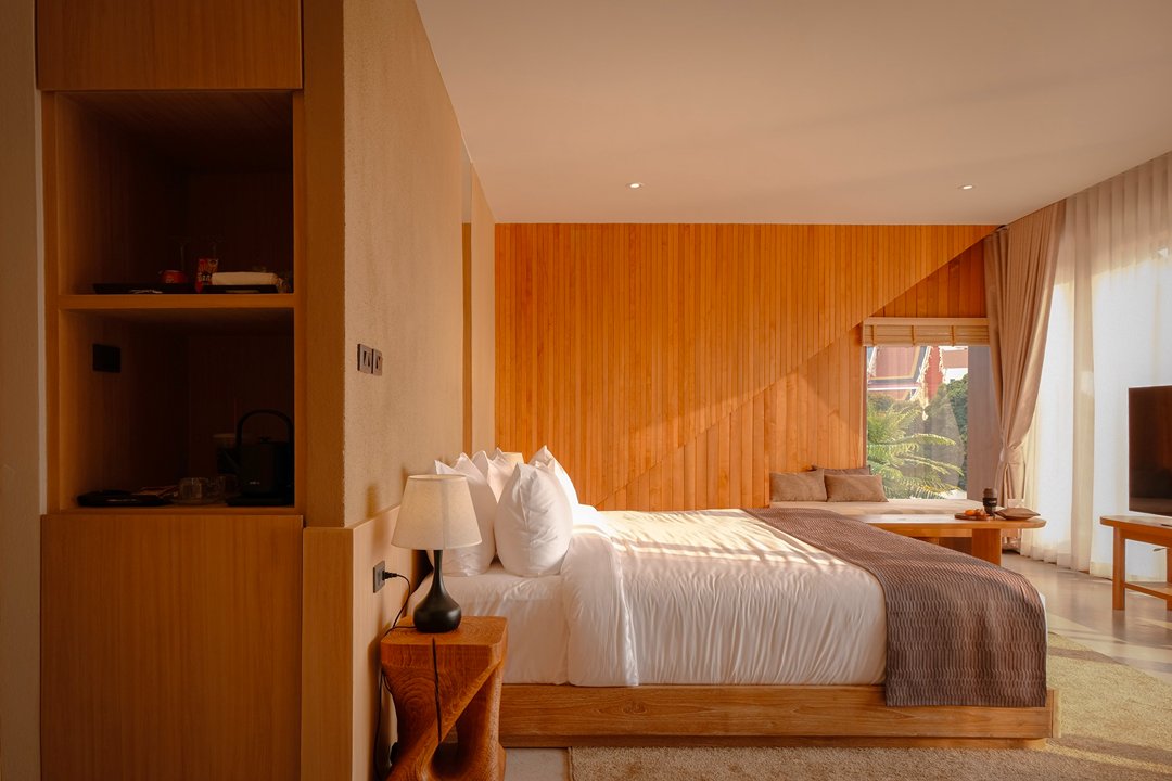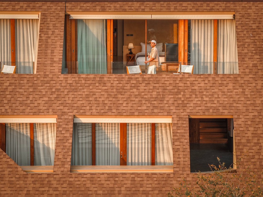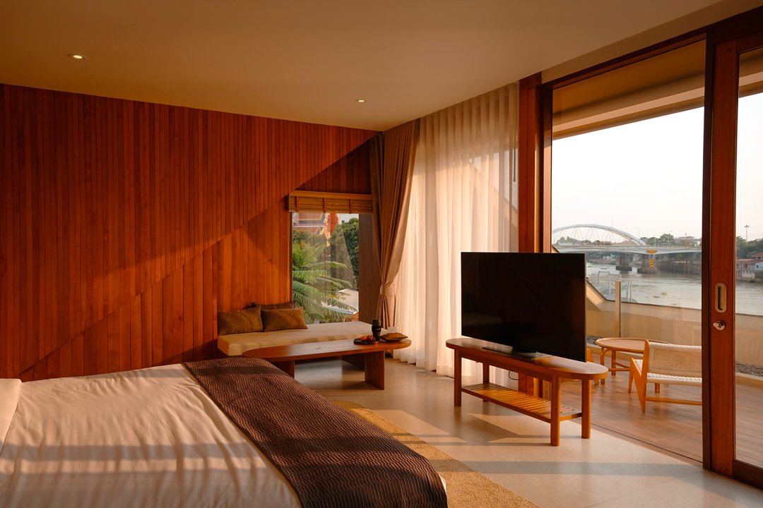 ที่นี่มีห้องพักเพียง 5 ห้องเท่านั้น สัมผัสแรกคือ “ความเงียบ” ไม่มีความวุ่นวาย ทุกห้องเป็นวิวแม่น้ำทั้งหมด โดดเด่นด้วยโครงสร้างอาคาร และ Facade ภายนอกสุดเก๋ สู่บรรยากาศ Slow Life ริมน้ำ แค่เปิดม่านก็ได้รับแสงธรรมชาติและวิวสุดจึ้งทุกห้อง ภายในห้องตกแต่งสไตล์เรียบง่าย คุมโทนด้วยสึโทนไม้ แต่มีดีเทลจัดวางเฟอร์จิเจอร์ได้แบบลงตัวทุกมุม ช่วงบ่ายคือแสงสวยมากกก แสงอุ่นๆ สะท้อนผิวน้ำ กับการ Take Time นั่งมองฟ้าดื่มด่ำ sunset ท้องฟ้าที่ค่อยไล่เฉดส้ม ชมพู มองสายน้ำที่ตกกระทบกับแสงพระอาทิตย์แบบ soft ๆเป็นความสวยที่ไม่ต้องใส่ฟิลเตอร์ บอกเลยมู้ดดีสุดๆ