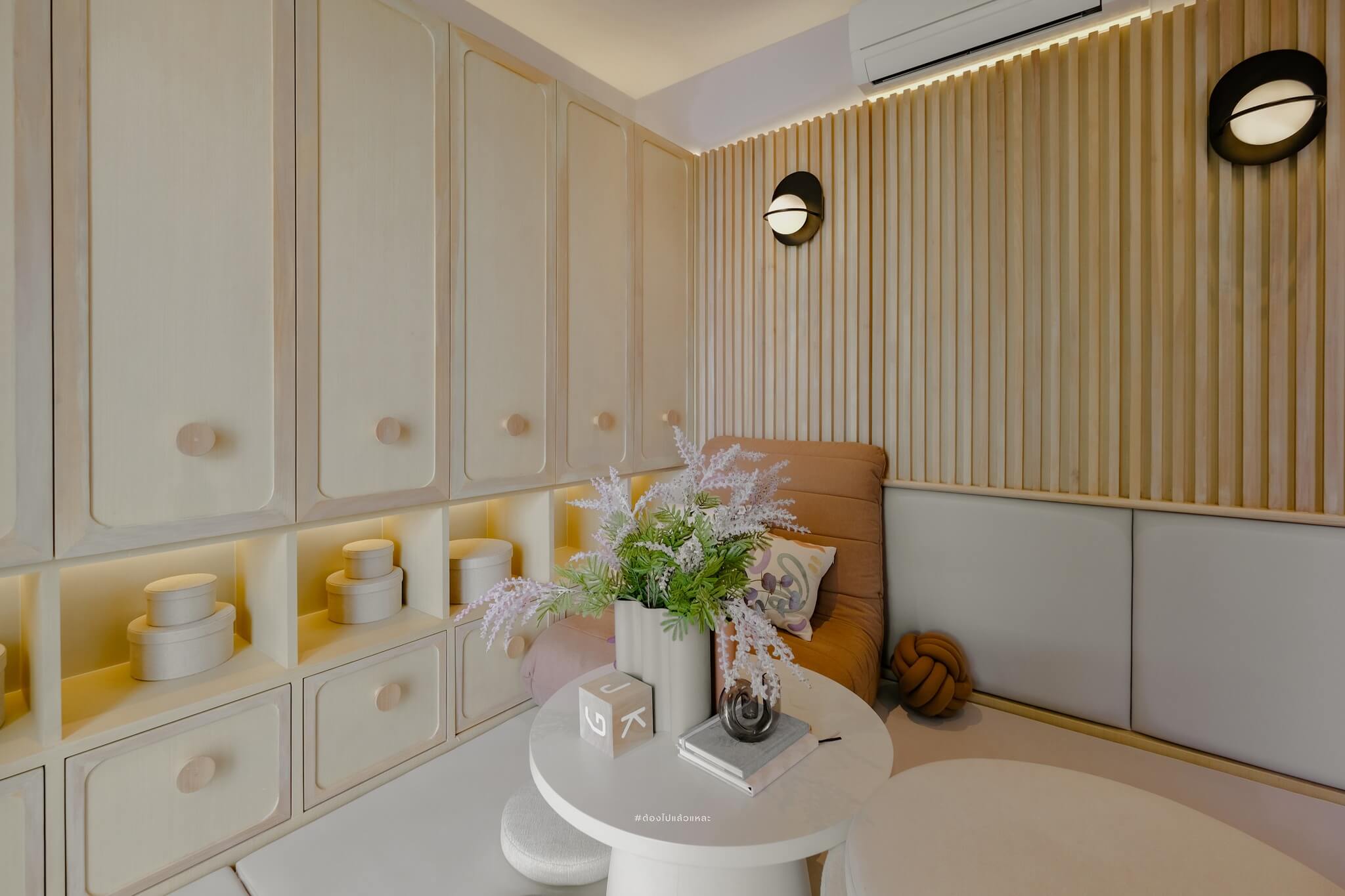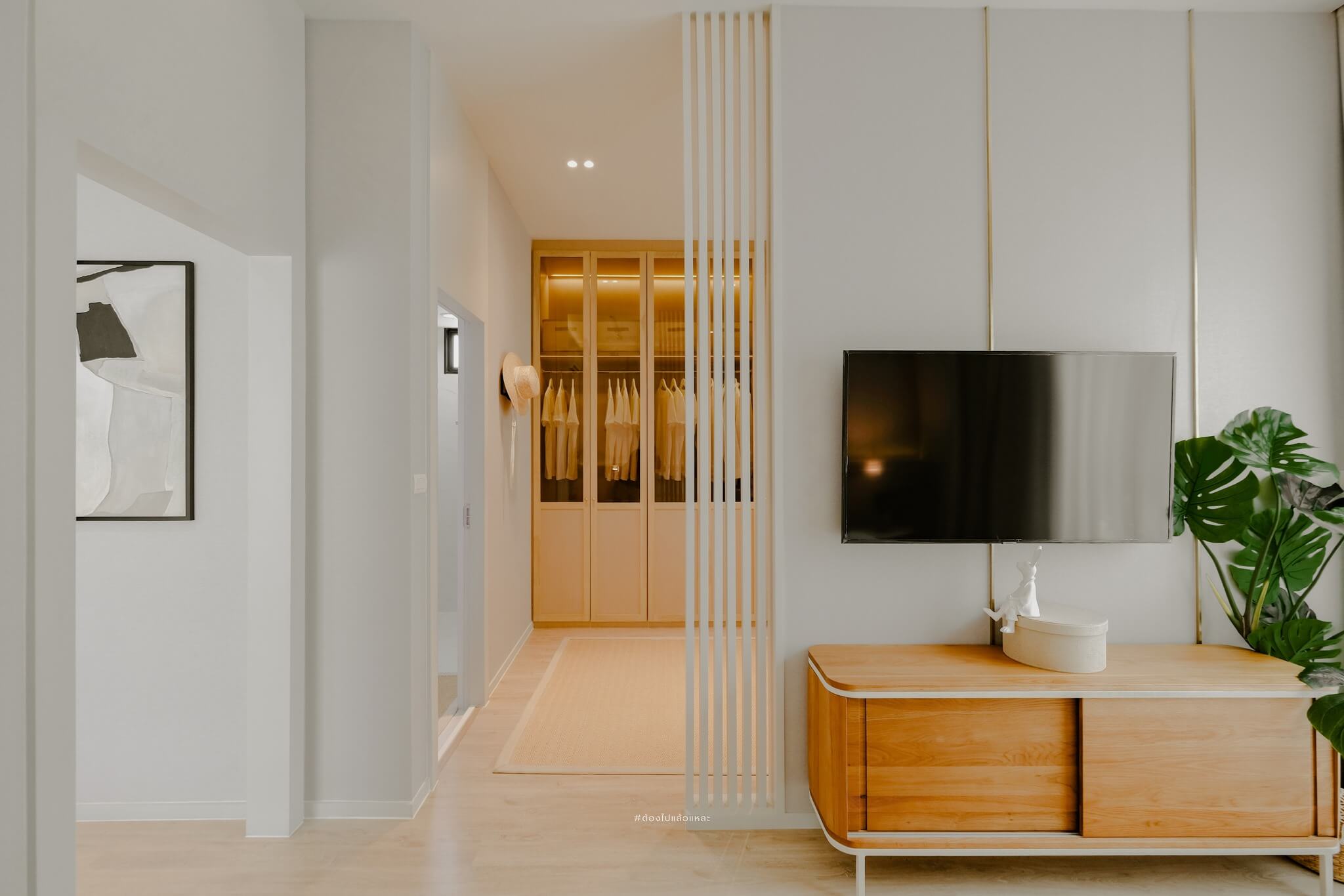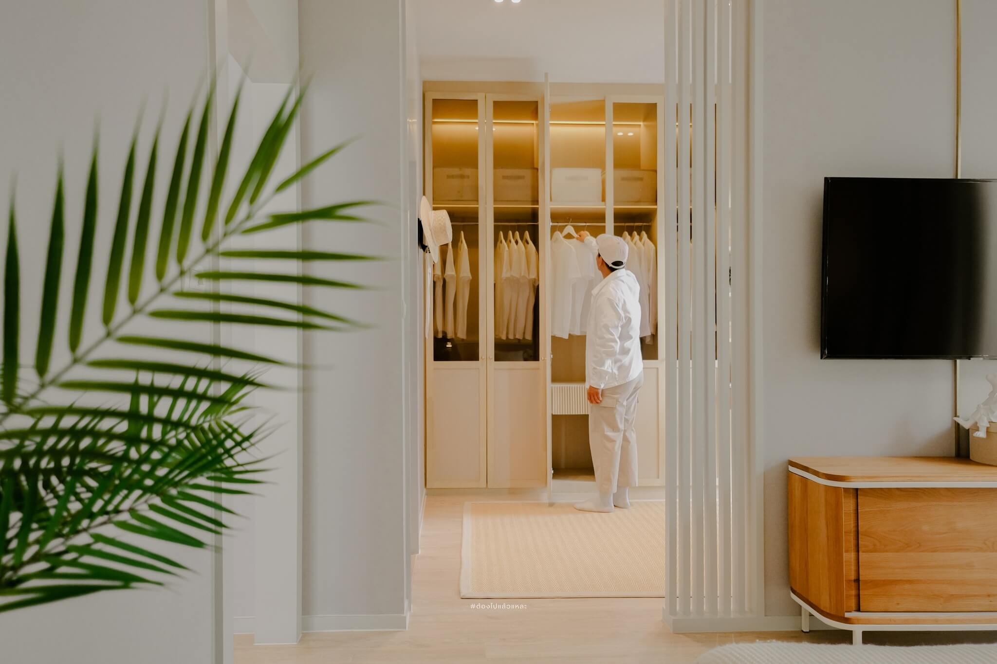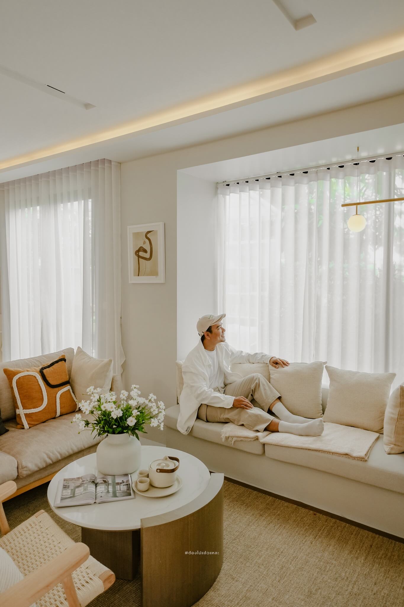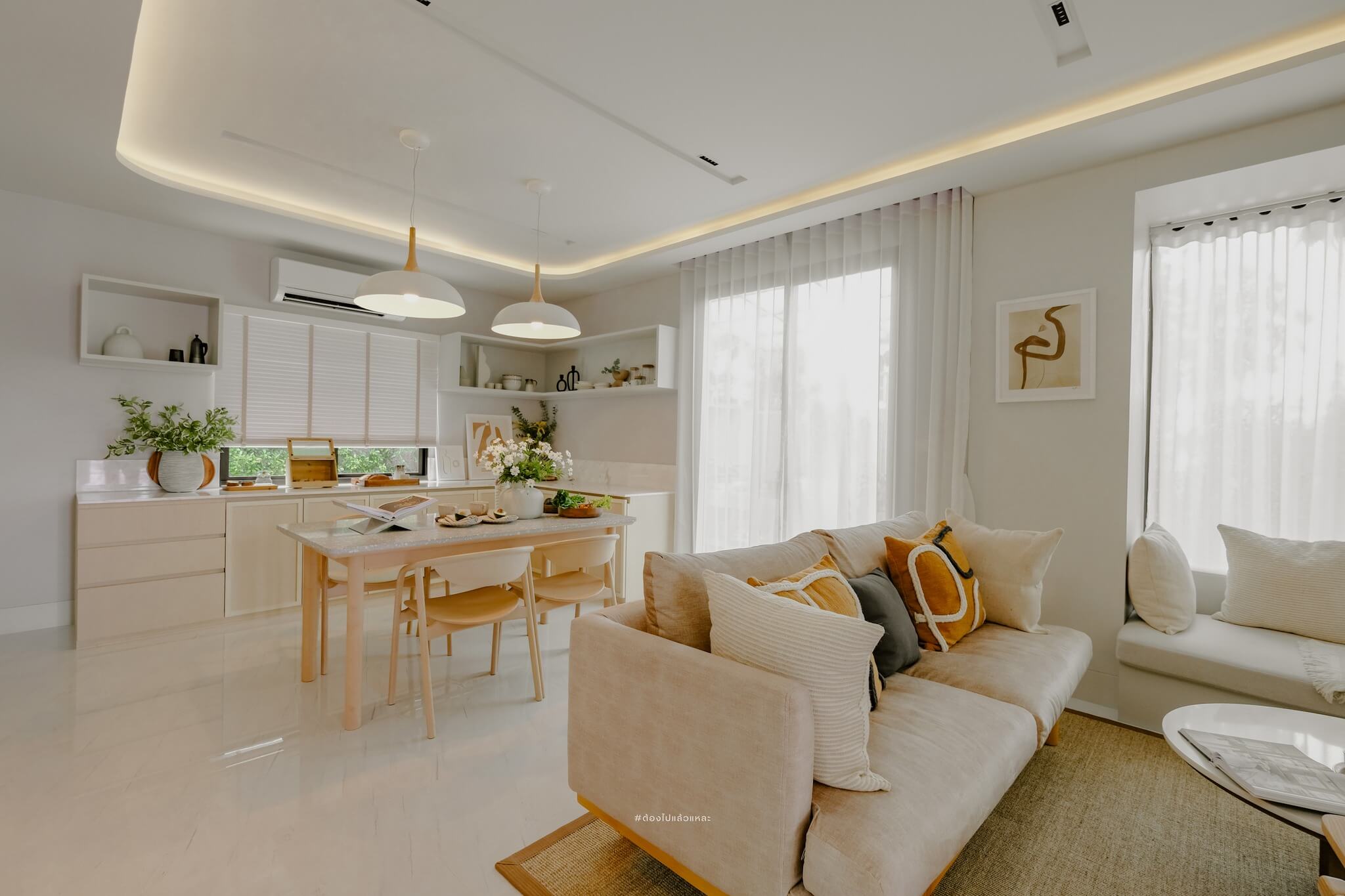 ภาพแรกที่เราเดินเข้าไปในบ้าน เรามองเห็นการให้ความสำคัญของการออกแบบการใช้ชีวิตที่บ้านมากๆ เรียกว่าทุกพื้นที่ใช้สอยเป็นฟังก์ชั่นที่ใช้งานได้จริง และตอบโจทย์กับไลฟ์สไตล์คนรุ่นใหม่ ที่อยากมีบ้านและเริ่มต้นสร้างครอบครัวมากๆ เราชอบการตกแต่งที่มีความคุมโทน สีขาว ครีม เป็นความมินิมอล เรียบง่ายแต่ดูดีและลงตัวเลยครับเพิ่มกลิ่นอายความอบอุ่นให้กับห้องด้วยเฟอร์นิเจอร์ไม้ และที่เราชอบมากที่กลางพื้นที่ของบ้าน โครงการเลือกใช้กระจก Bay Window ที่เน้นช่องแสงทำให้แสงจากธรรมชาติสาดส่องเข้ามา มันทำให้มู้ดในบ้านเต็มไปด้วยความอบอุ่นไป ช่วยทำให้เราผ่อนคลายมากขึ้นด้วย ลองนึกภาพตามหากเราได้ใช้ชีวิตที่นี่ คงอบอวลไปด้วยความสุขและรู้สึกผ่อนคลายได้อย่างแท้จริง