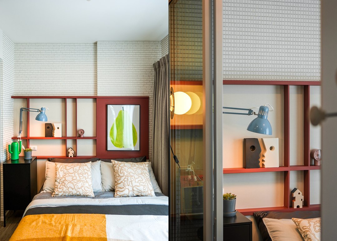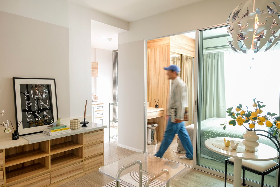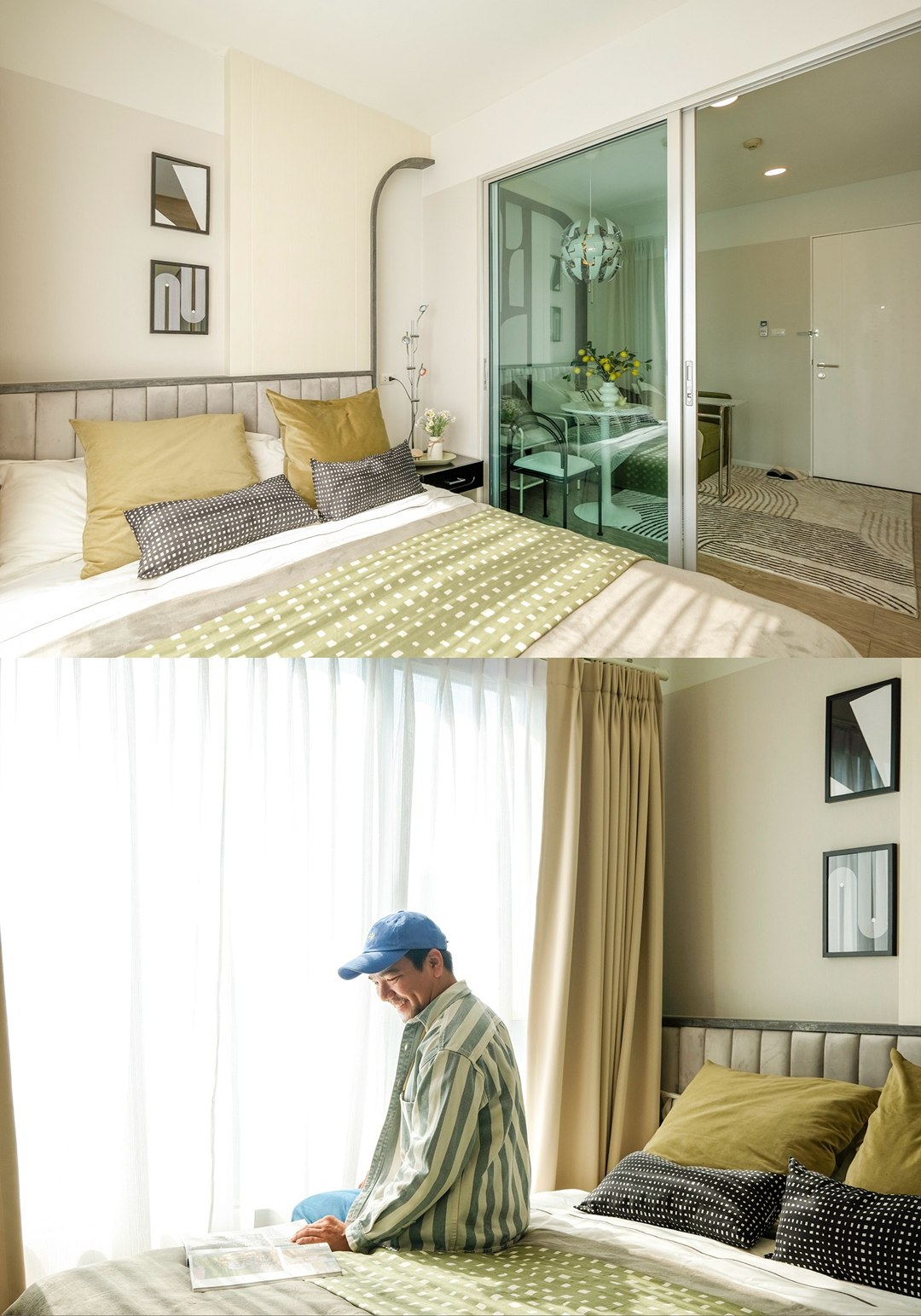 ซึ่งภายในห้องนี้มีบานกระจกไว้เป็นพาร์ทิชั่นกั้นเพื่อแบ่งแยกระหว่าง Living Room และ Bedroom