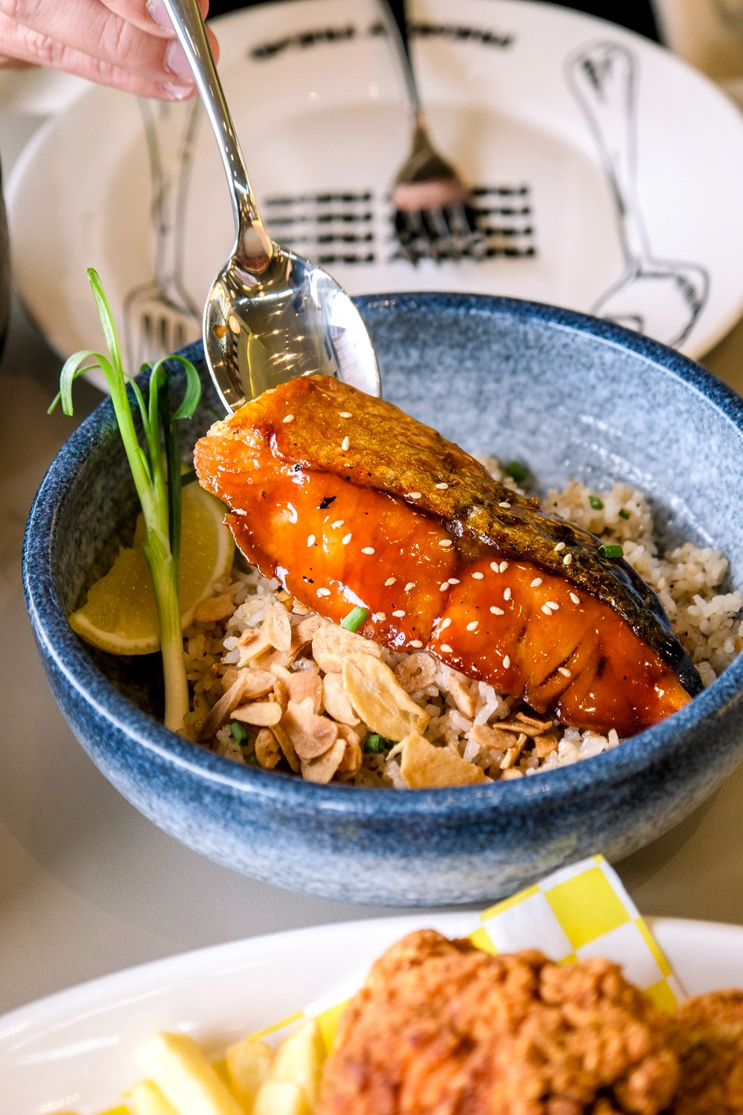 • Salmon Garlic Fried Rice – ข้าวผัดกระเทียมหอมๆ กับแซลมอนย่างชิ้นโต