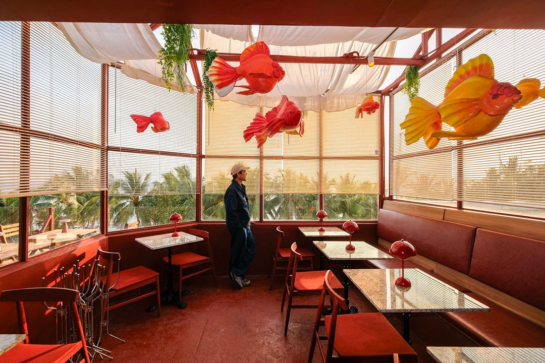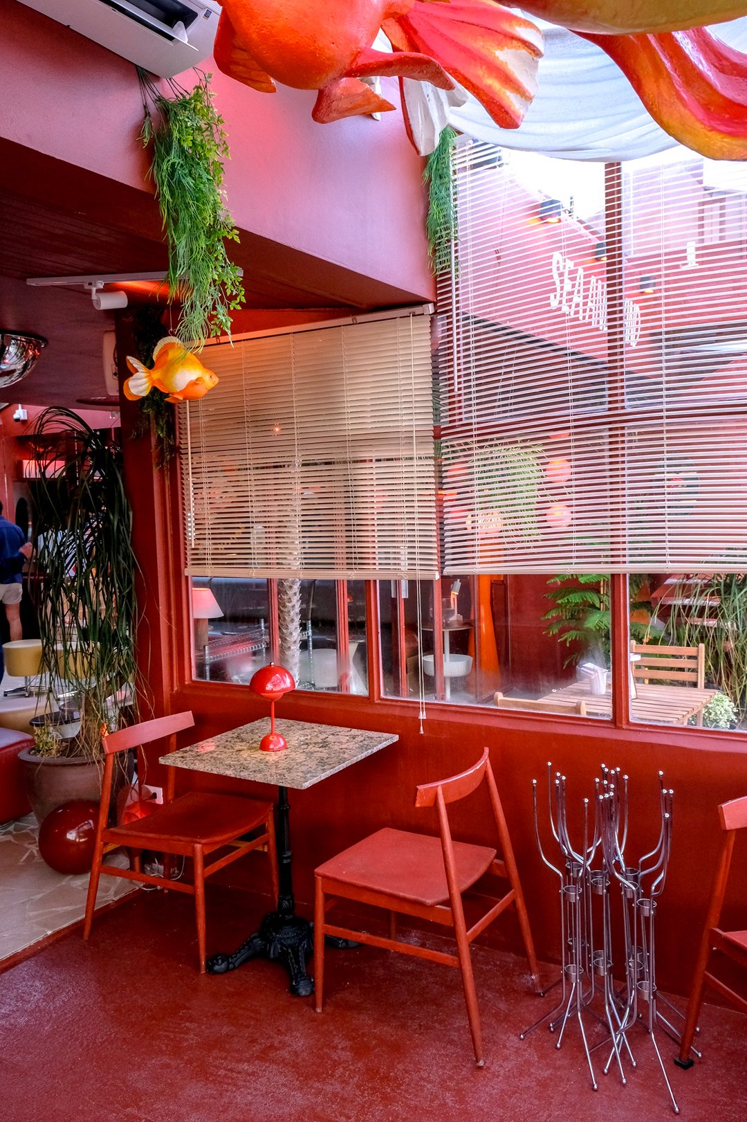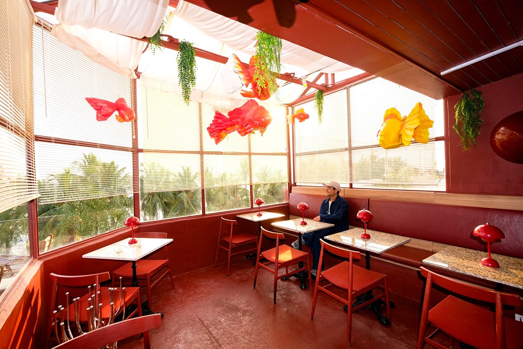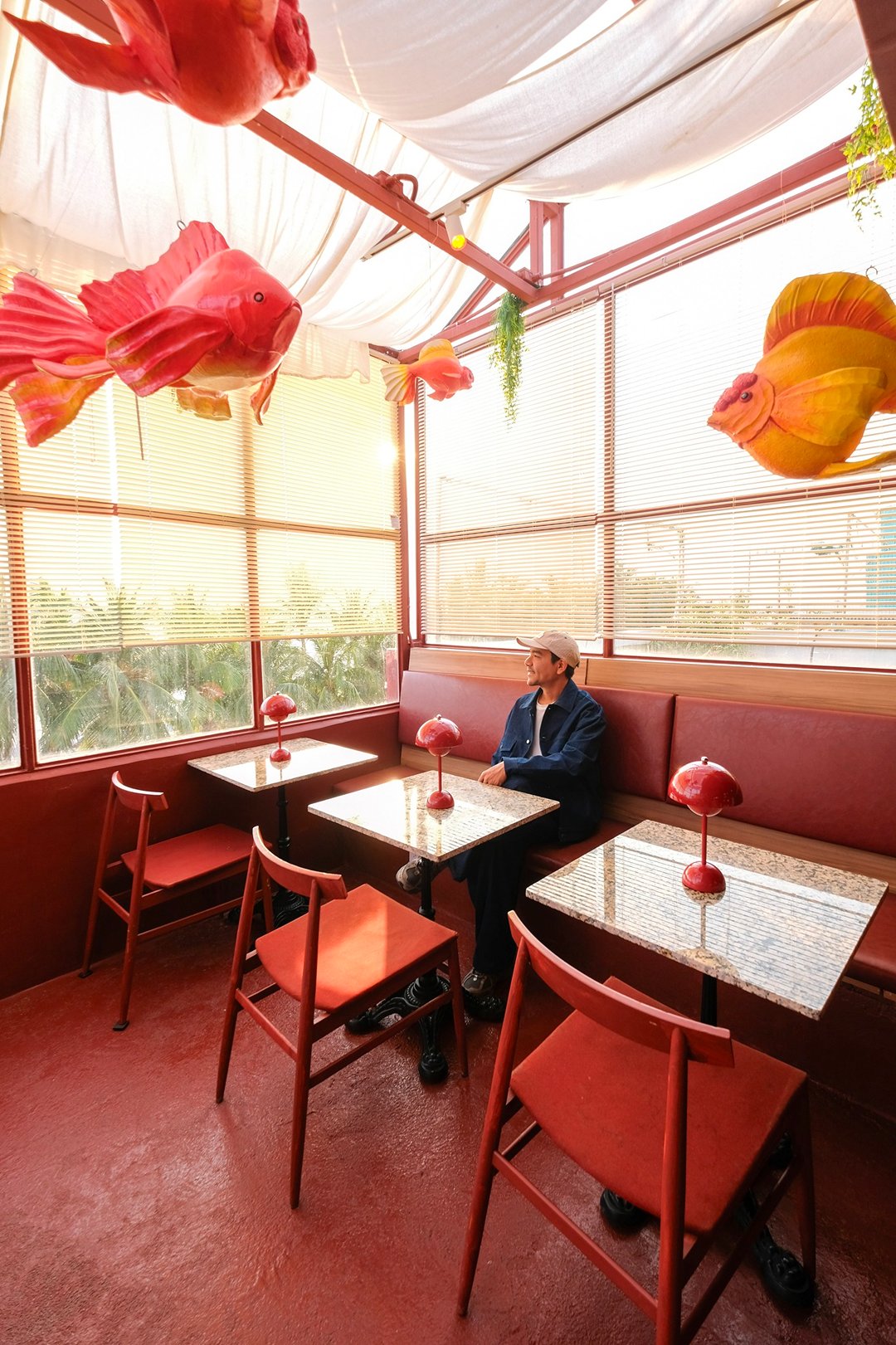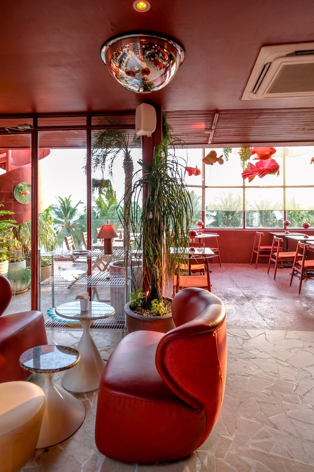 ที่นี่เป็นคาเฟ่กึ่งบาร์ริมทะเลในสไตล์ Mid-Century Modern ตกแต่งด้วยโทนแดงจัดจ้าน ตัดกับสีฟ้าของทะเล มี installation น้องปลาทอง ลอยกลางอากาศที่กลายเป็นซิกเนเจอร์ กับมุมเคาน์เตอร์ที่มีตู้ปลาทองตัวจริงแหวกว่ายท่ามกลางแสงไฟสีแดง โคตรจึ้ง ถ่ายรูปมุมไหนก็สวย เหมือนวาร์ปไปต่างประเทศเลยครับ