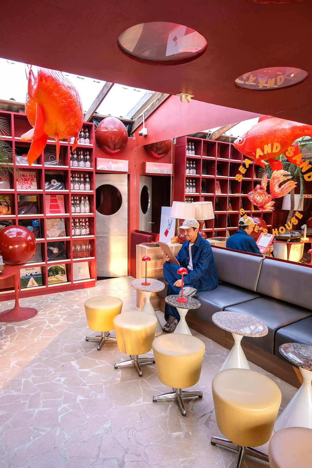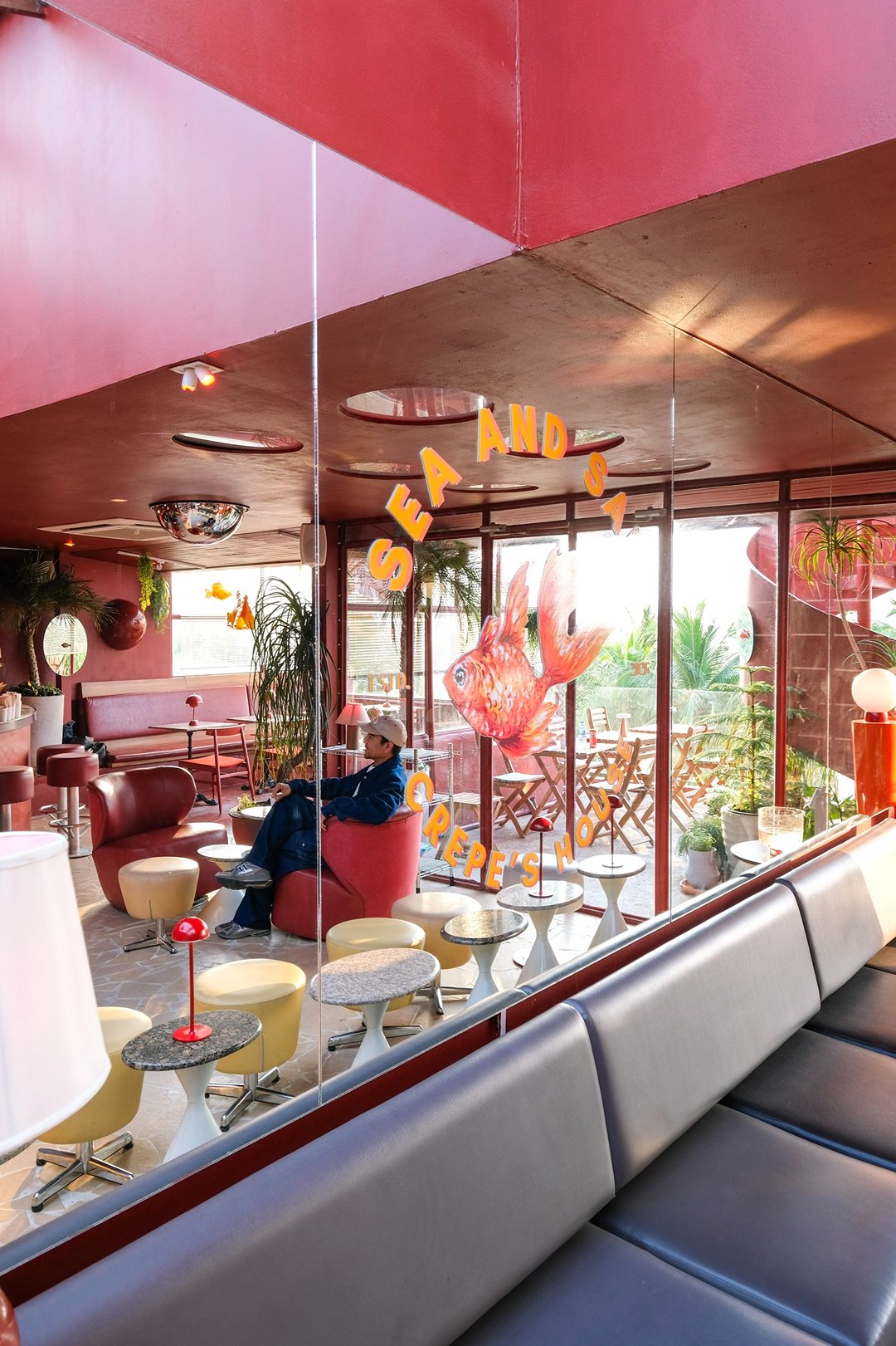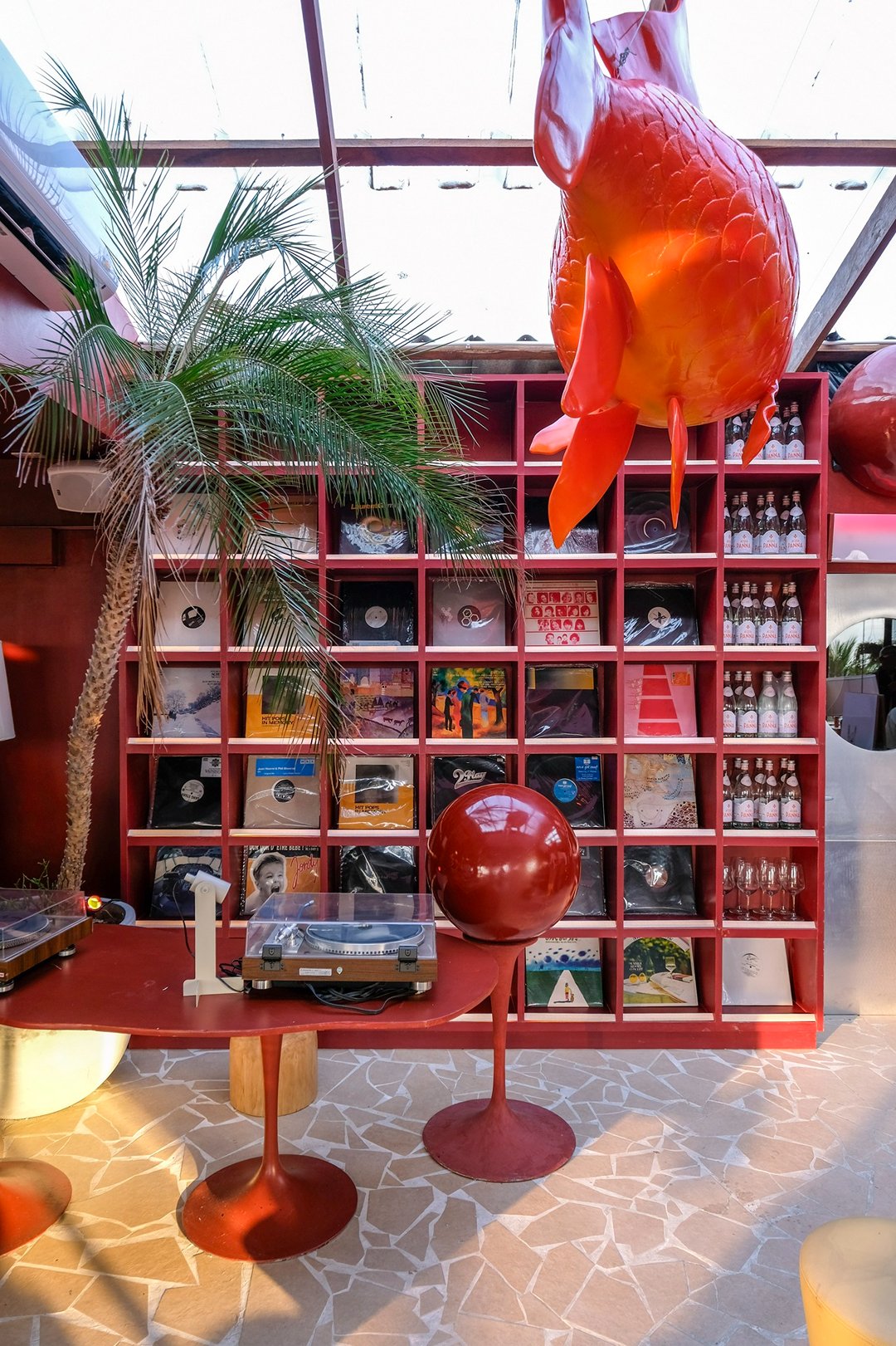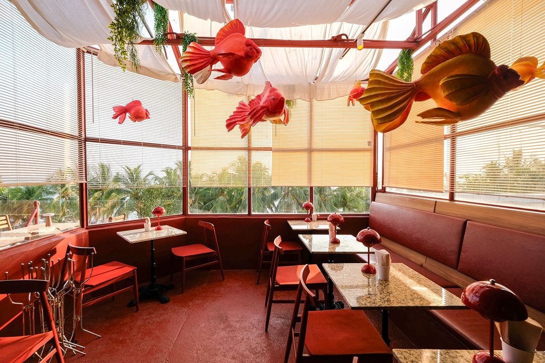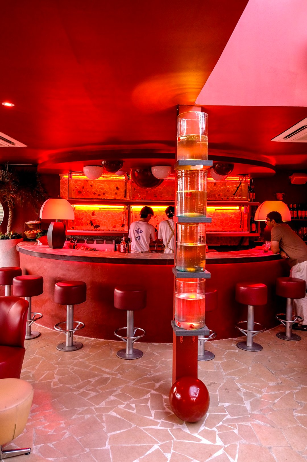 ที่นี่เป็นคาเฟ่กึ่งบาร์ริมทะเลในสไตล์ Mid-Century Modern ตกแต่งด้วยโทนแดงจัดจ้าน ตัดกับสีฟ้าของทะเล มี installation น้องปลาทอง ลอยกลางอากาศที่กลายเป็นซิกเนเจอร์ กับมุมเคาน์เตอร์ที่มีตู้ปลาทองตัวจริงแหวกว่ายท่ามกลางแสงไฟสีแดง โคตรจึ้ง ถ่ายรูปมุมไหนก็สวย เหมือนวาร์ปไปต่างประเทศเลยครับ