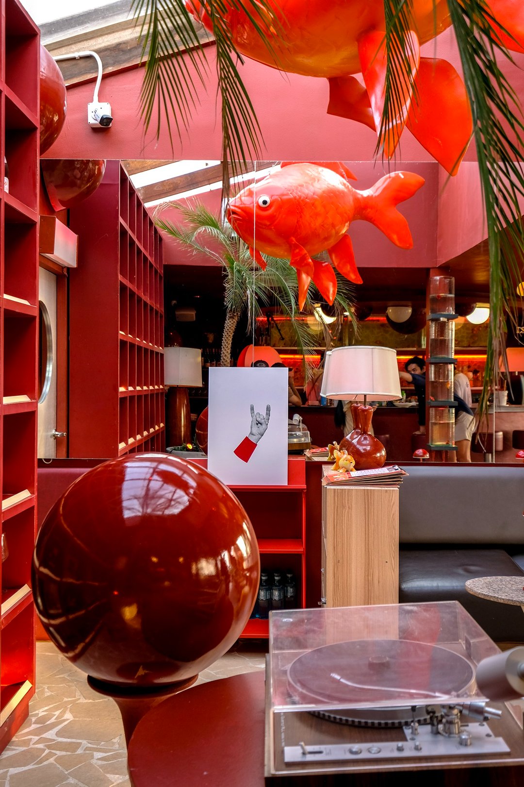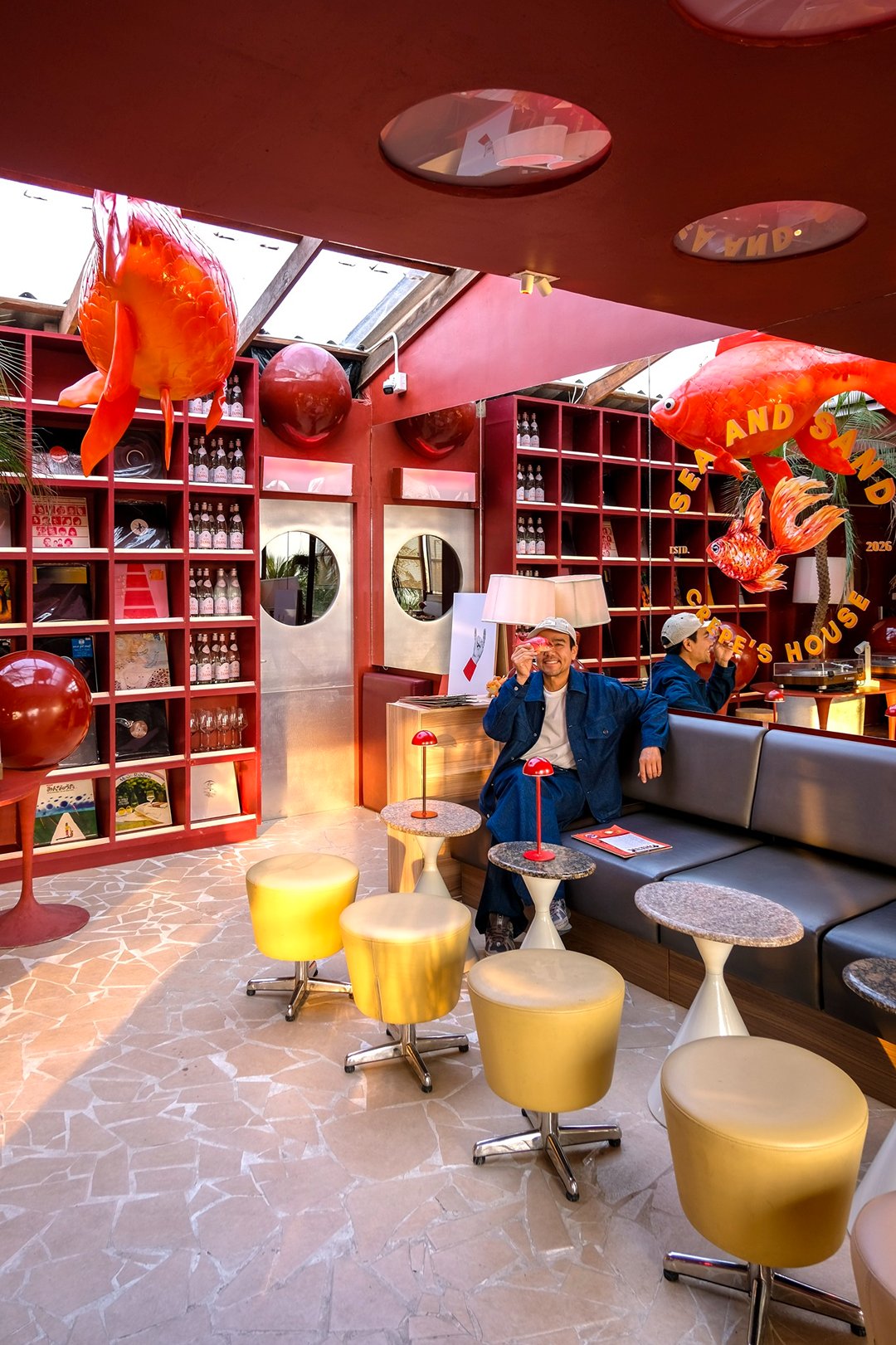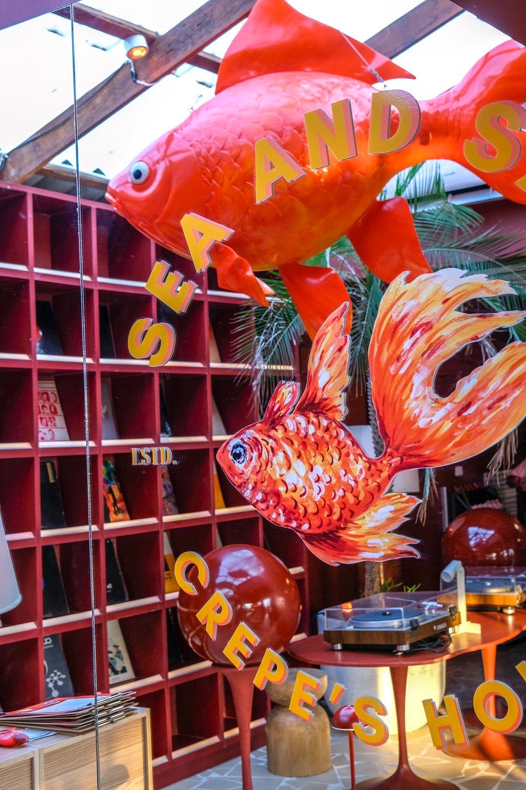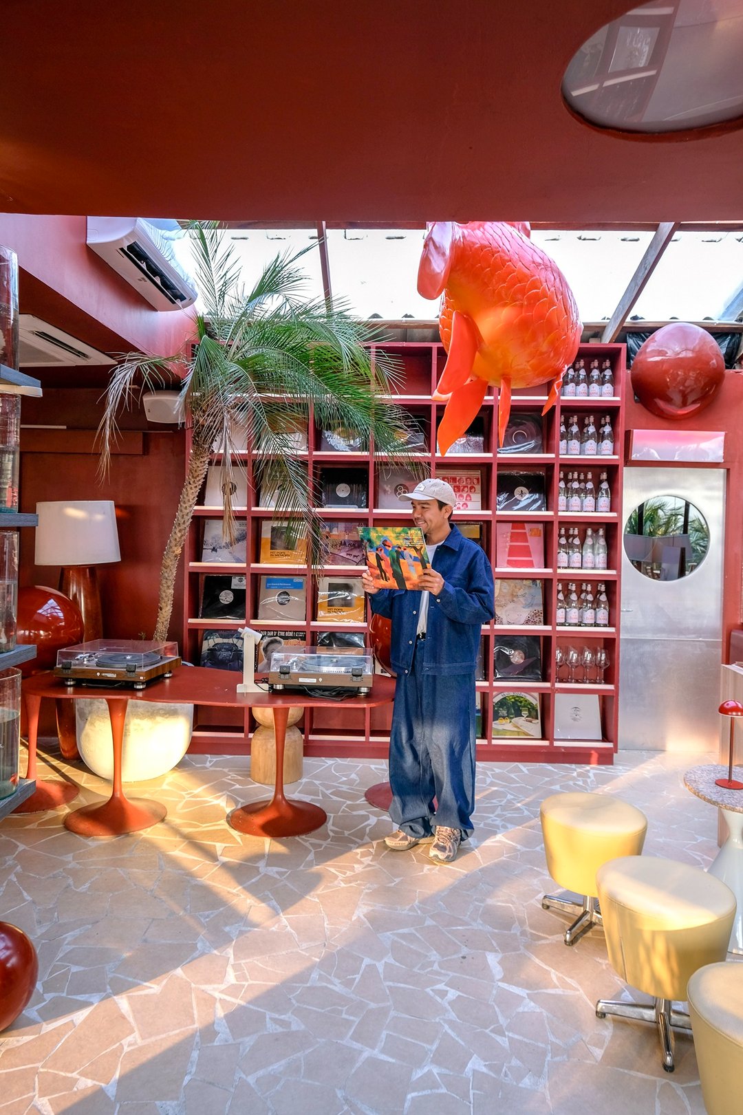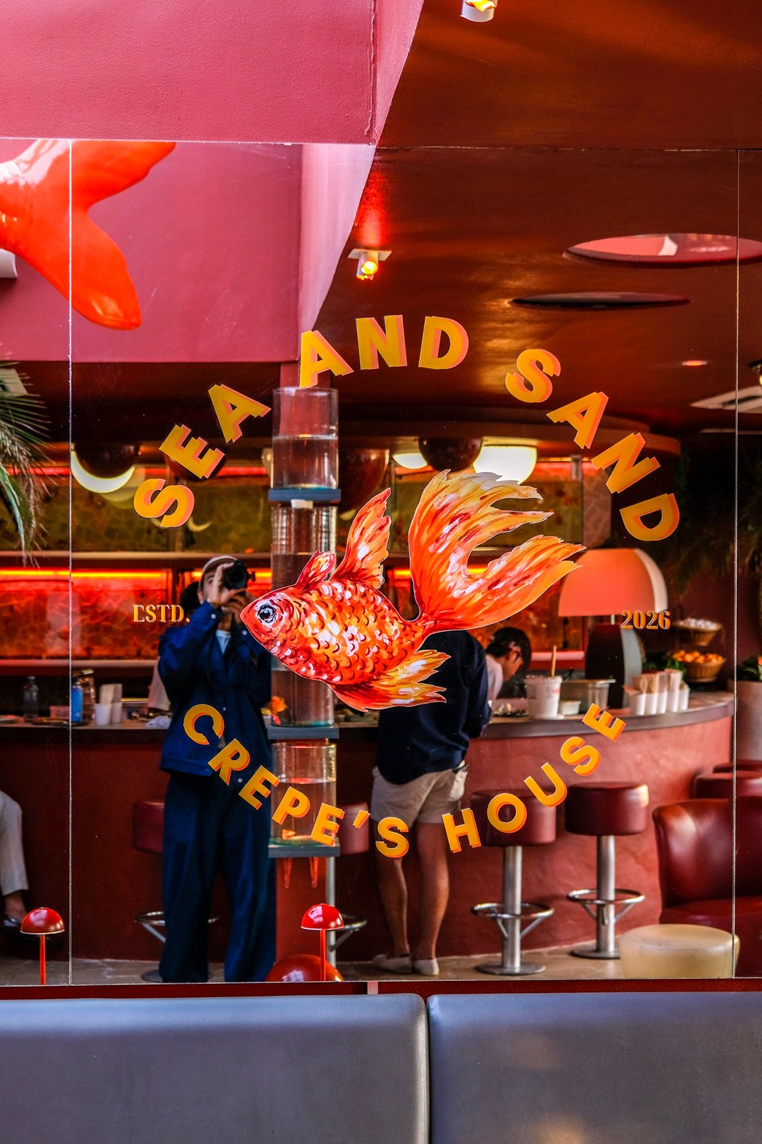 ที่นี่เป็นคาเฟ่กึ่งบาร์ริมทะเลในสไตล์ Mid-Century Modern ตกแต่งด้วยโทนแดงจัดจ้าน ตัดกับสีฟ้าของทะเล มี installation น้องปลาทอง ลอยกลางอากาศที่กลายเป็นซิกเนเจอร์ กับมุมเคาน์เตอร์ที่มีตู้ปลาทองตัวจริงแหวกว่ายท่ามกลางแสงไฟสีแดง โคตรจึ้ง ถ่ายรูปมุมไหนก็สวย เหมือนวาร์ปไปต่างประเทศเลยครับ