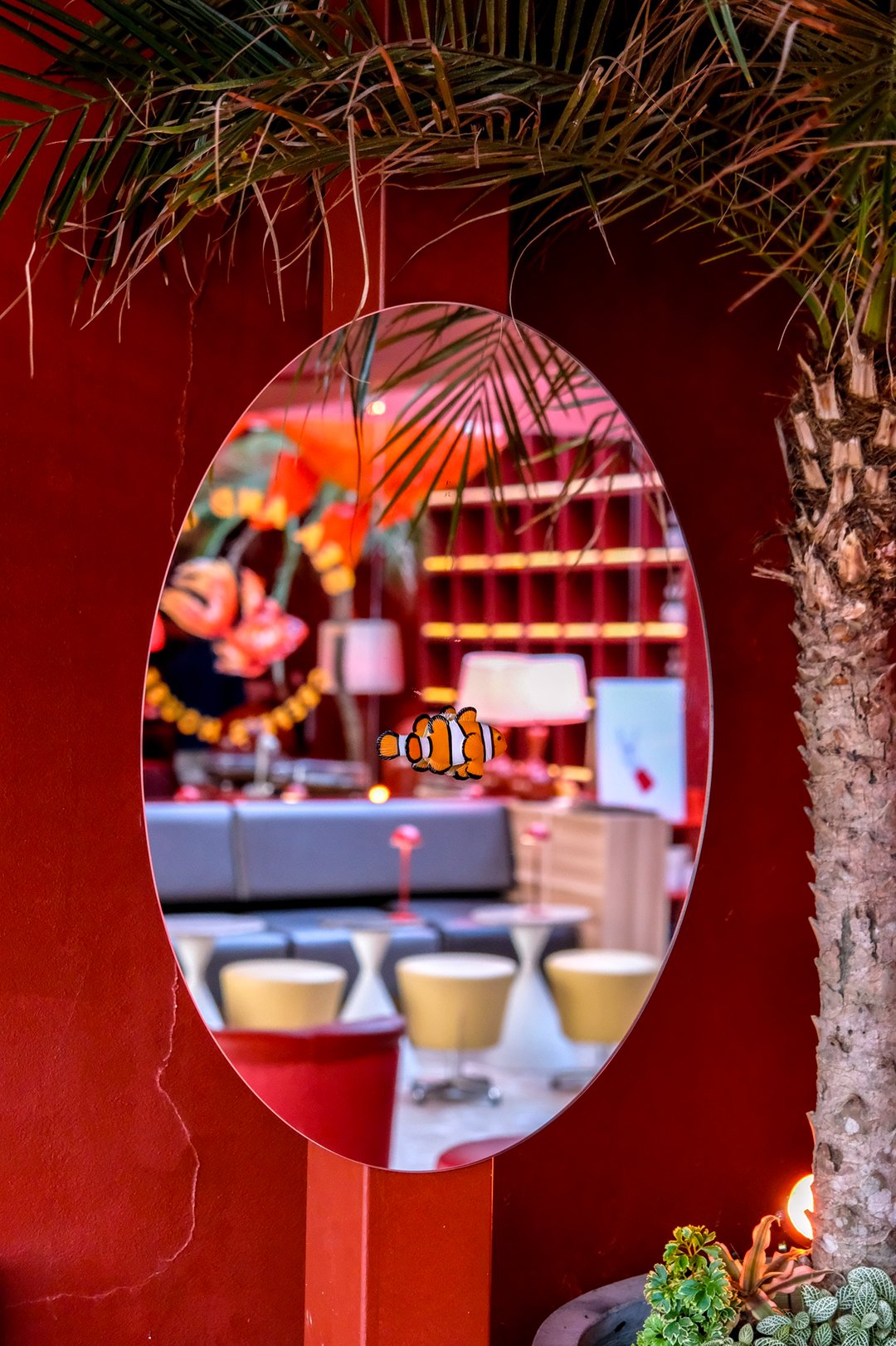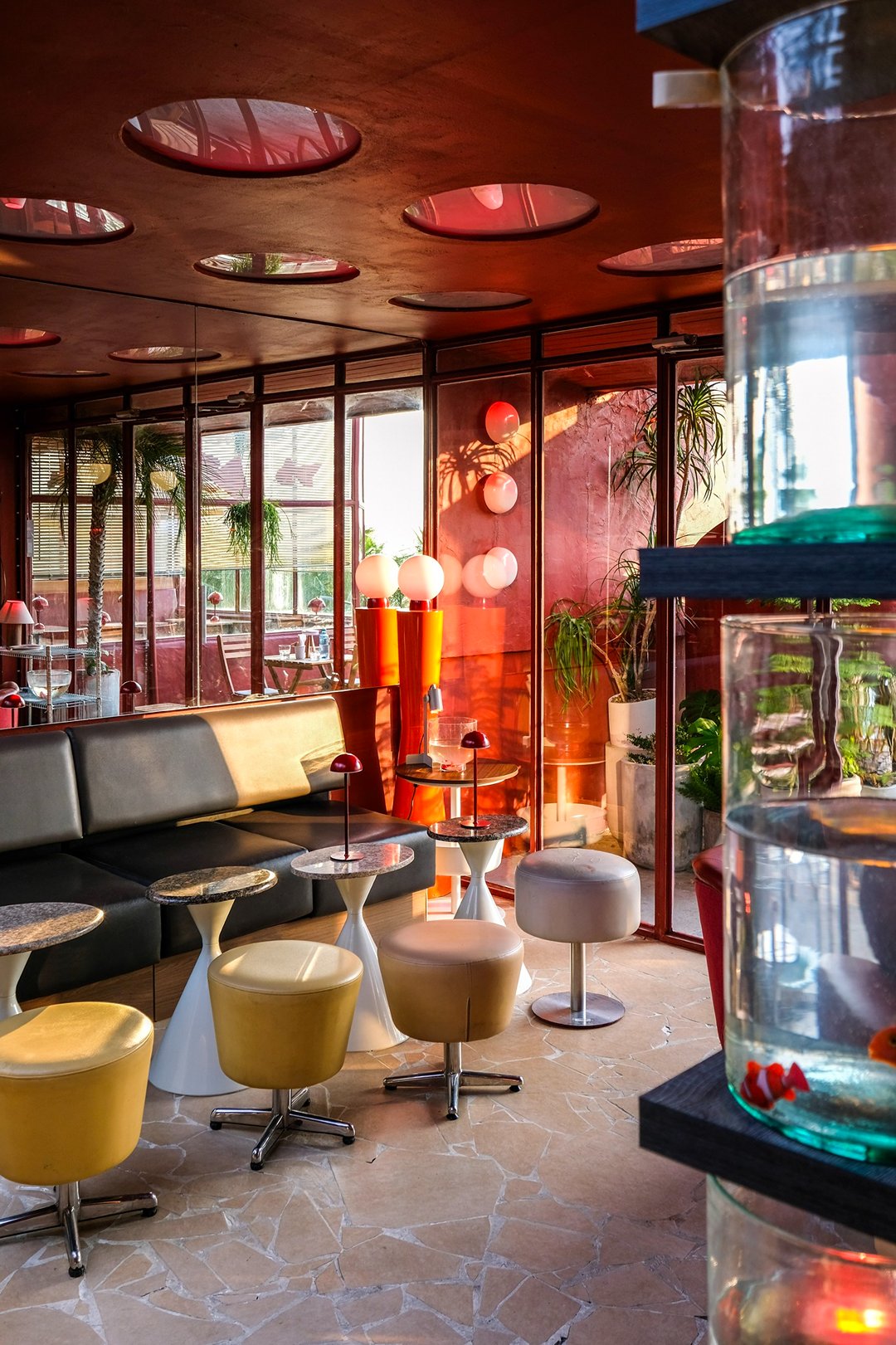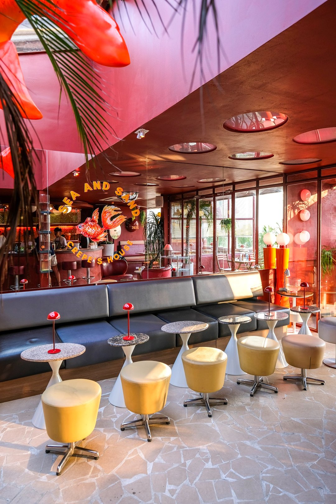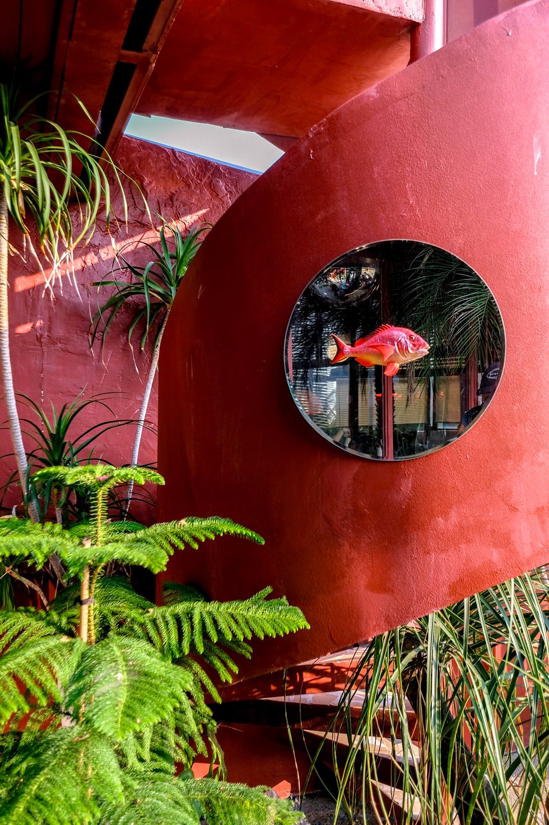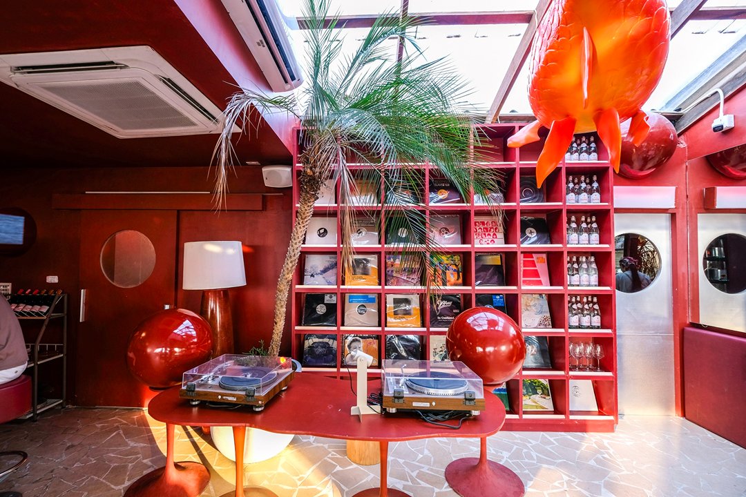 ที่นี่เป็นคาเฟ่กึ่งบาร์ริมทะเลในสไตล์ Mid-Century Modern ตกแต่งด้วยโทนแดงจัดจ้าน ตัดกับสีฟ้าของทะเล มี installation น้องปลาทอง ลอยกลางอากาศที่กลายเป็นซิกเนเจอร์ กับมุมเคาน์เตอร์ที่มีตู้ปลาทองตัวจริงแหวกว่ายท่ามกลางแสงไฟสีแดง โคตรจึ้ง ถ่ายรูปมุมไหนก็สวย เหมือนวาร์ปไปต่างประเทศเลยครับ