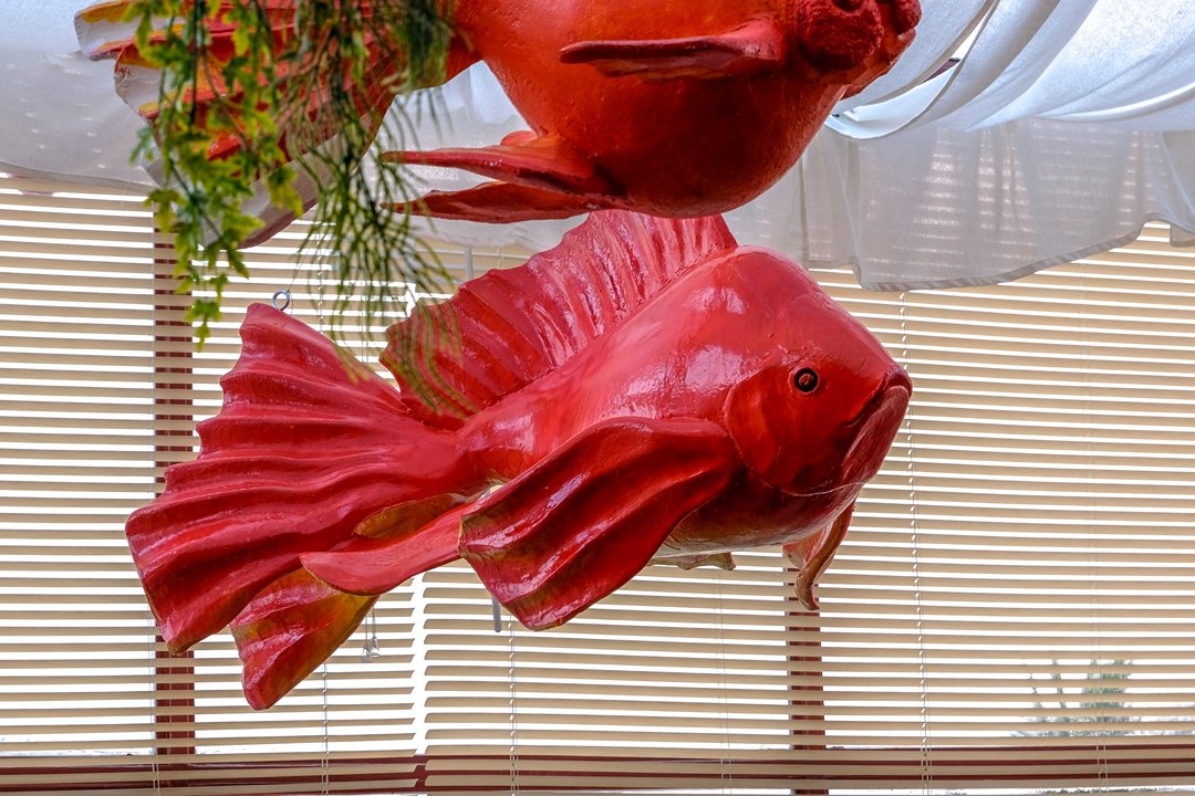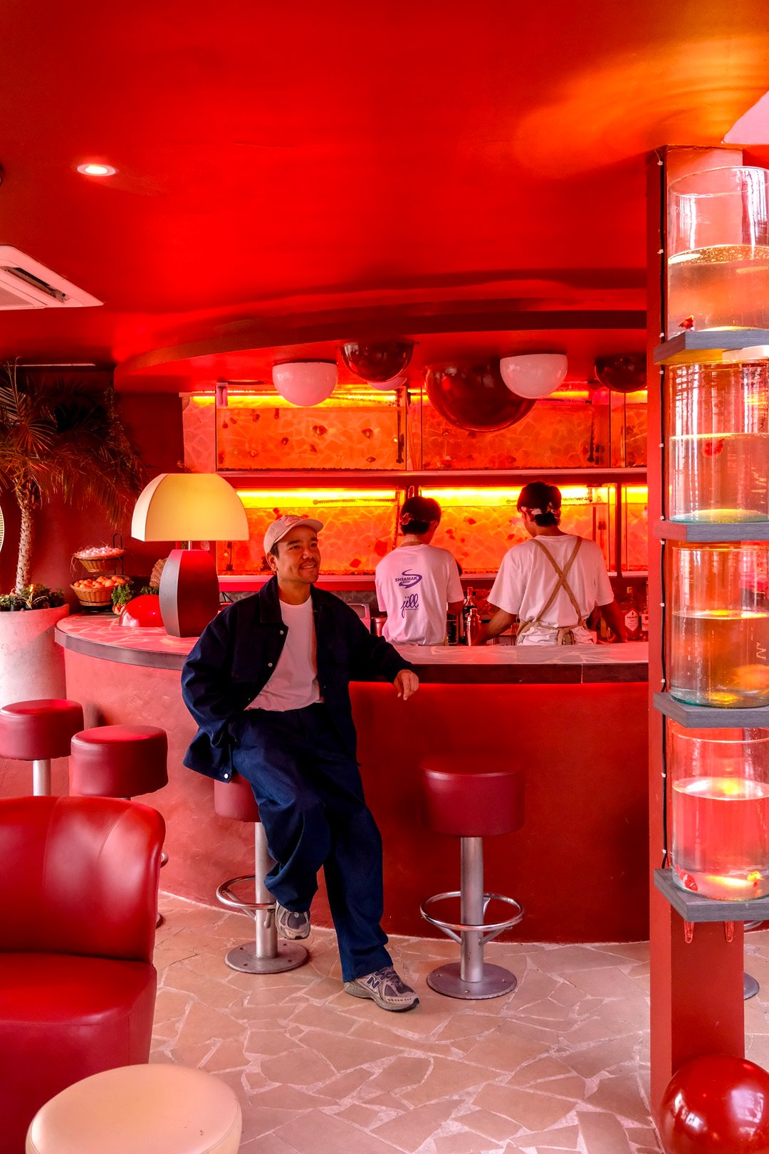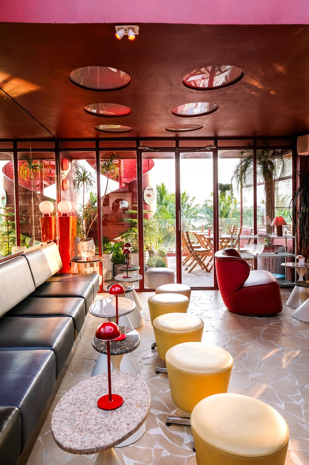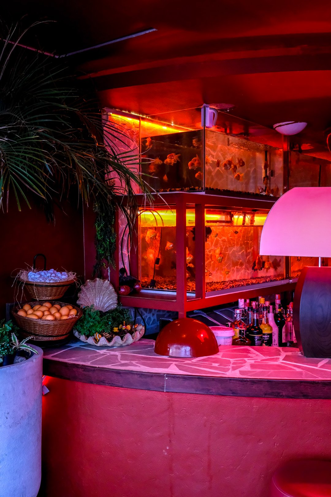 ที่นี่เป็นคาเฟ่กึ่งบาร์ริมทะเลในสไตล์ Mid-Century Modern ตกแต่งด้วยโทนแดงจัดจ้าน ตัดกับสีฟ้าของทะเล มี installation น้องปลาทอง ลอยกลางอากาศที่กลายเป็นซิกเนเจอร์ กับมุมเคาน์เตอร์ที่มีตู้ปลาทองตัวจริงแหวกว่ายท่ามกลางแสงไฟสีแดง โคตรจึ้ง ถ่ายรูปมุมไหนก็สวย เหมือนวาร์ปไปต่างประเทศเลยครับ