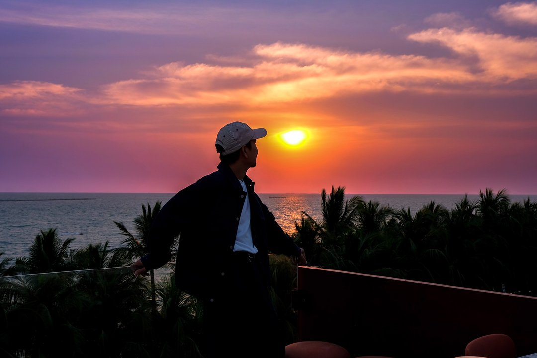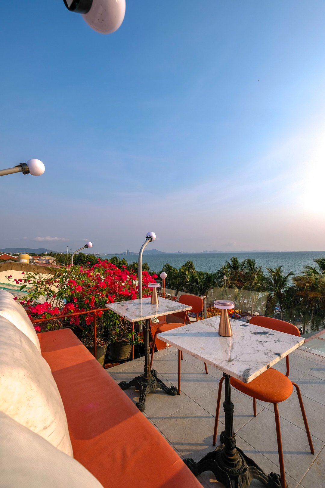 ใครแวะมาช่วงเย็นแนะนำเลือกโซนโต๊ะริมระเบียงคือฮอตสุดๆ เพราะตรงนี้คือหนึ่งในจุดชมพระอาทิตย์ตกที่สวยที่สุดของบางแสน นั่งฟังเพลง จิบเครื่องดื่ม ดูแสงสุดท้ายของวันรับรองแสงดี สวยฉ่ำสุดๆ