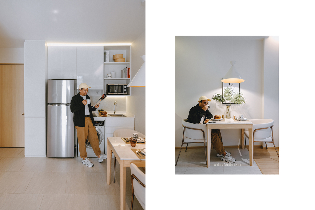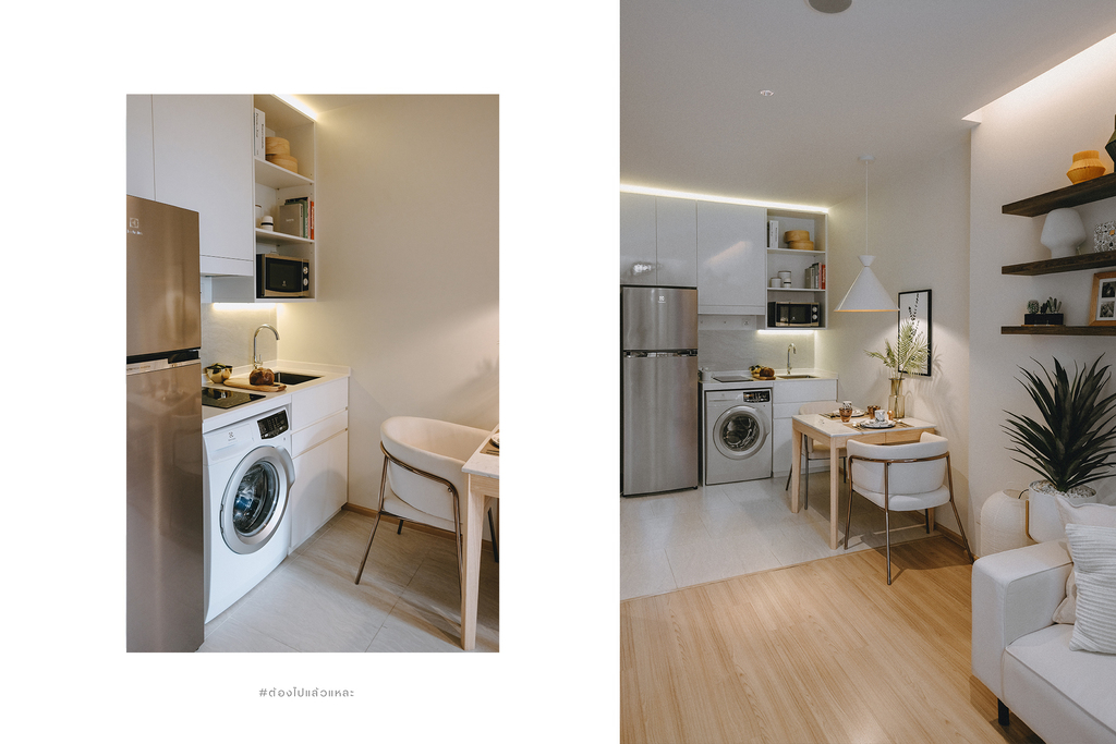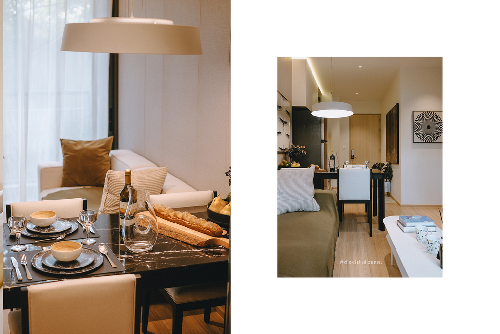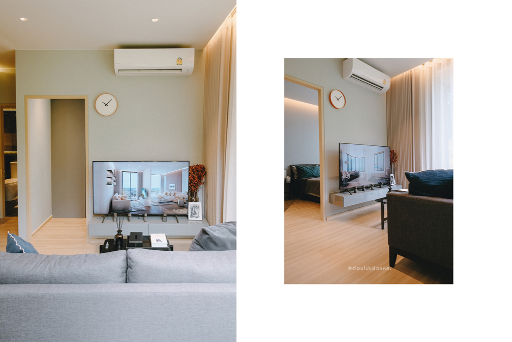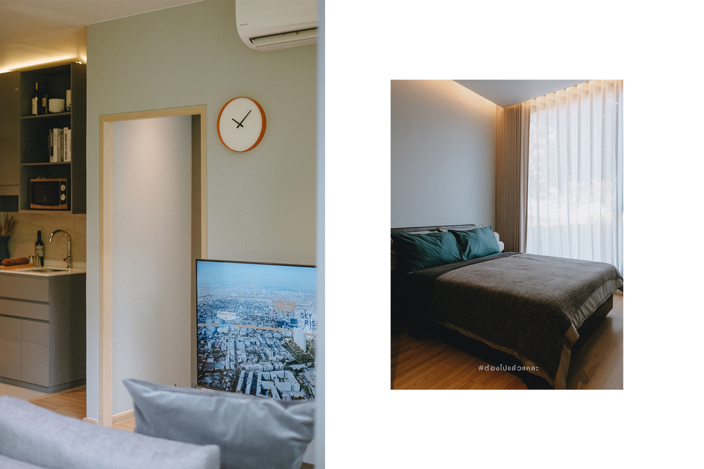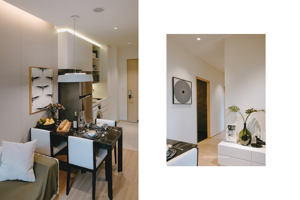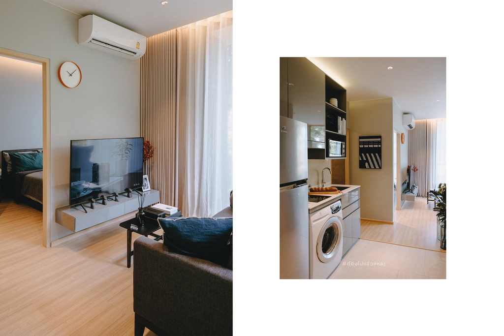 ส่วนตัวเราชอบภายในห้องขนาด 35 ตร.ม. 1 ห้องนอน 1 ห้องน้ำ เป็นห้องหน้ากว้าง ยกเพดานสูง ถึง 2.65 ม. ทำให้ห้องดูโปร่ง มีครัวแบบเปิดเพื่อเชื่อมต่อกับพื้นที่ Dinning และห้องน้ำได้จากห้องนี้ ภายในห้องมีการแบ่ง Space จัดสรรพื้นที่ออกมาได้อย่างดี ทุกสัดส่วนลงตัว ตอบโจทย์การใช้งานได้จริงทุกพื้นที่ เหมาะสำหรับคนรุ่นใหม่ที่กำลังมองหาคอนโด เราชอบห้องนี้ที่มีแสงเข้าช่วงบ่าย แสงเงาสาดเข้ามาในห้องเหมาะกับไลฟ์สไตล์แบบเราที่ชอบการถ่ายรูปเป็นอย่างมาก
