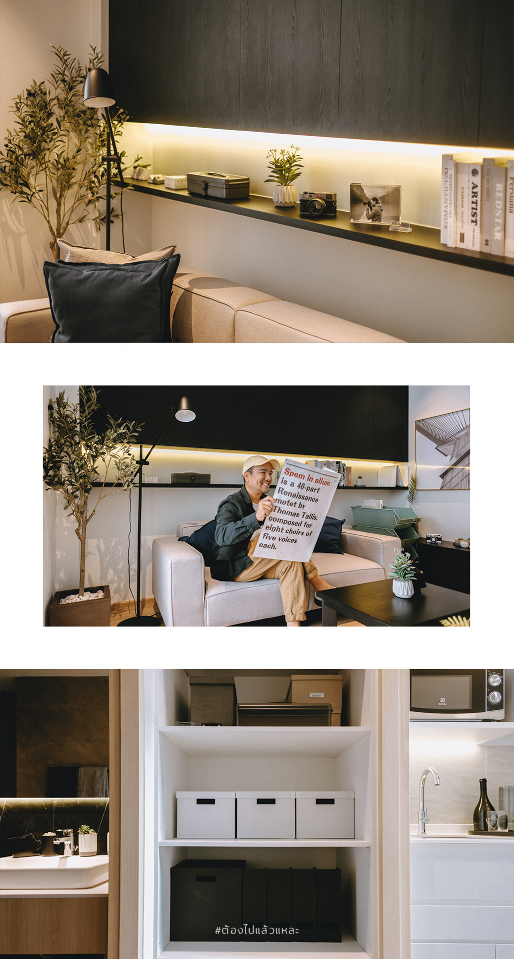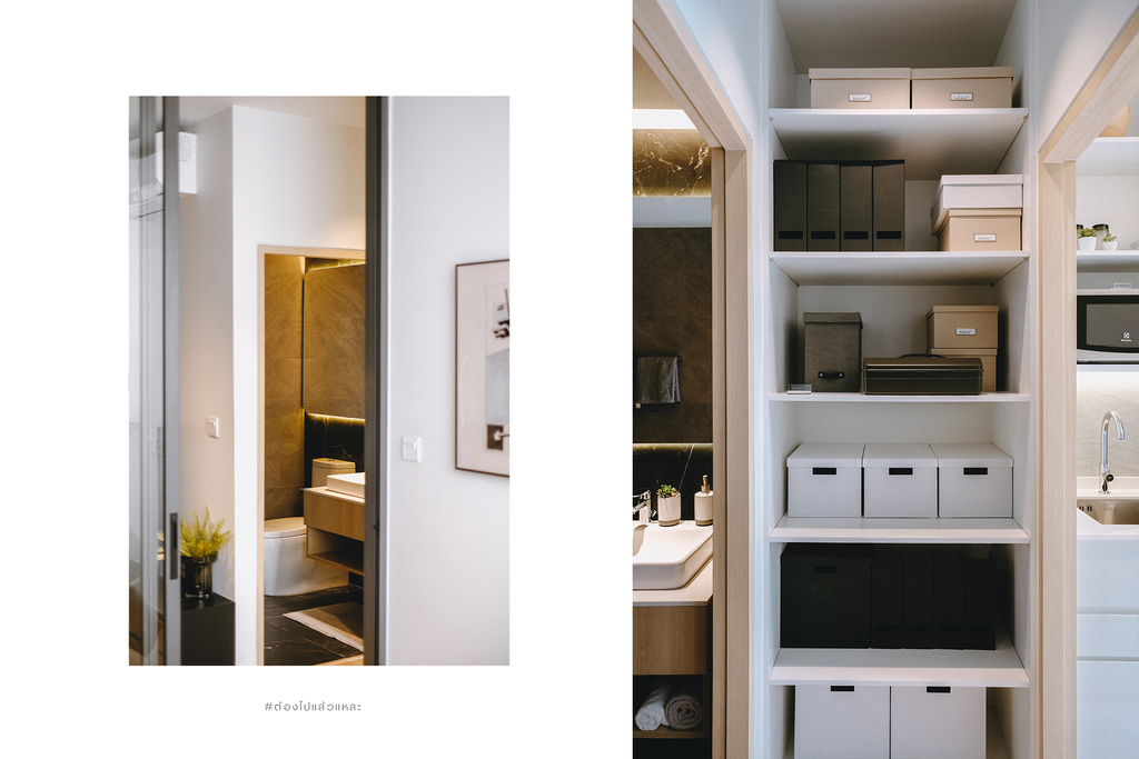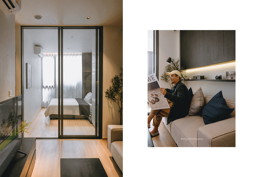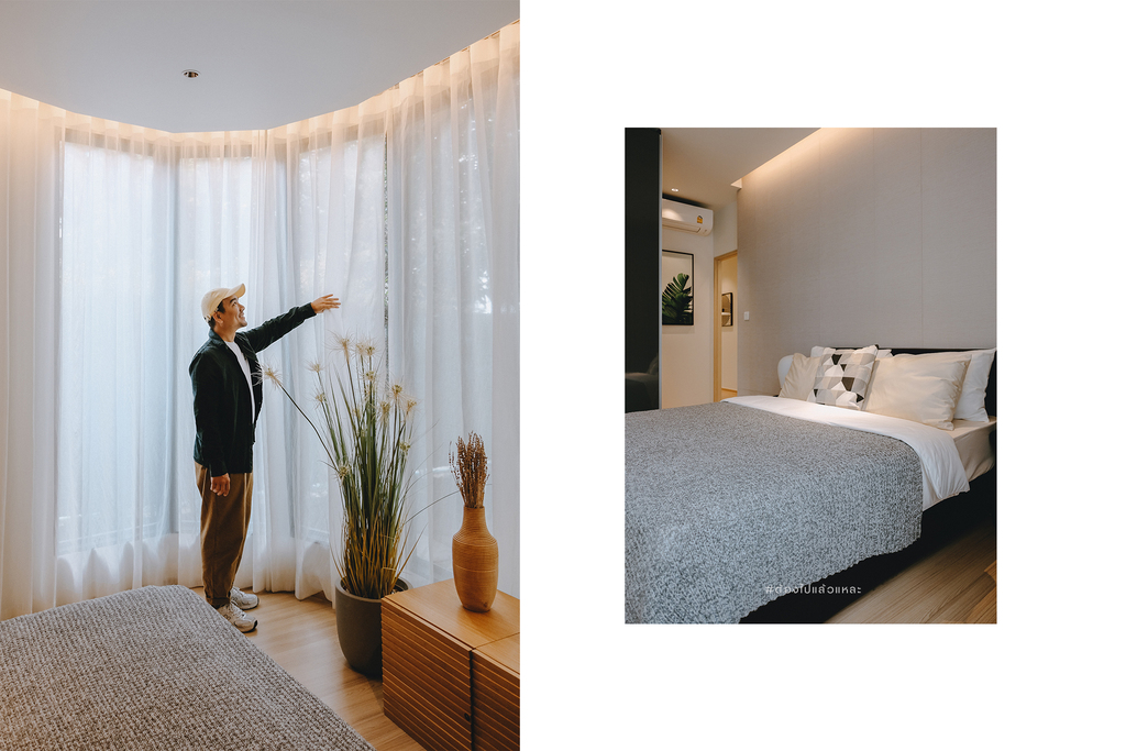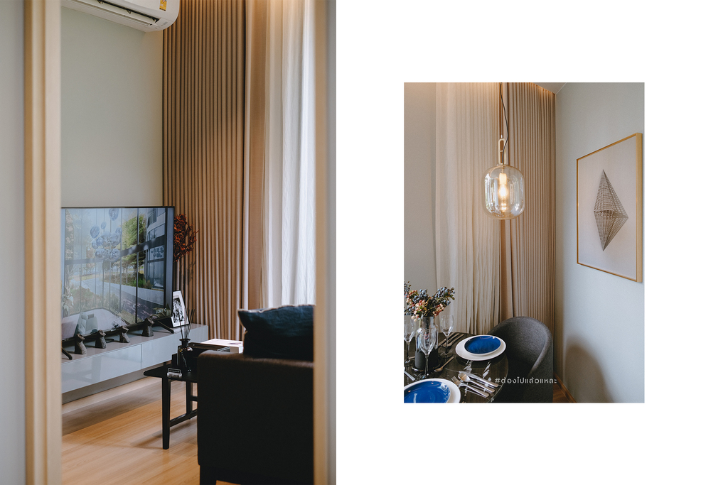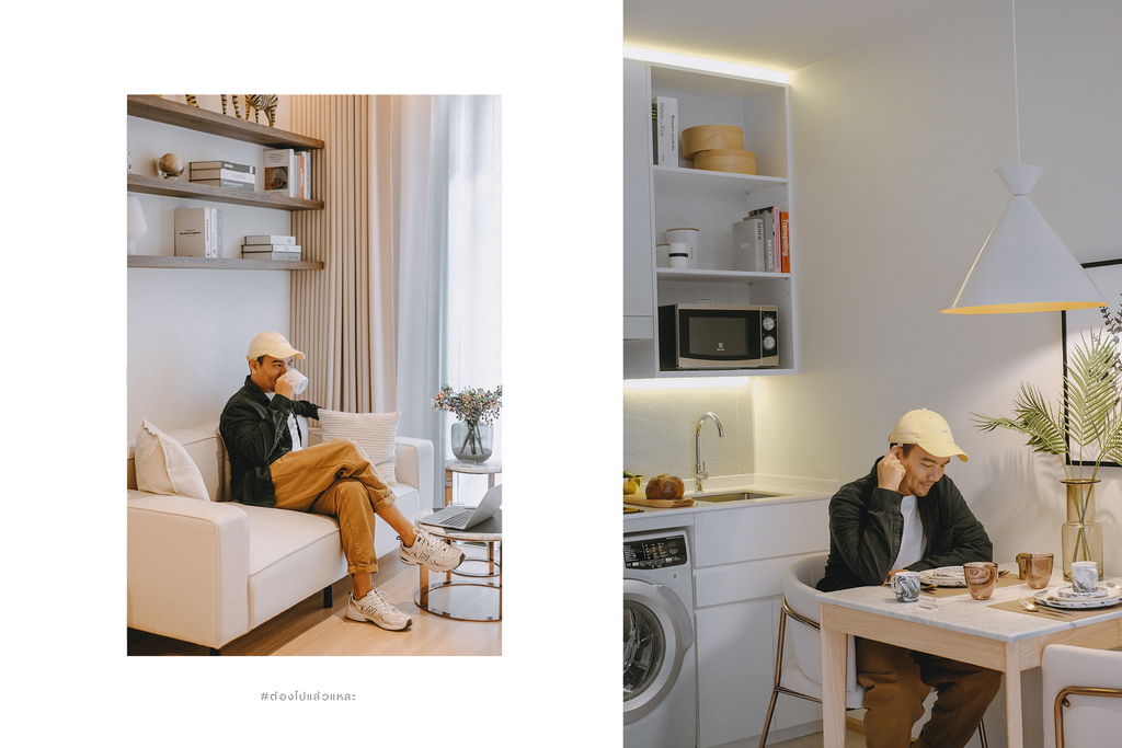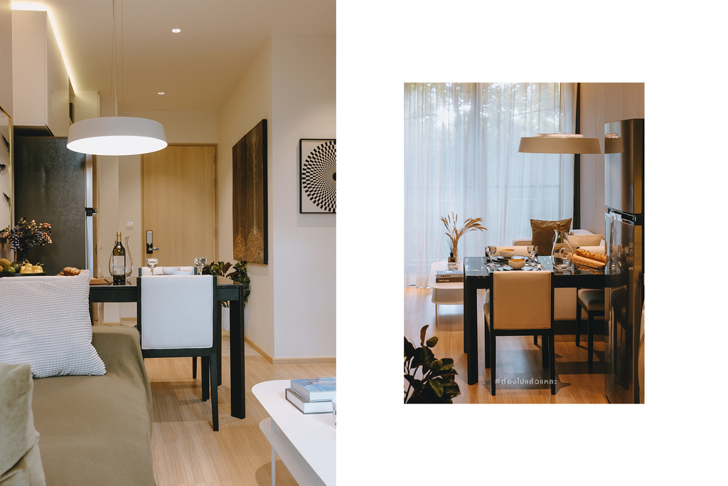 ส่วนตัวเราชอบภายในห้องขนาด 35 ตร.ม. 1 ห้องนอน 1 ห้องน้ำ เป็นห้องหน้ากว้าง ยกเพดานสูง ถึง 2.65 ม. ทำให้ห้องดูโปร่ง มีครัวแบบเปิดเพื่อเชื่อมต่อกับพื้นที่ Dinning และห้องน้ำได้จากห้องนี้ ภายในห้องมีการแบ่ง Space จัดสรรพื้นที่ออกมาได้อย่างดี ทุกสัดส่วนลงตัว ตอบโจทย์การใช้งานได้จริงทุกพื้นที่ เหมาะสำหรับคนรุ่นใหม่ที่กำลังมองหาคอนโด เราชอบห้องนี้ที่มีแสงเข้าช่วงบ่าย แสงเงาสาดเข้ามาในห้องเหมาะกับไลฟ์สไตล์แบบเราที่ชอบการถ่ายรูปเป็นอย่างมาก