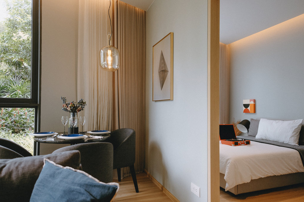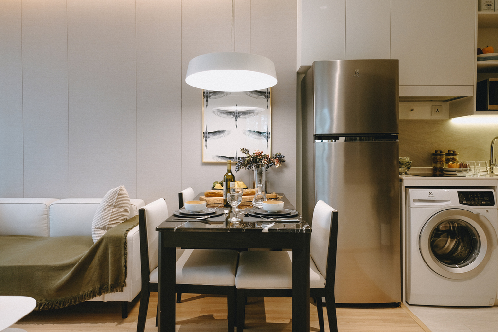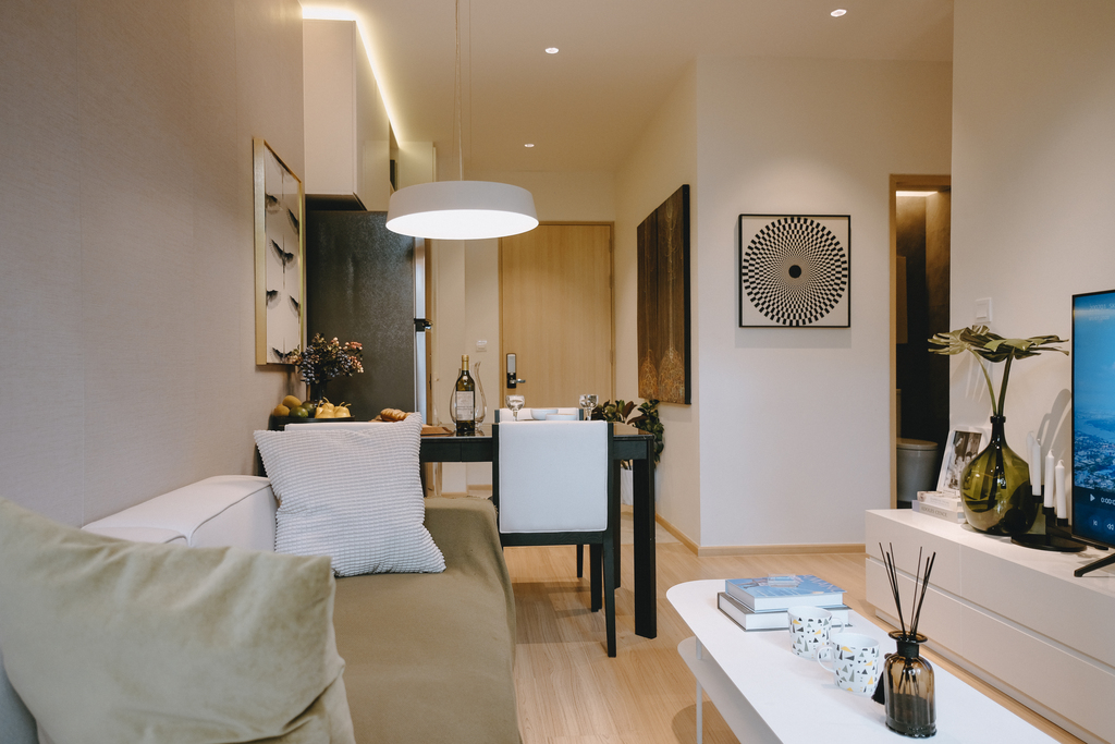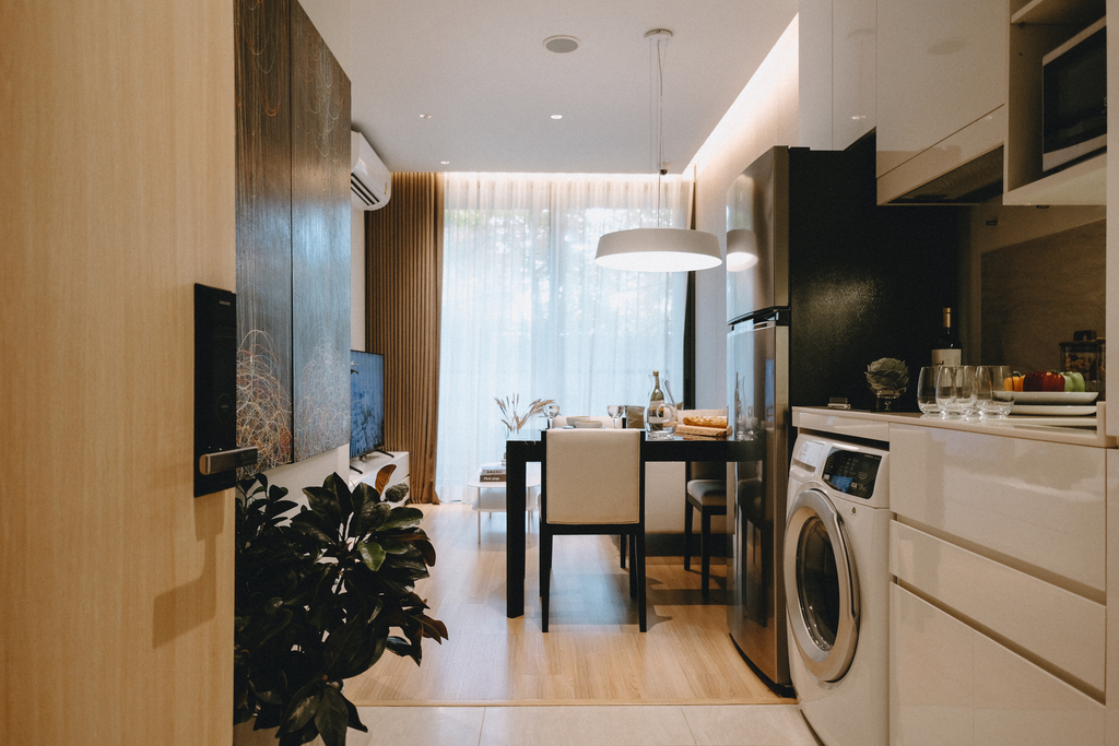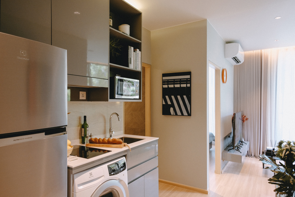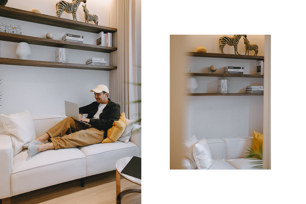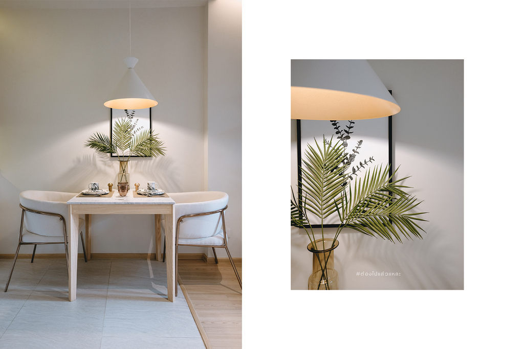 ส่วนตัวเราชอบภายในห้องขนาด 35 ตร.ม. 1 ห้องนอน 1 ห้องน้ำ เป็นห้องหน้ากว้าง ยกเพดานสูง ถึง 2.65 ม. ทำให้ห้องดูโปร่ง มีครัวแบบเปิดเพื่อเชื่อมต่อกับพื้นที่ Dinning และห้องน้ำได้จากห้องนี้ ภายในห้องมีการแบ่ง Space จัดสรรพื้นที่ออกมาได้อย่างดี ทุกสัดส่วนลงตัว ตอบโจทย์การใช้งานได้จริงทุกพื้นที่ เหมาะสำหรับคนรุ่นใหม่ที่กำลังมองหาคอนโด เราชอบห้องนี้ที่มีแสงเข้าช่วงบ่าย แสงเงาสาดเข้ามาในห้องเหมาะกับไลฟ์สไตล์แบบเราที่ชอบการถ่ายรูปเป็นอย่างมาก