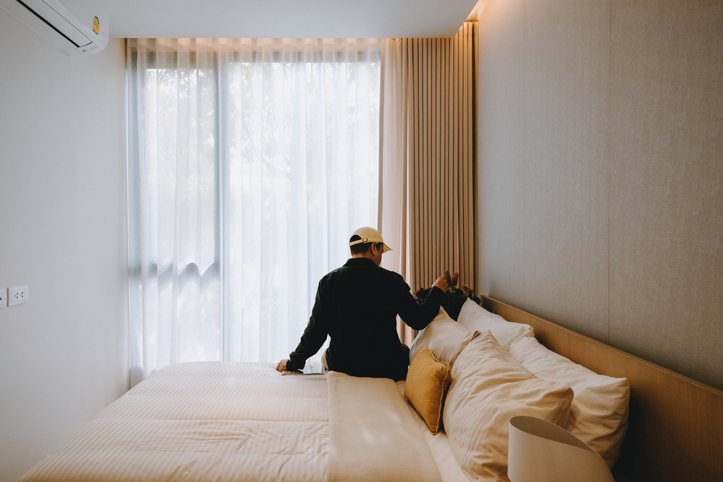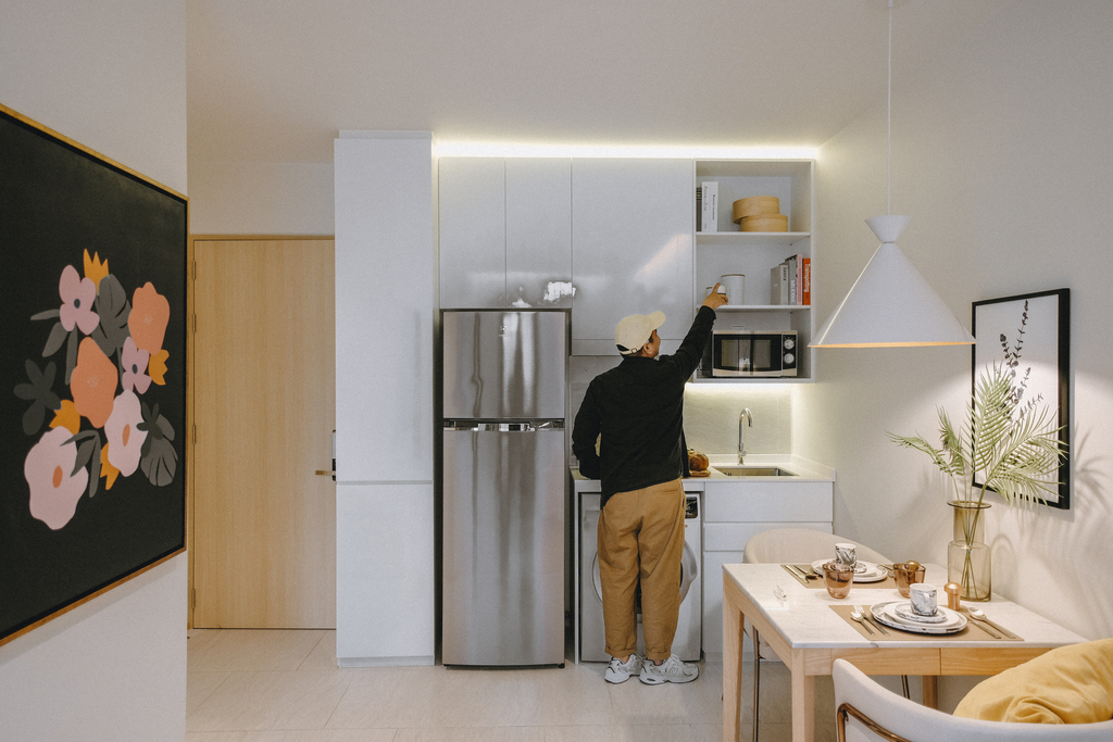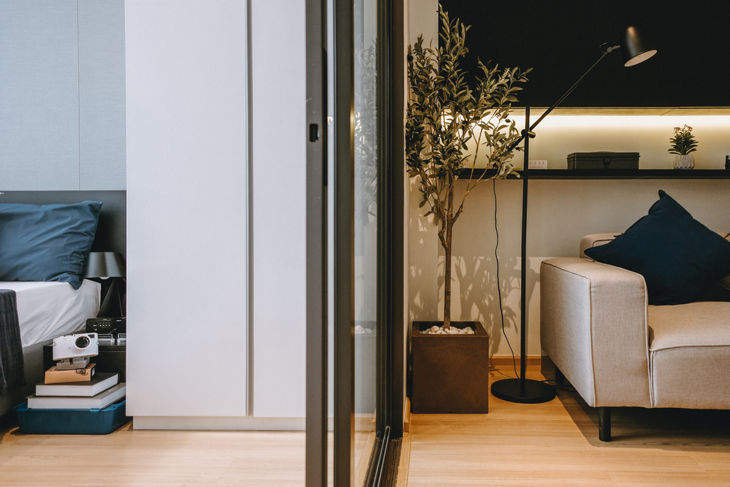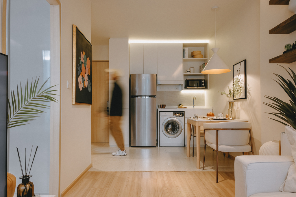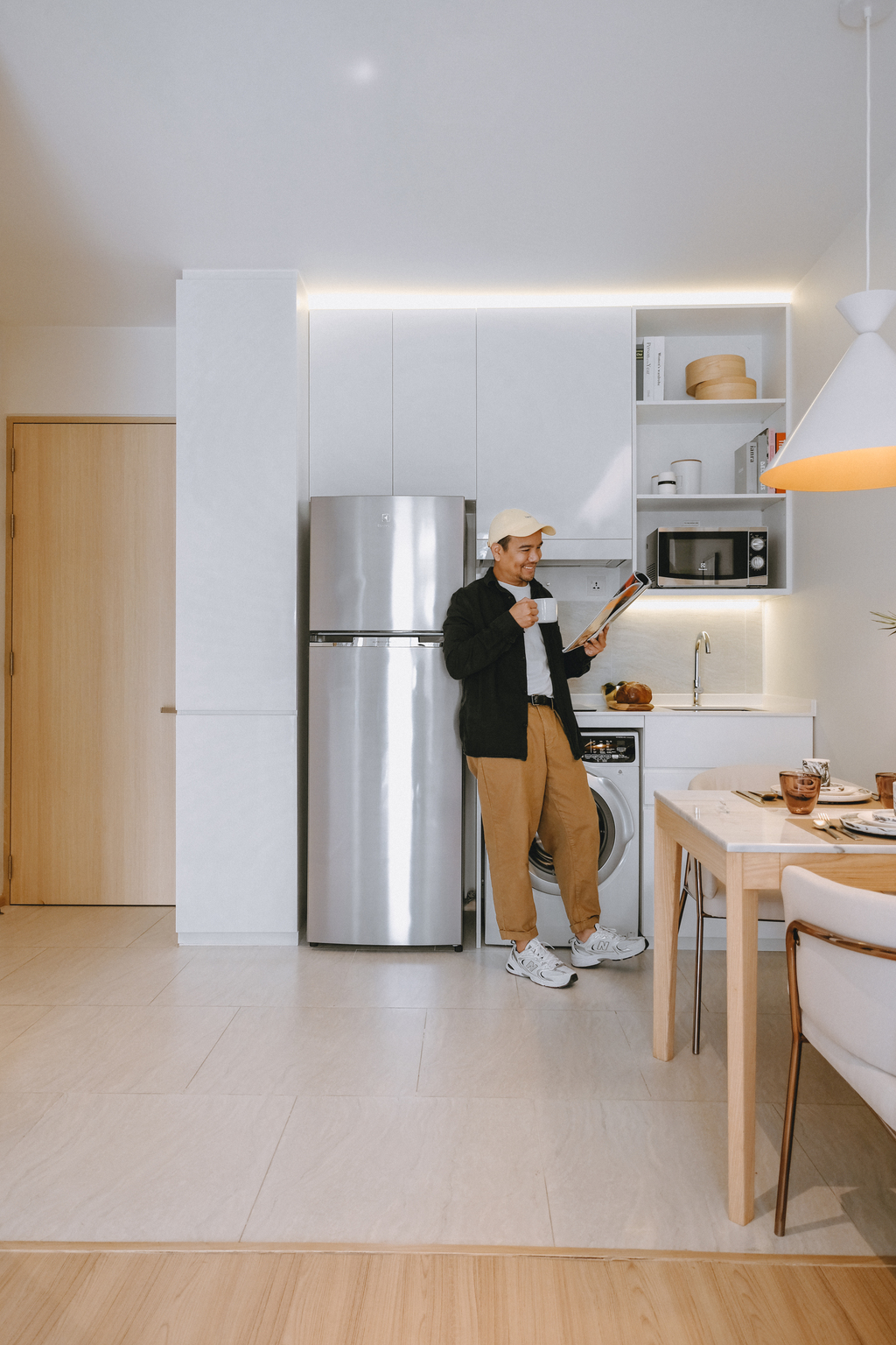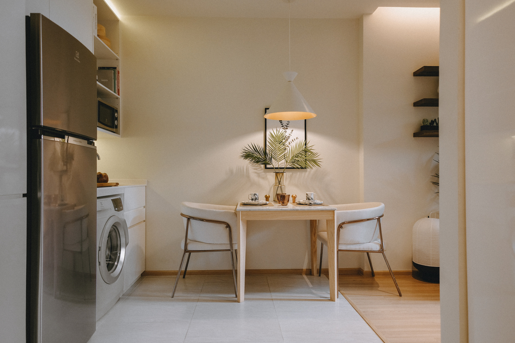 ส่วนตัวเราชอบภายในห้องขนาด 35 ตร.ม. 1 ห้องนอน 1 ห้องน้ำ เป็นห้องหน้ากว้าง ยกเพดานสูง ถึง 2.65 ม. ทำให้ห้องดูโปร่ง มีครัวแบบเปิดเพื่อเชื่อมต่อกับพื้นที่ Dinning และห้องน้ำได้จากห้องนี้ ภายในห้องมีการแบ่ง Space จัดสรรพื้นที่ออกมาได้อย่างดี ทุกสัดส่วนลงตัว ตอบโจทย์การใช้งานได้จริงทุกพื้นที่ เหมาะสำหรับคนรุ่นใหม่ที่กำลังมองหาคอนโด เราชอบห้องนี้ที่มีแสงเข้าช่วงบ่าย แสงเงาสาดเข้ามาในห้องเหมาะกับไลฟ์สไตล์แบบเราที่ชอบการถ่ายรูปเป็นอย่างมาก