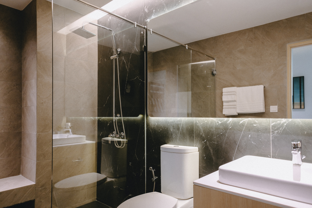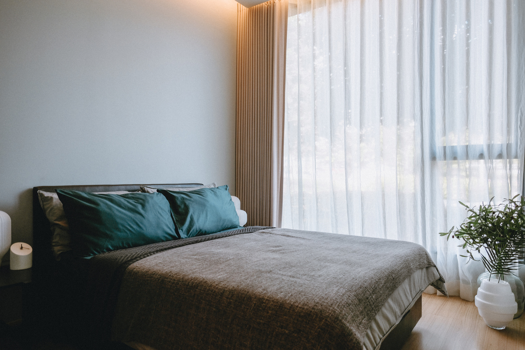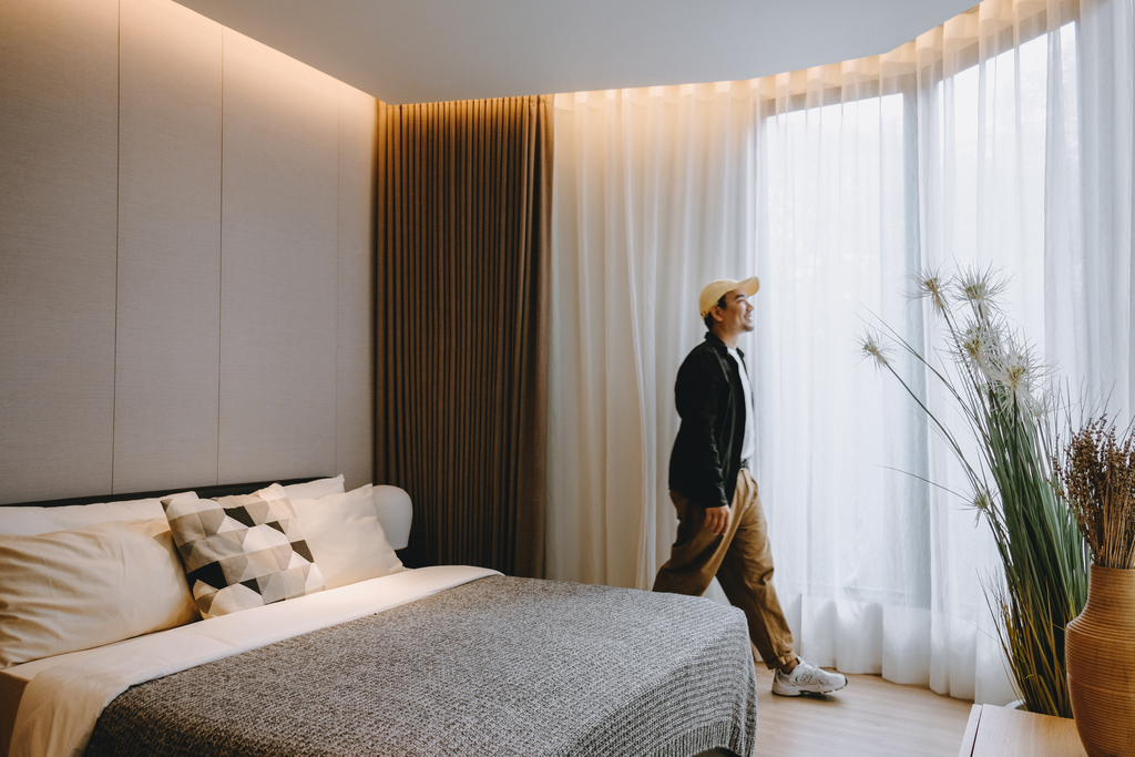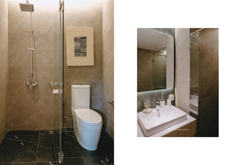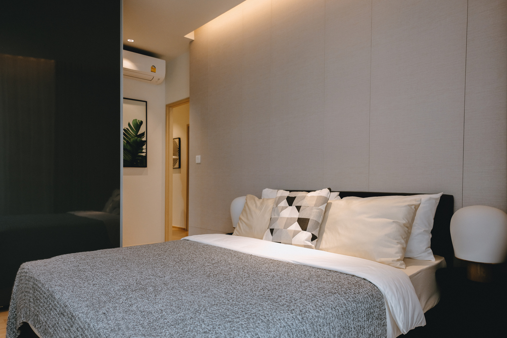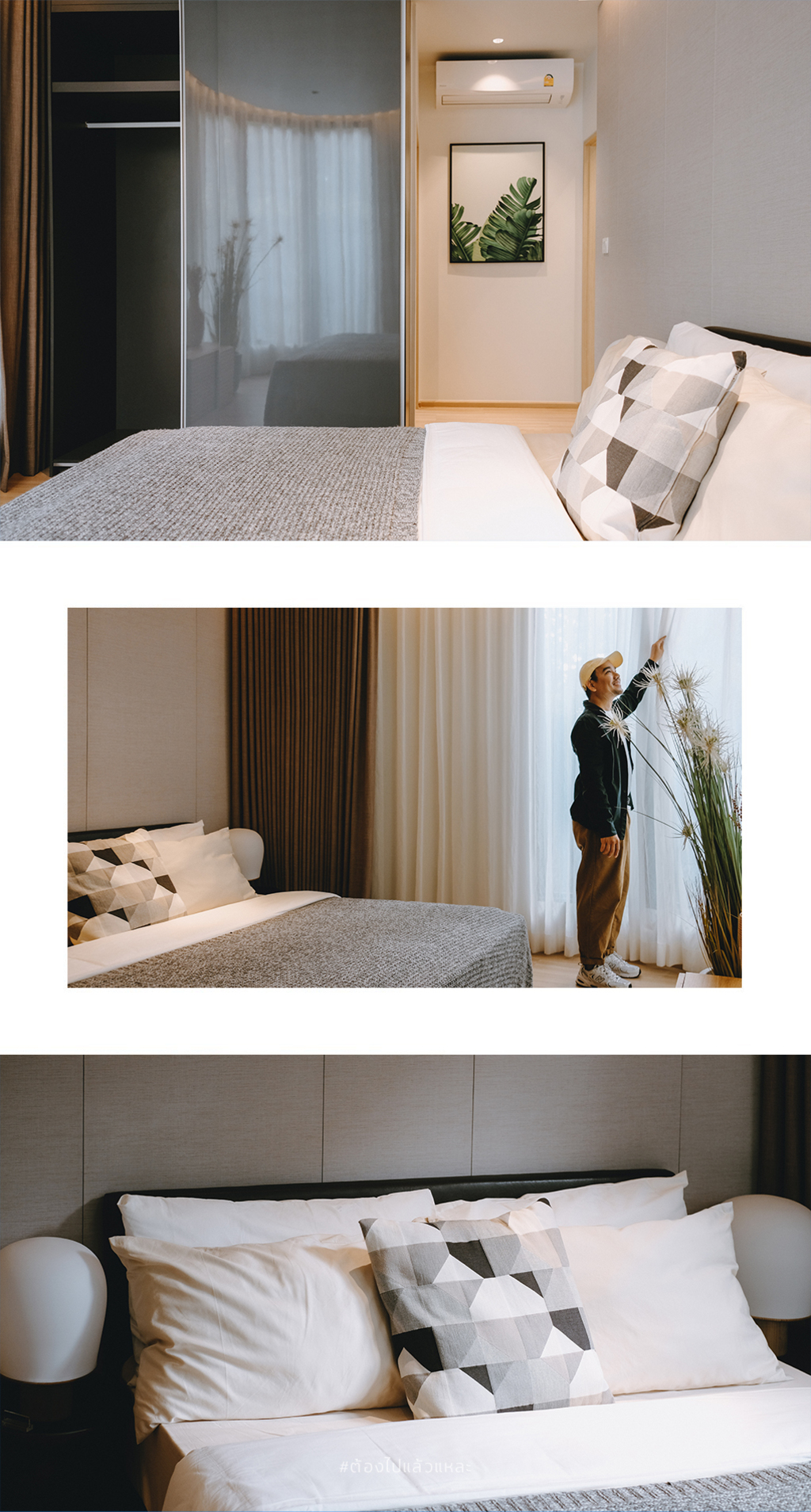 และอีกห้องที่ต้องร้องว้าว กับห้องขนาด 55 ตร.ม. 2 ห้องนอน 2 ห้องน้ำ ดีไซต์ Modern Minimal มีความเรียบง่าย ดูทันสมัย เข้ามาในห้องให้ความรู้สึกโปร่งโล่งสบาย มีแสงธรรมชาติเข้าทุกทิศทาง และที่สำคัญเพดานสูง ซึ่งห้อง Master Bedroom ของห้องนี้มีกระจกบานใหญ่แบบโค้งเข้ามุม สามารถ Take view วิวได้กว้างแบบ Panoramic กันเลยทีเดียวครับ และที่ประทับใจอีกอย่างคือตัวห้องน้ำที่มี ขนาดใหญ่ ตกแต่งสไตล์โมเดิร์น ให้ฟิลลิ่งเหมือนพักโรงแรมห้าดาว คือมันสวยมาก