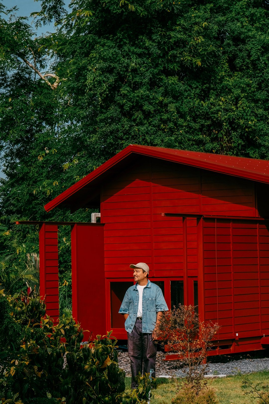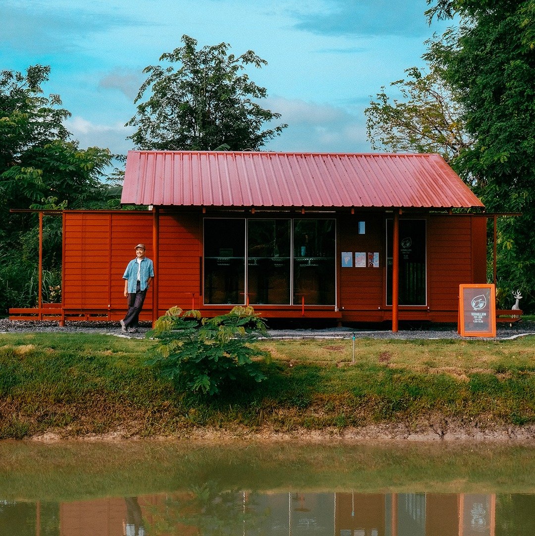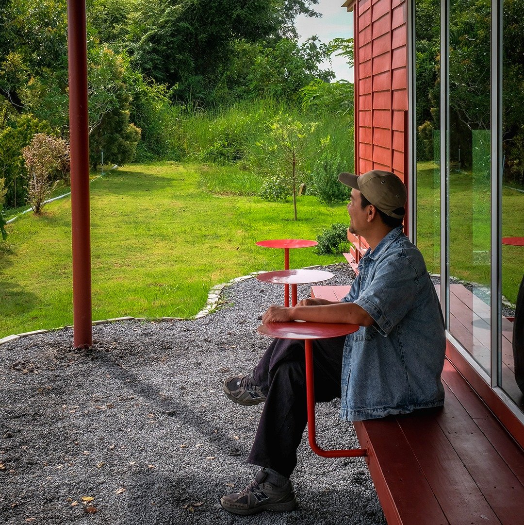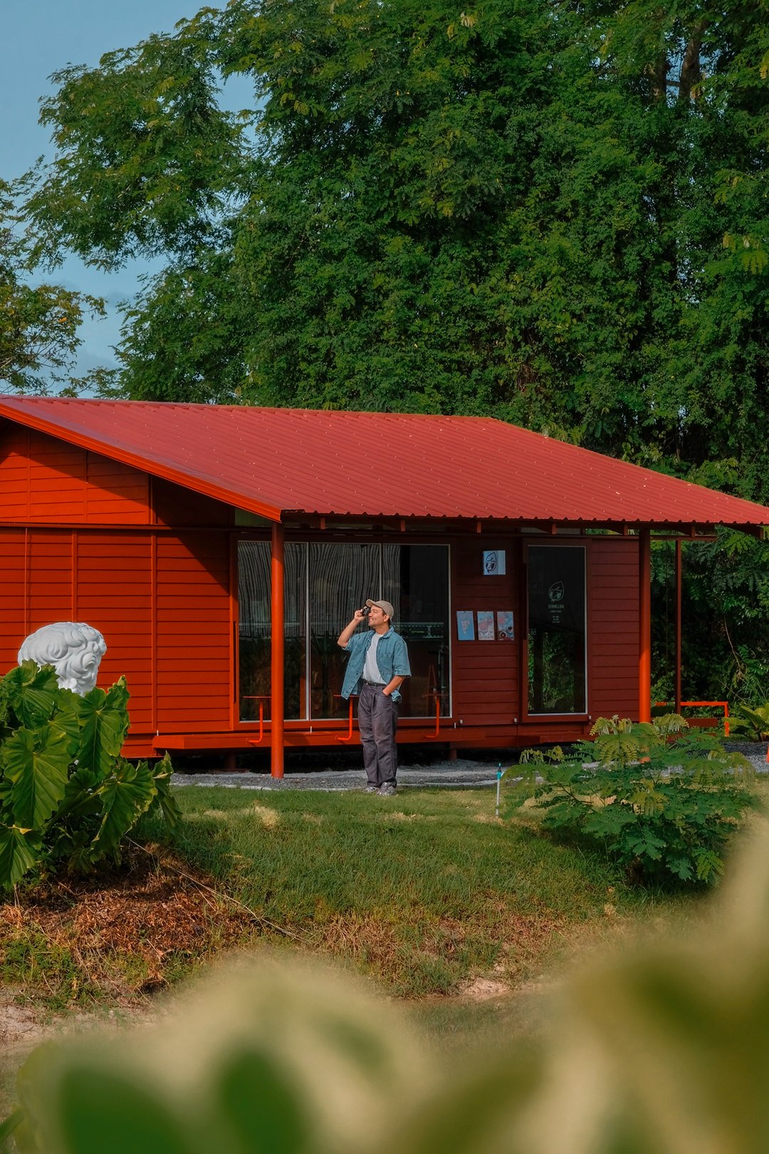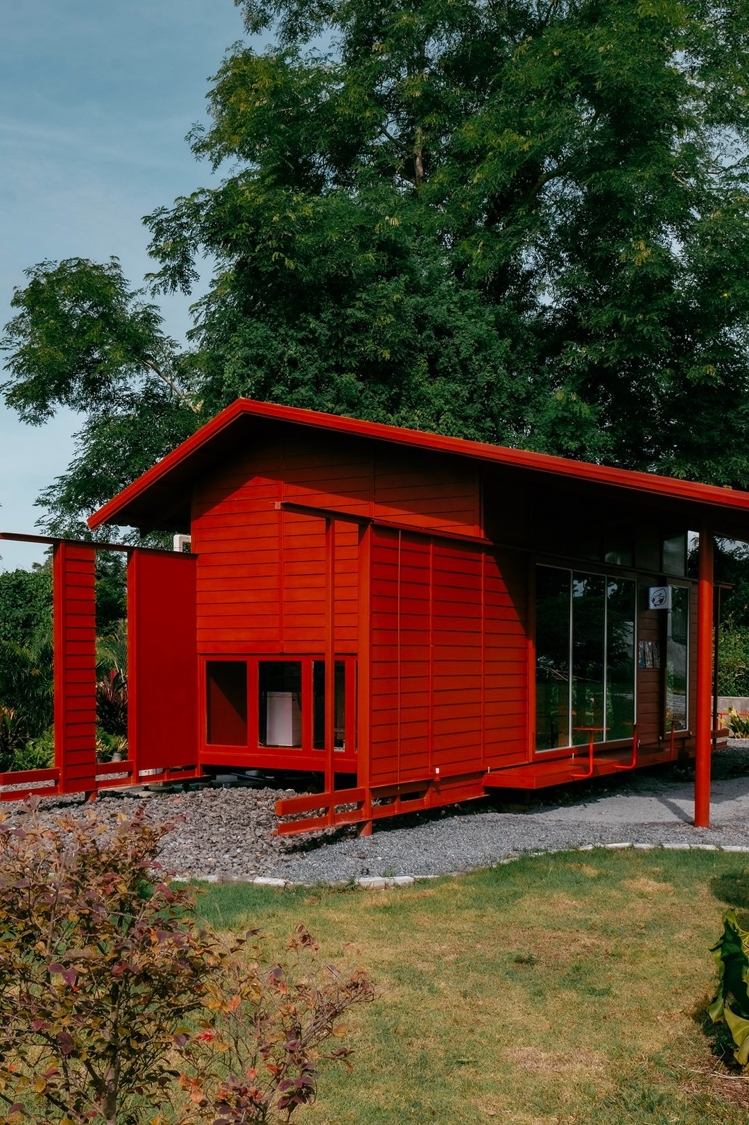 บ้านไม้สีแดงแบบโมโนโทน ตั้งอยู่กลางสวนสีเขียว เป็นคาเฟ่ที่เรียบง่าย แต่เต็มไปด้วยความตั้งใจ ออกแบบมาอย่างเข้าใจธรรมชาติ