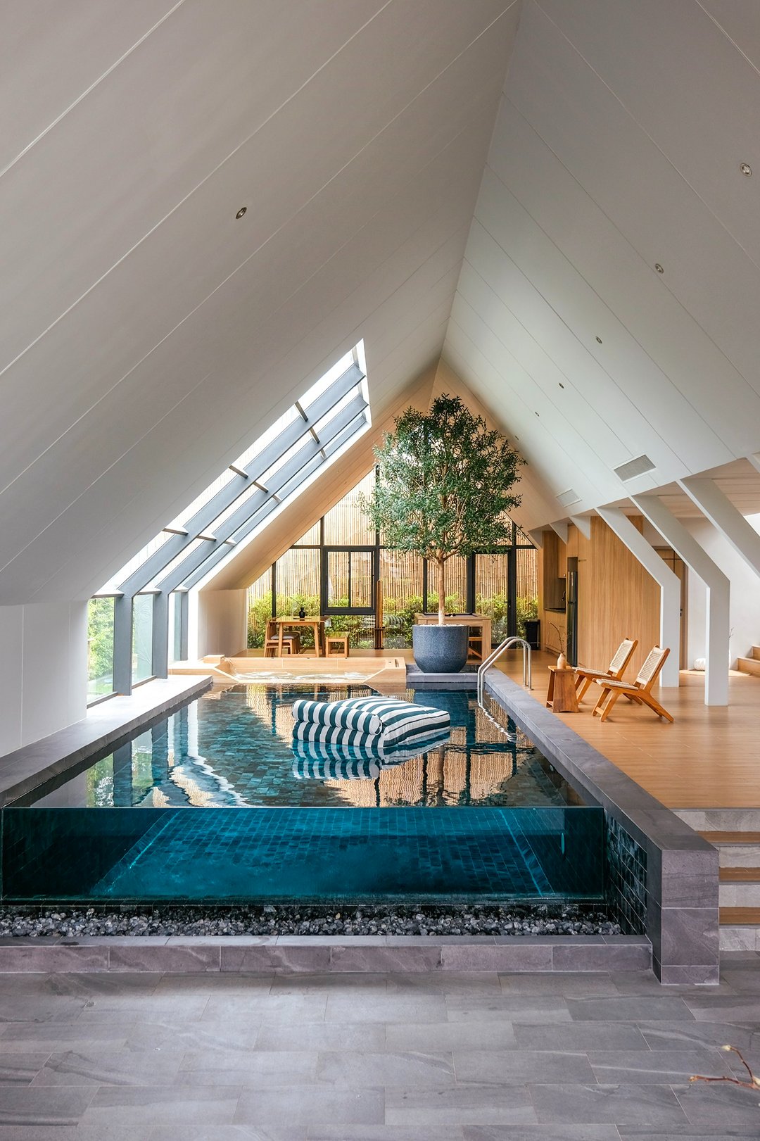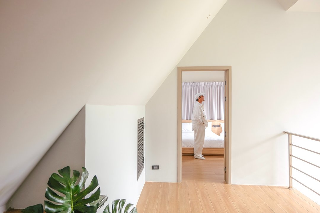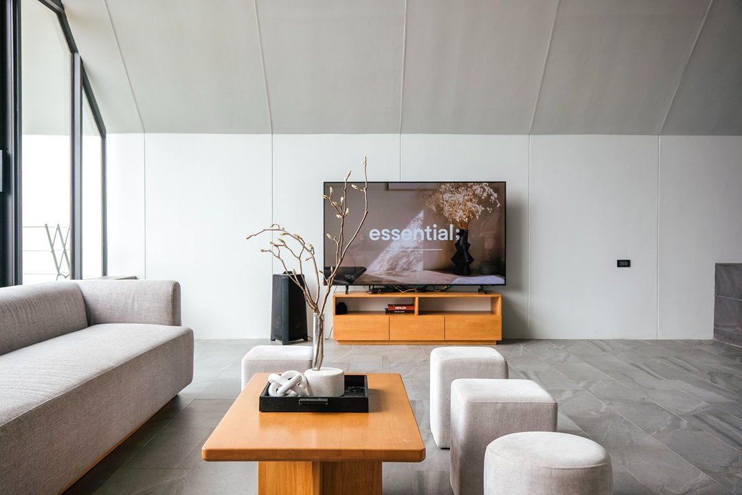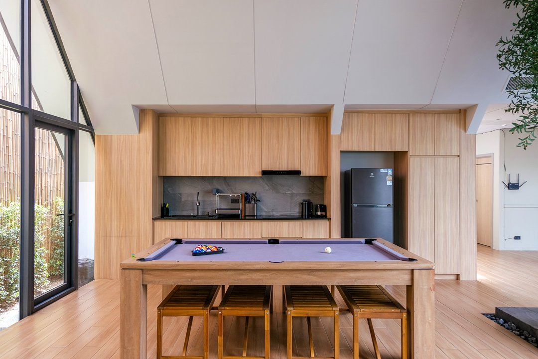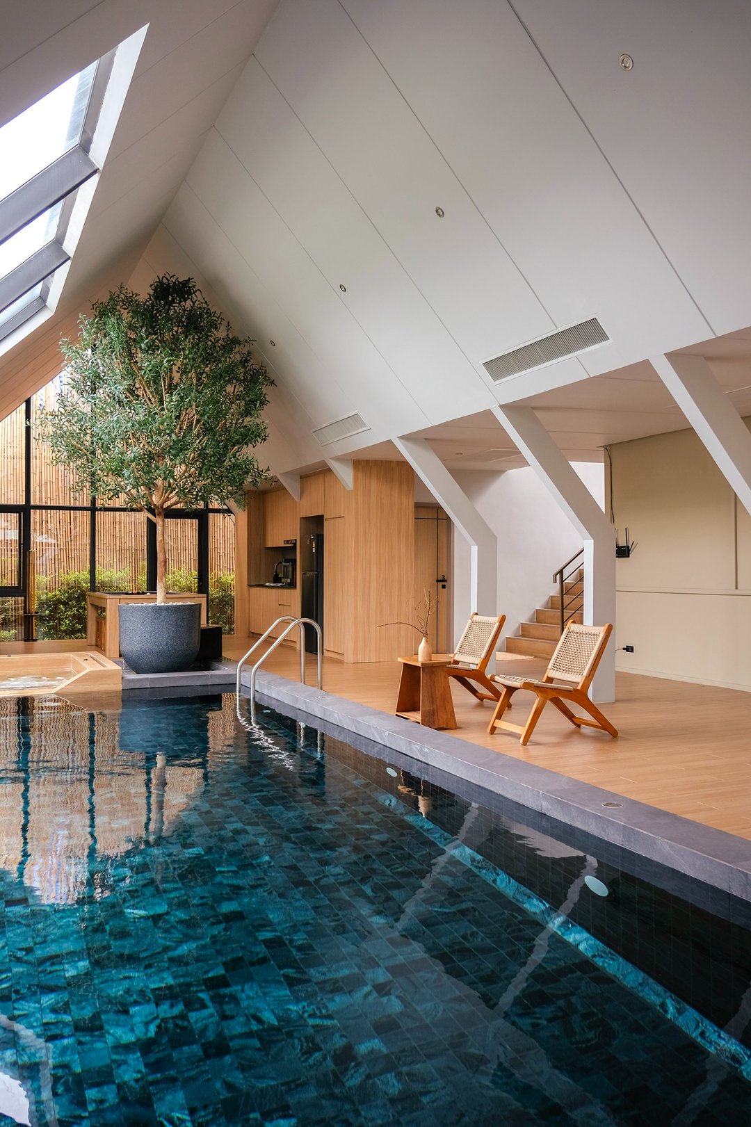 ภายในบ้านตกแต่งด้วยมู้ดโทนอบอุ่น รายล้อมด้วยวัสดุธรรมชาติที่ทำให้ทุกสัมผัสเบาสบาย สิ่งแรกที่ทำเราว้าวด้วยตาเนื้อเลยคือมุมสระออนเซ็นอุ่นในร่ม ที่ปรับอุณหภูมิได้ 37° พร้อมหลังคา Skylight Roof บานใหญ่ ที่สาดแสงธรรมชาติส่องลงมาแบบนุ่มๆ ทุกช่วงเวลาแช่น้ำได้ตั้งบ่ายยันเย็นก็ฟินสุดๆ หรือจะยืนทำคอนเท็นริมสระก็คือได้รูปเก๋กรุบแน่นอน อีกอย่างที่ประทับใจคือบรรยากาศภายในบ้านที่เชื่อมต่อถึงกันหมด ทั้งห้องนอน Pool Access, ห้องนั่งเล่น Double Space ที่มีเพดานสูงโปร่งถึง 6 เมตร, ครัว และโซนแช่ออนเซ็น — ทุกมุมออกแบบมาเพื่อการพักผ่อนอย่างแท้จริง บอกเลยว่าทำถึง เรียกว่าพักผ่อนแทบไม่ได้ออกไปไหนเลย แค่เปิดประตูก็ก้าวลงสระได้เลย